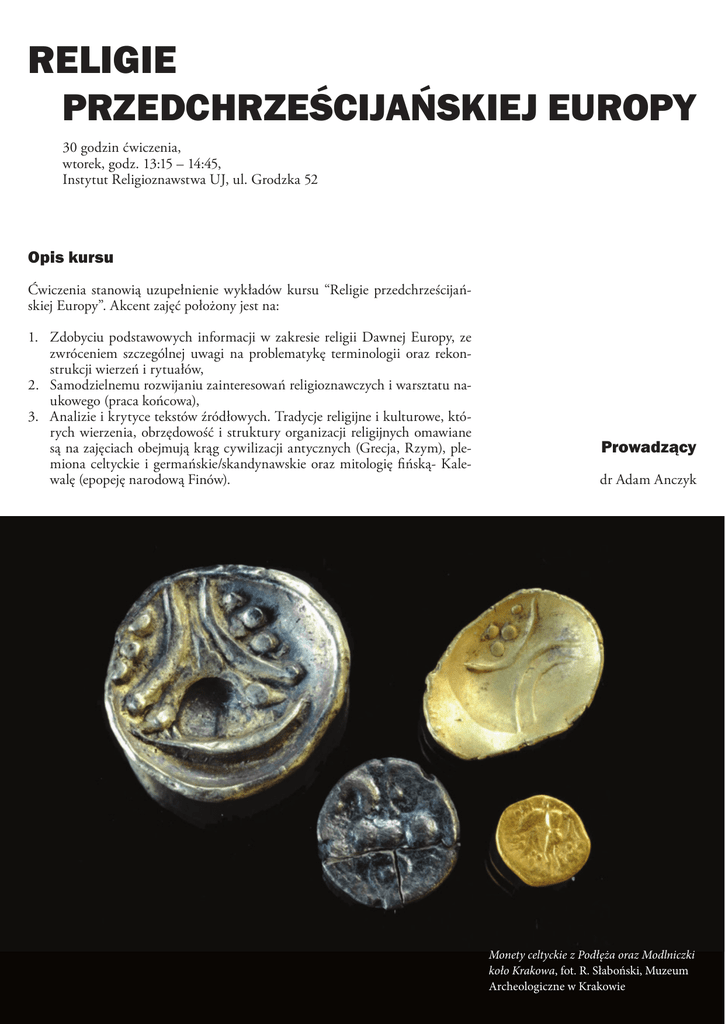 RELIGIE PRZEDCHRZEŚCIJAŃSKIEJ EUROPY 30 godzin ćwiczenia, wtorek, godz. 13:15 – 14:45, Instytut Religioznawstwa UJ, ul. Grodzka 52 Opis kursu Ćwiczenia stanowią uzupełnienie wykładów kursu “Religie przedchrześcijańskiej Europy”. Akcent zajęć położony jest na: 1. Zdobyciu podstawowych informacji w zakresie religii Dawnej Europy, ze zwróceniem szczególnej uwagi na problematykę terminologii oraz rekonstrukcji wierzeń i rytuałów, 2. Samodzielnemu rozwijaniu zainteresowań religioznawczych i warsztatu naukowego (praca końcowa), 3. Analizie i krytyce tekstów źródłowych. Tradycje religijne i kulturowe, których wierzenia, obrzędowość i struktury organizacji religijnych omawiane są na zajęciach obejmują krąg cywilizacji antycznych (Grecja, Rzym), plemiona celtyckie i germańskie/skandynawskie oraz mitologię fińską- Kalewalę (epopeję narodową Finów). Prowadzący dr Adam Anczyk Monety celtyckie z Podłęża oraz Modlniczki koło Krakowa, fot. R. Słaboński, Muzeum Archeologiczne w Krakowie Sprawy organizacyjne 1. Kryteria zaliczenia kursu. 1. Obecność i praca na zajęciach: 20 pkt.* 2. Zadanie „teksty źródłowe”: 20 pkt. 3. Praca końcowa lub Quiz: 60 pkt.** 2. Punktacja. Punkty zdobyte w trakcie kursu przeliczane są na oceny wg wzoru: 90 – 100 pkt. = 5.0 79 – 89 pkt. = 4.5 68 – 78 pkt. = 4.0 57 – 67 pkt. = 3.5 56 – 51 pkt. = 3.0 3. Zadanie „teksty źródłowe” – 20 pkt. Każdy uczestnik kursu wybiera 2 teksty źródłowe spośród podanych w spisie*** i dokonuje ich lektury ze zwróceniem szczególnej uwagi na wątki religioznawcze. Należy oddać pisemne podsumowanie lektury w formacie: 1. Okoliczności powstania, historia tekstu, ewentualnie informacje o autorze. 2. Uwagi do wybranych wątków religioznawczych (z cytacjami). Zadanie można oddawać systematycznie w trakcie semestru. 4. Praca końcowa – 60 pkt. Esej naukowy bądź praca empiryczna, ok. 20 - 40 tys. znaków (łącznie ze spacjami, przypisami i bibliografią), na wybrany temat, związany z problematyką kursu. Termin oddania – ostatnie zajęcia w semestrze (wersja drukowana). * Brak nieobecności lub 1 nieobecność = 10 pkt., 2 nieobecności = 5 pkt.; aktywność na zajęciach = 10 pkt. ** Formę zaliczenia każdy uczestnik/uczestniczka kursu wybiera in- dywidualnie (deklaracja do zajęć nr 5). Uwaga: osoby mające 3 lub więcej nieobecności, lub studiujące w trybie indywidualnym, zobowiązane są zarówno do napisania pracy końcowej jak też do zaliczenia quizu mitologicznego. *** Lista lektur do zadania „teksty źródłowe”: 1.Hezjod, Teogonia 2.Homer, Odyseja 3.Cyceron, O naturze bogów 4.Cyceron, O wróżbiarstwie 5. Snorri Sturluson, Edda prozaiczna 6. Edda poetycka 7. Pieśń o Nibelungach (przeł. R. Stiller, L. German, A. Lam etc.) 8. Mabinogion: cztery gałęzie 9. Mabinogion: pięć opowieści walijskich 10. Mabinogion: romanse arturiańskie 11. Táin czyli uprowadzenie stad z Cuailnge 12. Beowulf (tł. R. Stiller lub inne) 13. Saga o Njalu (tł. A. Załuska-Stromberg) 14. Saga o Völsungach 5. Quiz. Quiz mitologiczny obejmuje zakres lektur podstawowych podanych w sylabusie. Program kursu 1. Zajęcia wprowadzające: pojęcie „pogaństwa” i jego recepcja. M. Augé, Duch pogaństwa, Warszawa 2010, s. 49-89. 2. Wierzenia starożytnej Grecji w zarysie. L. B. Zaidman, Grecy i ich Bogowie, Warszawa 2008. 3. Klasyczna religia rzymska. A. Gillmeister, D. Musiał, W cieniu Kapitolu. Religia starożytnych Rzymian, Kraków 2012, s. 13-103. K. Banek, Religie Wschodu i Zachodu: wybór tekstów, rozdział Rzym (s. 184-193). Rome (2005-2007), HBO. Zadanie – praca w grupach. Grupy opracowują poszczególne wątki w lekturze: - życie rodzinne i religia domowa (s. 13-42), - święta wiejskie i uroczystości miejskie (s. 43-70), - pytania do bogów (s. 71-98), - po śmierci (s.117-140), - jak czcić bogów (s. 175-195). 4. Kulty misteryjne? W. Burkert, Starożytne kulty misteryjne, Bydgoszcz 2001, s. 33112. 5. Zmierzch pogaństwa i dialog międzyreligijny w starożytności. Lektura: P. Chuvin, Ostatni poganie, Warszawa 2008, s.72-175. 6. Zwyczaje religijne Słowian: źródła i problematyka rekonstrukcji. A. Gieysztor, Mitologia Słowian, Warszawa 1980 (lub nowsze wydania), s.44-137 - mitologia, s.59-186 - obrzędowość. A. Szyjewski, Religie Słowian, Kraków 2003, s. 5-25. 7. Tak blisko czy tak daleko? Mitologia bałtyjska. Zadanie. W lekturze wyszukać informacje na temat głównych bóstw i najważniejszych mitów np. mit o Saule. P. Suchocki, Mitologia bałtyjska, Warszawa 1991. 8. Religie starożytnych Celtów. A. Bartnik, Zarys wierzeń z plemion celtyckich, Kraków 2013, s. 81-159, s. 208-259, odpowiednie rozdziały. M. Green, The Gods of the Celts, London 1993, s. 39-199, lektura uzupełniająca. Zadanie – praca w grupach. Grupy opracowują poszczególne wątki mitologiczne: - kult Słońca i niebios, - płodność i boginie-matki, - wojna, śmierć i zaświaty, - bóstwa akwatyczne i uzdrawianie, - zwierzęta w religiach Celtów. 9. Druidzi. A. Anczyk, Druidzi i ofiary z ludzi- krótka historia mitu, „Przegląd religioznawczy”, 2012, 3 (245), s. 21-32. A. Anczyk, The Golden Sickle: An Introduction to Contemporary Druidry, Katowice 2014, s. 27-72. 10. Panteon bóstw skandynawskich. A. Szrejter, Mitologia germańska. Opowieści o bogach mroźnej Północy, Gdańsk 2006, s. 51-184. 11. Mitologia fińska. Kalewala, tł. J. Litwiniuk, Warszawa 1998 (znajomość fabuły). O. Vorren, E. Manker, Lapończycy, Warszawa 1980, rozdziały dotyczące religii. 12. Zajęcia terenowe – Muzeum Archeologiczne, Muzeum im. Czartoryskich.**** 13. Neopogaństwo. M. Strutyński, Neopogaństwo, Kraków 2014, s. 15-94. 14. Quiz mitologiczny. **** Strony www: http://www.ma.krakow.pl/ http://www.muzeum-czartoryskich.krakow.pl/