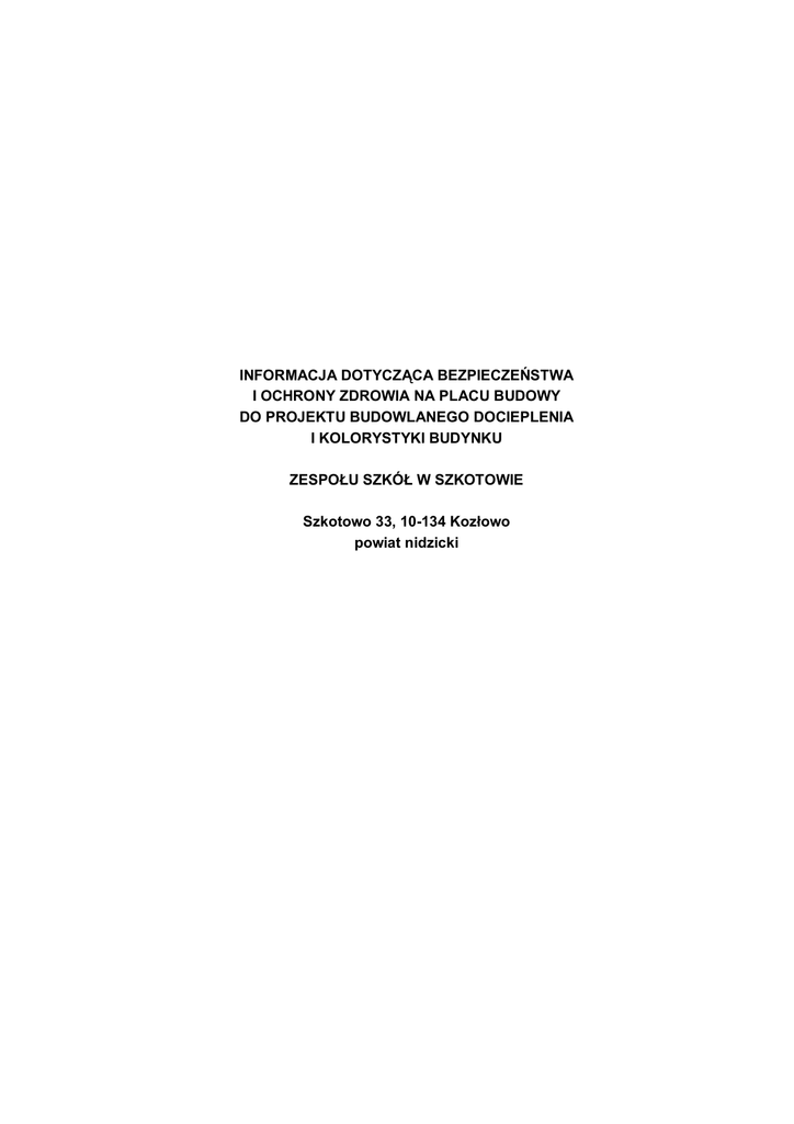 INFORMACJA DOTYCZĄCA BEZPIECZEŃSTWA I OCHRONY ZDROWIA NA PLACU BUDOWY DO PROJEKTU BUDOWLANEGO DOCIEPLENIA I KOLORYSTYKI BUDYNKU ZESPOŁU SZKÓŁ W SZKOTOWIE Szkotowo 33, 10-134 Kozłowo powiat nidzicki 2 Spis treści ZESPOŁU SZKÓŁ W SZKOTOWIE........................................................................................ 1 1. Zakres robót........................................................................................................................... 3 2. Wykaz istniejących obiektów budowlanych ............................................................................ 3 3. Elementy zagospodarowania działki lub terenu, które mogą stwarzać zagrożenie bezpieczeństwa i zdrowia ludzi .................................................................................................. 3 4. Przewidywane zagrożenia występujące podczas realizacji robót budowlanych ...................... 3 4.1. Zabezpieczenie placu budowy ......................................................................................... 3 4.2. Prace na wysokości ......................................................................................................... 4 4.3 Zalecenia ogólne............................................................................................................... 4 5. Instruktaż pracowników przed przystąpieniem do realizacji robót szczególnie niebezpiecznych......................................................................................................................... 5 6. Środki techniczne i organizacyjne zapobiegające niebezpieczeństwom wynikającym z wykonywania robót budowlanych. .............................................................................................. 6 3 1. Zakres robót Planowana inwestycja polega na wykonaniu termomodernizacji budynku Zespołu Szkół w Szkotowie, gmina Kozłowo. W zakres termomodernizacji wchodzi: Ø wykonanie docieplenia elewacji, Ø wykonanie docieplenia dachu, Ø wymiana stolarki drzwiowej i okiennej, Ø wymiana orynnowania i ślusarki Ø roboty remontowe na poddaszu, Ø budowa podjazdu dla osób niepełnosprawnych, Ø wykucie otworu drzwiowego. 2. Wykaz istniejących obiektów budowlanych Projektowana termomodernizacja wykonywana jest w obrębie elewacji i dachu budynku szkoły. Poza granicą działki szkoły znajdują się budynki mieszkalne jedno- i wielorodzinne. 3. Elementy zagospodarowania działki lub terenu, które mogą stwarzać zagrożenie bezpieczeństwa i zdrowia ludzi. Budynek otoczony jest z dwóch stron ulicami dojazdowymi. 4. Przewidywane zagrożenia występujące podczas realizacji robót budowlanych Charakterystyka tych zagrożeń przedstawia się następująco: - prace budowlane prowadzone będą na terenie dostępnym dla osób postronnych, a zatem istnieje konieczność zorganizowania placu budowy: • wygrodzenie terenu budowy, • urządzenie składowisk materiałów i wyrobów, • utrzymywanie porządku na placu budowy, • urządzenie pomieszczenia higieniczno-sanitarnego i socjalnego dla pracowników; - przy organizacji robót budowlanych należy zwrócić szczególną uwagę na: • wygrodzenie i zabezpieczenie miejsc niebezpiecznych, • zamontowanie napisów ostrzegawczych, • odpowiednie zabezpieczenia przed upadkiem pracowników wykonujących roboty na wysokości, • odpowiednie zabezpieczenie demontowanych lub montowanych elementów z wysokości, • drabiny i rusztowanie należy zabezpieczyć przed poślizgiem i rozsunięciem oraz zapewnić ich stabilność, • stanowiska pracy powinny umożliwiać swobodę ruchu niezbędną do wykonywania pracy, • maszyny i inne urządzenia techniczne oraz narzędzia zmechanizowane powinny być montowane, eksploatowane i obsługiwane zgodnie z instrukcją producenta oraz spełniać wymagania określone w przepisach dotyczących systemu oceny zgodności. 4.1. Zabezpieczenie placu budowy Charakterystyka placu budowy: • teren budowy lub robót powinien być w miarę potrzeby zabezpieczony ogrodzeniem; • ogrodzenie placu budowy powinno być tak wykonane, aby nie stwarzało zagrożenia dla ludzi; 4 • • • • strefę niebezpieczną (miejsca niebezpieczne), w której istnieje źródło zagrożenia, np. z powodu możliwości upadku z góry przedmiotów lub materiałów, należy oznakować i ogrodzić poręczami bądź zabezpieczyć daszkami ochronnymi, strefa niebezpieczna nie może wynosić mniej niż 1/10 wysokości, z której mogą spadać przedmioty lub materiały jednak nie mniej niż 6 m; daszki ochronne powinny znajdować się na wysokości nie mniejszej niż 2,4 m od terenu i ze spadkiem 45° w kierunku źródła zagrożenia, pokrycie daszków powinno być szczelne i dostatecznie wytrzymałe na przebicie przez spadające przedmioty, używanie daszków ochronnych jako rusztowań lub miejsc składowania narzędzi, sprzętu, materiałów itp. jest zabronione, w miejscach przejść i przejazdów szerokość daszka ochronnego powinna wynosić co najmniej o 1 m więcej niż szerokość przejścia lub przejazdu; przejścia i miejsca niebezpieczne powinny być oznakowane znakami ostrzegawczymi lub znakami zakazu oraz dobrze oświetlone; na placu budowy powinny być wyznaczone miejsca do składowania materiałów. 4.2. Prace na wysokości Charakterystyka prac na wysokościach: • rusztowania powinny: posiadać pomost o powierzchni roboczej wystarczającej dla zatrudnionych oraz składowania narzędzi i niezbędnej ilości materiałów, posiadać konstrukcję dostosowana do przeniesienia działających obciążeń, zapewniać bezpieczną komunikację pionową i swobodny dostęp do stanowisk pracy, stwarzać możliwość wykonywania pracy w pozycji nie powodującej nadmiernego wysiłku; • rusztowania typowe powinny być wykonane zgodnie z wymaganiami norm, rusztowania nietypowe powinny być wykonane zgodnie z projektem, rusztowania inwentaryzowane powinny być zaopatrzone w atest wytwórni, a ich montaż powinien