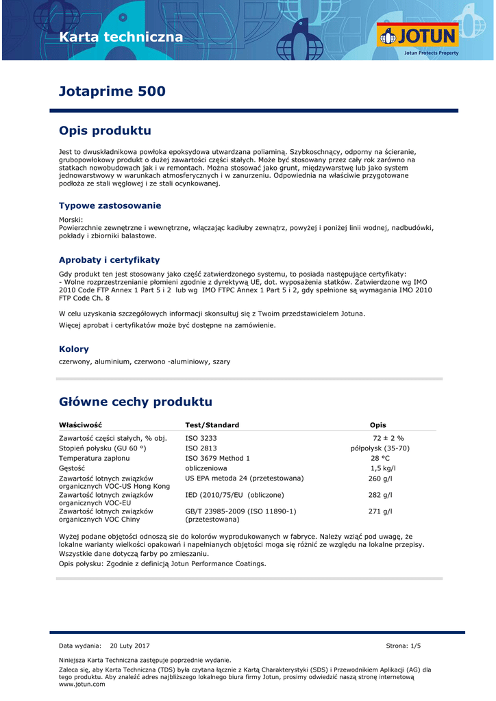 Karta techniczna Approved 18820;18840;14100;14260 2 14100 epoksy ^(ValidationDate) Jotaprime 500 Opis produktu Jest to dwuskładnikowa powłoka epoksydowa utwardzana poliaminą. Szybkoschnący, odporny na ścieranie, grubopowłokowy produkt o dużej zawartości części stałych. Może być stosowany przez cały rok zarówno na statkach nowobudowach jak i w remontach. Można stosować jako grunt, międzywarstwę lub jako system jednowarstwowy w warunkach atmosferycznych i w zanurzeniu. Odpowiednia na właściwie przygotowane podłoża ze stali węglowej i ze stali ocynkowanej. Typowe zastosowanie Morski: Powierzchnie zewnętrzne i wewnętrzne, włączając kadłuby zewnątrz, powyżej i poniżej linii wodnej, nadbudówki, pokłady i zbiorniki balastowe. Inne Aprobaty i certyfikaty Gdy produkt ten jest stosowany jako część zatwierdzonego systemu, to posiada następujące certyfikaty: - Wolne rozprzestrzenianie płomieni zgodnie z dyrektywą UE, dot. wyposażenia statków. Zatwierdzone wg IMO 2010 Code FTP Annex 1 Part 5 i 2 lub wg IMO FTPC Annex 1 Part 5 i 2, gdy spełnione są wymagania IMO 2010 FTP Code Ch. 8 W celu uzyskania szczegółowych informacji skonsultuj się z Twoim przedstawicielem Jotuna. Więcej aprobat i certyfikatów może być dostępne na zamówienie. Kolory czerwony, aluminium, czerwono -aluminiowy, szary Główne cechy produktu Właściwość Test/Standard Opis Zawartość części stałych, % obj. ISO 3233 Stopień połysku (GU 60 °) ISO 2813 Temperatura zapłonu Gęstość ISO 3679 Method 1 obliczeniowa Zawartość lotnych związków organicznych VOC-US Hong Kong Zawartość lotnych związków organicznych VOC-EU Zawartość lotnych związków organicznych VOC Chiny US EPA metoda 24 (przetestowana) 260 g/l IED (2010/75/EU (obliczone) 282 g/l GB/T 23985-2009 (ISO 11890-1) (przetestowana) 271 g/l 72 ± 2 % półpołysk (35-70) 28 °C 1,5 kg/l Wyżej podane objętości odnoszą sie do kolorów wyprodukowanych w fabryce. Należy wziąć pod uwagę, że lokalne warianty wielkości opakowań i napełnianych objętości moga się różnić ze względu na lokalne przepisy. Wszystkie dane dotyczą farby po zmieszaniu. Opis połysku: Zgodnie z definicją Jotun Performance Coatings. Data wydania: 20 Luty 2017 Strona: 1/5 Niniejsza Karta Techniczna zastępuje poprzednie wydanie. Zaleca się, aby Karta Techniczna (TDS) była czytana łącznie z Kartą Charakterystyki (SDS) i Przewodnikiem Aplikacji (AG) dla tego produktu. Aby znaleźć adres najbliższego lokalnego biura firmy Jotun, prosimy odwiedzić naszą stronę internetową www.jotun.com 1 Karta techniczna Jotaprime 500 Grubość jednej powłoki Typowy zalecany zakres specyfikowania grubości Grubość powłoki na sucho 100 - 200 µm Grubość powłoki na mokro 140 - 280 µm Wydajność teoretyczna 7,2 3,6 - m²/l Przygotowanie podłoża Aby zapewnić trwałą przyczepność do kolejnego produktu, wszystkie powierzchnie powinny być czyste, suche i wolne od wszelkich zanieczyszczeń. Przygotowanie powierzchni - tabela zbiorcza Przygotowanie podłoża Podłoże Minimum Zalecane Stal węglowa St 2 (ISO 8501-1) Sa 2½ (ISO 8501-1) Stal ocynkowana Powierzchnia powinna być czysta, sucha o chropowatym i matowym profilu. Oczyszczone wykończenie powierzchni przy użyciu niemetelicznego ścierniwa, tworzące czyste, chropowate i równomierne podłoże. Powierzchnie pokryte Czysta, sucha i nieuszkodzona, kompatybilna powłoka (ISO 12944-4 6.1) Czysta, sucha i nieuszkodzona, kompatybilna powłoka (ISO 12944-4 6.1) Aplikacja Metody stosowania Produkt może być nałożony przy pomocy Natrysk: Stosować natrysk bezpowietrzny. Pędzel: Zalecany do niewielkich powierzchni oraz do wyrabiania krawędzi, spawów i miejsc trudnodostępnych. Należy zwrócić uwagę, aby osiągnąć specyfikowaną grubość powłoki. Wałek: Może być stosowany. Należy zwrócić uwagę, aby osiągnąć specyfikowaną grubość powłoki. Proporcje mieszania produktu (obj.) Jotaprime 500 Comp A Jotaprime 500 Comp B Data wydania: 20 Luty 2017 4 część(i) 1 część(i) Strona: 2/5 Niniejsza Karta Techniczna zastępuje poprzednie wydanie. Zaleca się, aby Karta Techniczna (TDS) była czytana łącznie z Kartą Charakterystyki (SDS) i Przewodnikiem Aplikacji (AG) dla tego produktu. Aby znaleźć adres najbliższego lokalnego biura firmy Jotun, prosimy odwiedzić naszą stronę internetową www.jotun.com Karta techniczna Jotaprime 500 Rozcieńczalnik/Zmywacz Rozcieńczalnik: Jotun Thinner No. 17 Wytyczne dane dla natrysku bezpowietrznego Dysza (inch/1000): 17-23 Ciśnienie w dyszy (minimum): 150 bar/2100 psi Czas schnięcia i utwardzania Temperatura podłoża -5 °C 0 °C 5 °C 10 °C 23 °C 40 °C 20 h 48 h 48 h 14 h 30 h 30 h 6h 16 h 16 h 4h 10 h 10 h 2h 4h 4h 1h 2h 2h 30 d 21 d 14 d 10 d 7d 3d Pyłosuchość Chodzenie po wyschniętym Czas schnięcia do przemalowania, minimum Schnięcie/utwardzenie do eksploatacji Czasy schnięcia i utwardzania określa się w kontrolowanych temperaturach i wilgotności względnej poniżej 85 % oraz przy średnim zakresie grubości suchej powłoki (DFT) dla produktu. Powierzchnia sucha (na dotyk): stan schnięcia, gdy niewielki nacisk palcem nie pozostawia odcisku lub nie ujawnia kleistości. Chodzenie po wyschniętym: minimalny czas, po którym powłoka może tolerować normalny ruch pieszy bez trwałych śladów, odcisków i innych uszkodzeń fizycznych. Czas schnięcia do przemalowania, minimum: najkrótszy dopuszczalny czas, po którym może być nakładana następna warstwa. Schnięcie/utwardzenie do eksploatacji: minimalny czas przed stałą ekspozycją powłoki w przeznaczonym środowisku/ośrodku. Czas indukcji i okres przydatności do stosowania Temperatura farby 23 °C Czas przydatności do stosowania 1h Odporność na wysoką temperaturę Temperatura Ciągła Suchy, atmosferyczny Zanurzony, woda morska Data wydania: 20 Luty 2017 Wartość szczytowa 120 °C 140 °C 50 °C 60 °C Strona: 3/5 Niniejsza Karta Tech