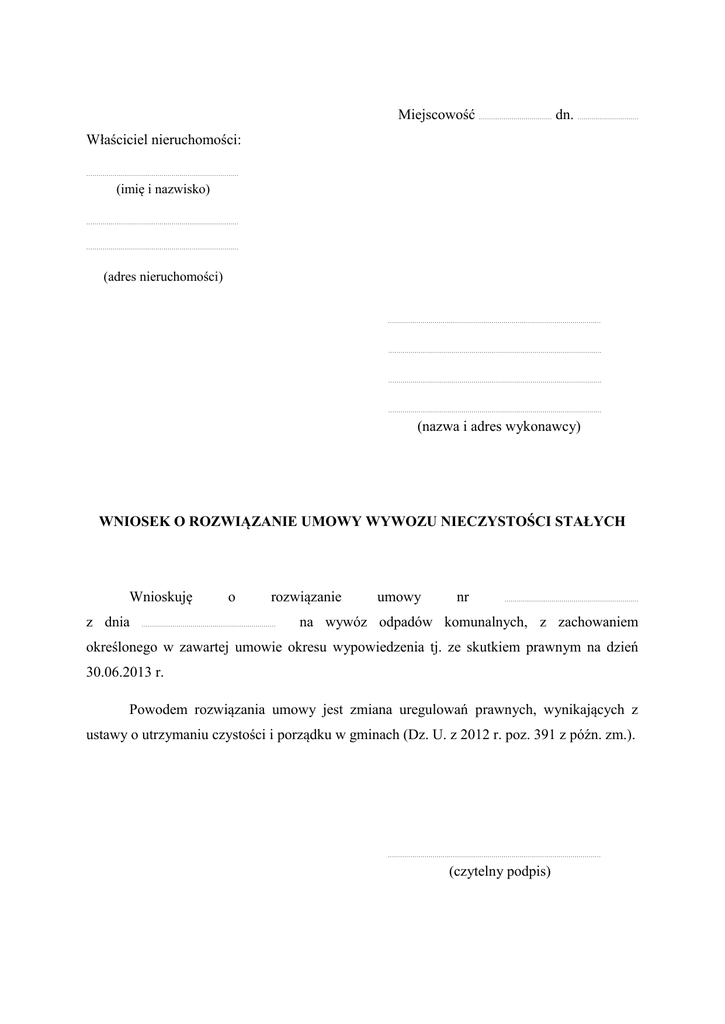 Miejscowość ……………………………… dn. ………………………… Właściciel nieruchomości: ………………………………………………………………… (imię i nazwisko) ………………………………………………………………… ………………………………………………………………… (adres nieruchomości) …………………………………………………………………………………………… …………………………………………………………………………………………… …………………………………………………………………………………………… …………………………………………………………………………………………… (nazwa i adres wykonawcy) WNIOSEK O ROZWIĄZANIE UMOWY WYWOZU NIECZYSTOŚCI STAŁYCH Wnioskuję z dnia o rozwiązanie ………………………………………………………… umowy nr ………………………………………………………… na wywóz odpadów komunalnych, z zachowaniem określonego w zawartej umowie okresu wypowiedzenia tj. ze skutkiem prawnym na dzień 30.06.2013 r. Powodem rozwiązania umowy jest zmiana uregulowań prawnych, wynikających z ustawy o utrzymaniu czystości i porządku w gminach (Dz. U. z 2012 r. poz. 391 z późn. zm.). …………………………………………………………………………………………… (czytelny podpis)