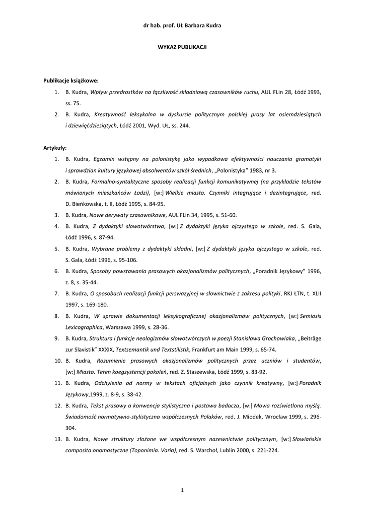 Publikacje dr hab. prof. UŁ Barbary Kudry