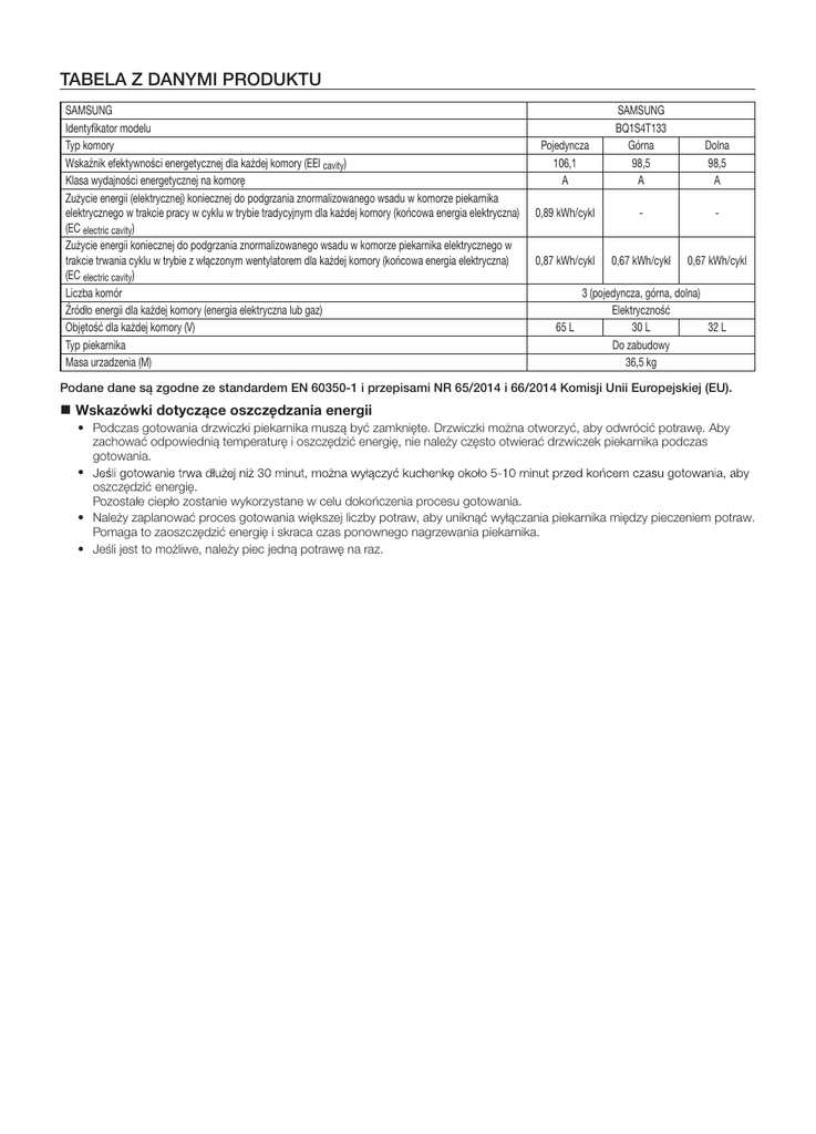 TABELA Z DANYMI PRODUKTU SAMSUNG Identyfikator modelu Typ komory Wskaźnik efektywności energetycznej dla każdej komory (EEI cavity) Klasa wydajności energetycznej na komorę Zużycie energii (elektrycznej) koniecznej do podgrzania znormalizowanego wsadu w komorze piekarnika elektrycznego w trakcie pracy w cyklu w trybie tradycyjnym dla każdej komory (końcowa energia elektryczna) (EC electric cavity) Zużycie energii koniecznej do podgrzania znormalizowanego wsadu w komorze piekarnika elektrycznego w trakcie trwania cyklu w trybie z włączonym wentylatorem dla każdej komory (końcowa energia elektryczna) (EC electric cavity) Liczba komór Źródło energii dla każdej komory (energia elektryczna lub gaz) Objętość dla każdej komory (V) Typ piekarnika Masa urzadzenia (M) Pojedyncza 106,1 A SAMSUNG BQ1S4T133 Górna 98,5 A Dolna 98,5 A 0,89 kWh/cykl - - 0,87 kWh/cykl 0,67 kWh/cykl 0,67 kWh/cykl 3 (pojedyncza, górna, dolna) Elektryczność 65 L 30 L 32 L Do zabudowy 36,5 kg Podane dane są zgodne ze standardem EN 60350-1 i przepisami NR 65/2014 i 66/2014 Komisji Unii Europejskiej (EU). Wskazówki dotyczące oszczędzania energii • Podczas gotowania drzwiczki piekarnika muszą być zamknięte. Drzwiczki można otworzyć, aby odwrócić potrawę. Aby zachować odpowiednią temperaturę i oszczędzić energię, nie należy często otwierać drzwiczek piekarnika podczas gotowania. • oszczędzić energię. Pozostałe ciepło zostanie wykorzystane w celu dokończenia procesu gotowania. • Należy zaplanować proces gotowania większej liczby potraw, aby uniknąć wyłączania piekarnika między pieczeniem potraw. Pomaga to zaoszczędzić energię i skraca czas ponownego nagrzewania piekarnika. • Jeśli jest to możliwe, należy piec jedną potrawę na raz.