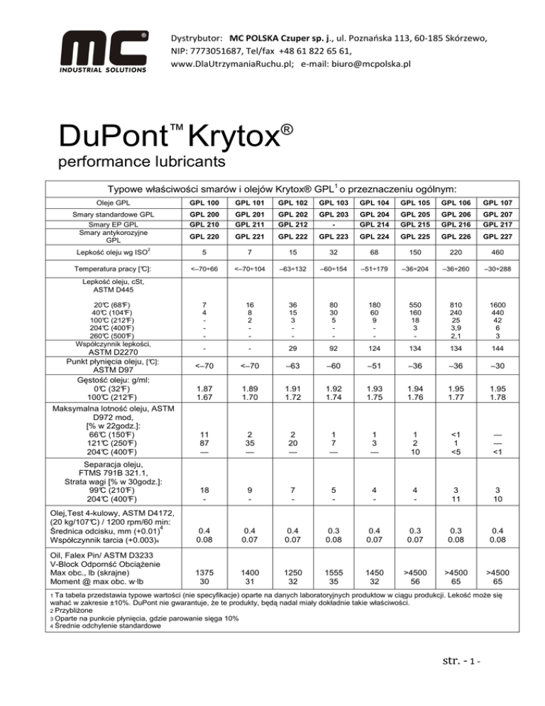 Dystrybutor: MC POLSKA Czuper sp. j., ul. Poznańska 113, 60-185 Skórzewo, NIP: 7773051687, Tel/fax +48 61 822 65 61, www.DlaUtrzymaniaRuchu.pl; e-mail: [email protected] DuPont™ Krytox® performance lubricants Typowe właściwości smarów i olejów Krytox® GPL1 o przeznaczeniu ogólnym: Oleje GPL GPL 100 GPL 101 GPL 102 GPL 103 GPL 104 GPL 105 GPL 106 GPL 107 Smary standardowe GPL Smary EP GPL Smary antykorozyjne GPL GPL 200 GPL 210 GPL 201 GPL 211 GPL 202 GPL 212 GPL 203 - GPL 204 GPL 214 GPL 205 GPL 215 GPL 206 GPL 216 GPL 207 GPL 217 GPL 220 GPL 221 GPL 222 GPL 223 GPL 224 GPL 225 GPL 226 GPL 227 Lepkość oleju wg ISO 5 7 15 32 68 150 220 460 Temperatura pracy [°C]: <–70÷66 <–70÷104 –63÷132 –60÷154 –51÷179 –36÷204 –36÷260 –30÷288 7 4 - 16 8 2 - 36 15 3 - 80 30 5 - 180 60 9 - 550 160 18 3 - 810 240 25 3,9 2,1 1600 440 42 6 3 - - 29 92 124 134 134 144 <–70 <–70 –63 –60 –51 –36 –36 –30 1.87 1.67 1.89 1.70 1.91 1.72 1.92 1.74 1.93 1.75 1.94 1.76 1.95 1.77 1.95 1.78 11 87 — 2 35 — 2 20 — 1 7 — 1 3 — 1 2 10 <1 1 <5 — — <1 Separacja oleju, FTMS 791B 321.1, Strata wagi [% w 30godz.]: 99°C (210°F) 204°C (400°F) 18 - 9 - 7 - 5 - 4 - 4 - 3 11 3 10 Olej,Test 4-kulowy, ASTM D4172, (20 kg/107°C) / 1200 rpm/60 min: 4 Średnica odcisku, mm (+0.01) Współczynnik tarcia (+0.003)4 0.4 0.08 0.4 0.07 0.4 0.07 0.3 0.08 0.4 0.07 0.3 0.07 0.3 0.08 0.4 0.08 Oil, Falex Pin/ ASTM D3233 V-Block Odpornść ObciąŜenie Max obc., lb (skrajne) Moment @ max obc. w·lb 1375 30 1400 31 1250 32 1555 35 1450 32 >4500 56 >4500 65 >4500 65 2 Lepkość oleju, cSt, ASTM D445 20°C (68°F) 40°C (104°F) 100°C (212°F) 204°C (400°F) 260°C (500°F) Współczynnik lepkości, ASTM D2270 Punkt płynięcia oleju, [°C]: ASTM D97 Gęstość oleju: g/ml: 0°C (32°F) 100°C (212°F) Maksymalna lotność oleju, ASTM D972 mod, [% w 22godz.]: 66°C (150°F) 121°C (250°F) 204°C (400°F) 1 Ta tabela przedstawia typowe wartości (nie specyfikacje) oparte na danych laboratoryjnych produktow w ciągu produkcji. Lekość moŜe się wahać w zakresie ±10%. DuPont nie gwarantuje, Ŝe te produkty, będą nadal miały dokładnie takie właściwości. 2 PrzybliŜone 3 Oparte na punkcie płynięcia, gdzie parowanie sięga 10% 4 Średnie odchylenie standardowe str. - 1 - Dystrybutor: MC POLSKA Czuper sp. j., ul. Poznańska 113, 60-185 Skórzewo, NIP: 7773051687, Tel/fax +48 61 822 65 61, www.DlaUtrzymaniaRuchu.pl; e-mail: [email protected] ™ DuPont Krytox ® performance lubricants Oleje Krytox® GPL 100–107 są czyste, bezbarwne, fluorowe oleje syntetyczne nie reagują, są stabilne, niepalne, bezpiecznie stabilne podczas pracy w środowisku chemicznym i tlenowym i długowieczne (bardzo wydłuŜona Ŝywotność). Krytox® jest perfluoropolieterem (PFPE) – równieŜ zwanym perfluoro-alkyleterem (PFAE) lub perfluoropolialkyleterem (PFPAE) – z następującą strukturą chemiczną: gdzie n=10-60 Łańcuch polimerowy jest całkowicie nasycony i zawiera tylko węgiel, tlen i fluor. Wagowo typowy olej Krytox® zawiera 21.6% węgla, 9.4% tlenu i 69.0% fluoru. Wszystkie standardowe rodzaje smarów GPL są zagęszczone teflonem Krytox® 2000 polytetrafluoroetylenem (PTFE), o formule (CF2-CF2)n. Ten specjalny, wydajny zagęszczacz posiada punkt kroplenia przy 325°C (617°F) i posiada małą wagę molekularną o mikronowym rozmiarze cząsteczki (0.2 m) dla większej wydajności w łoŜyskach. Smary Krytox® GPL 200 ÷ 207 są smarami białymi z tymi samymi właściwościami jak oleje GPL 100–107, których są wyprodukowane, ale są w postacie smaru. Smary EP Krytox® GPL 210 ÷ 217 EP są czarne i zawierają dodatkowo 5% dwusiarczku molibdenu jako dodatek wysokociśnieniowy EP do bardzo obciąŜonych zębów i łoŜysk. Smary antykorozyjne Krytox® GPL 220 ÷ 227 są smarami białymi, które zawierają 2% azotynu sodu. Te smary zapewniają dodatkową ochronę antykorozyjną w wilgotnym środowisku i wysokich temperaturach oraz ochronę przeciwzuŜyciową. Dodatki do smarów mogą mieć wpływ na odporność chemiczną smarów. NLGI 2 jest standardową klasą lepkościową, penetracja (265 ÷ 295). Na specjalne Ŝyczenie moŜliwe są teŜ klasy NLGI bardziej miękkie lub bardziej twarde. Dla zastosowań powyŜej punktu kroplenia standardowego zagęszczacza PTFE powyŜej 325°C (617°F) zaleca si ę smary z zagęszczaczem krzemionkowym, nietopliwym. str. - 2 -