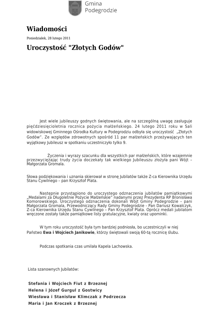 Wiadomości Poniedziałek, 28 lutego 2011 Uroczystość "Złotych Godów" Jest wiele jubileuszy godnych świętowania, ale na szczególną uwagę zasługuje pięćdziesięcioletnia rocznica pożycia małżeńskiego. 24 lutego 2011 roku w Sali widowiskowej Gminnego Ośrodka Kultury w Podegrodziu odbyła się uroczystość „Złotych Godów”. Ze względów zdrowotnych spośród 11 par małżeńskich przeżywających ten wyjątkowy Jubileusz w spotkaniu uczestniczyło tylko 9. Życzenia i wyrazy szacunku dla wszystkich par małżeńskich, które wzajemnie przezwyciężając trudy życia doczekały tak wielkiego Jubileuszu złożyła pani Wójt – Małgorzata Gromala. Słowa podziękowania i uznania skierował w stronę Jubilatów także Z-ca Kierownika Urzędu Stanu Cywilnego – pan Krzysztof Plata. Następnie przystąpiono do uroczystego odznaczenia jubilatów pamiątkowymi „Medalami za Długoletnie Pożycie Małżeńskie” nadanymi przez Prezydenta RP Bronisława Komorowskiego. Uroczystego odznaczenia dokonali Wójt Gminy Podegrodzie – pani Małgorzata Gromala, Przewodniczący Rady Gminy Podegrodzie - Pan Dariusz Kowalczyk, Z-ca Kierownika Urzędu Stanu Cywilnego – Pan Krzysztof Plata. Oprócz medali jubilatom wręczone zostały także pamiątkowe listy gratulacyjne, kwiaty oraz upominki. W tym roku uroczystość była tym bardziej podniosła, bo uczestniczyli w niej Państwo Ewa i Wojciech Janikowie, którzy świętowali swoją 60-tą rocznicę ślubu. Podczas spotkania czas umilała Kapela Lachowska. Lista szanownych Jubilatów: Stefania i Wojciech Fiut z Brzeznej Helena i Józef Gurgul z Gostwicy Wiesława i Stanisław Klimczak z Podrzecza Maria i Jan Kroczek z Brzeznej Anna i Józef Olszak ze Stadeł Rozalia i Tadeusz Plata z Długołęki – Świerkli Zofia i Stanisław Popardowscy z Brzeznej Ludwika i Czesław Szewczyk z Długołęki – Świerkli Stanisława i Stanisław Zarabscy z Długołęki – Świerkli Honorata i Józef Zielińscy z Gostwicy Krystyna i Stanisław Zwolińscy z Gostwicy Zobacz galerię zdjęć