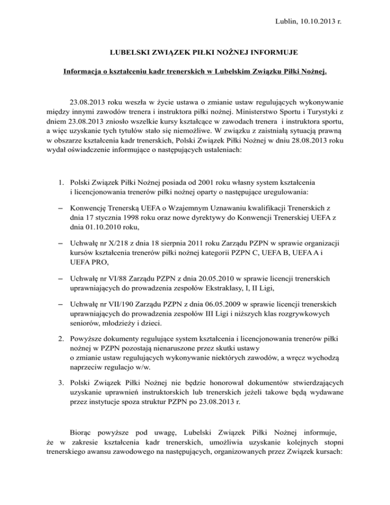 Lublin, 10.10.2013 r. LUBELSKI ZWIĄZEK PIŁKI NOŻNEJ INFORMUJE Informacja o kształceniu kadr trenerskich w Lubelskim Związku Piłki Nożnej. 23.08.2013 roku weszła w życie ustawa o zmianie ustaw regulujących wykonywanie między innymi zawodów trenera i instruktora piłki nożnej. Ministerstwo Sportu i Turystyki z dniem 23.08.2013 zniosło wszelkie kursy kształcące w zawodach trenera i instruktora sportu, a więc uzyskanie tych tytułów stało się niemożliwe. W związku z zaistniałą sytuacją prawną w obszarze kształcenia kadr trenerskich, Polski Związek Piłki Nożnej w dniu 28.08.2013 roku wydał oświadczenie informujące o następujących ustaleniach: 1. Polski Związek Piłki Nożnej posiada od 2001 roku własny system kształcenia i licencjonowania trenerów piłki nożnej oparty o następujące uregulowania: – Konwencję Trenerską UEFA o Wzajemnym Uznawaniu kwalifikacji Trenerskich z dnia 17 stycznia 1998 roku oraz nowe dyrektywy do Konwencji Trenerskiej UEFA z dnia 01.10.2010 roku, – Uchwałę nr X/218 z dnia 18 sierpnia 2011 roku Zarządu PZPN w sprawie organizacji kursów kształcenia trenerów piłki nożnej kategorii PZPN C, UEFA B, UEFA A i UEFA PRO, – Uchwałę nr VI/88 Zarządu PZPN z dnia 20.05.2010 w sprawie licencji trenerskich uprawniających do prowadzenia zespołów Ekstraklasy, I, II Ligi, – Uchwałę nr VII/190 Zarządu PZPN z dnia 06.05.2009 w sprawie licencji trenerskich uprawniających do prowadzenia zespołów III Ligi i niższych klas rozgrywkowych seniorów, młodzieży i dzieci. 2. Powyższe dokumenty regulujące system kształcenia i licencjonowania trenerów piłki nożnej w PZPN pozostają nienaruszone przez skutki ustawy o zmianie ustaw regulujących wykonywanie niektórych zawodów, a wręcz wychodzą naprzeciw regulacjo w/w. 3. Polski Związek Piłki Nożnej nie będzie honorował dokumentów stwierdzających uzyskanie uprawnień instruktorskich lub trenerskich jeżeli takowe będą wydawane przez instytucje spoza struktur PZPN po 23.08.2013 r. Biorąc powyższe pod uwagę, Lubelski Związek Piłki Nożnej informuje, że w zakresie kształcenia kadr trenerskich, umożliwia uzyskanie kolejnych stopni trenerskiego awansu zawodowego na następujących, organizowanych przez Związek kursach: 1. Kurs Trenerów PZPN C Kryteria przyjęcia na kurs trenerów PZPN C 1. Kandydatem na kurs trenerów PZPN C może być osoba, która spełnia następujące kryteria: 1.1 ma ukończone 18 lat, 1.2 jest absolwentem szkoły / uczelni o kierunku sportowym lub nauczycielskim, lub legitymuje się stażem zawodniczym w rozgrywkach OZPN / ZPN dowolnego szczebla, potwierdzonym opinią wystawioną przez macierzysty Związek Piłki Nożnej. 1.3 przedstawi zaświadczenie wystawione przez lekarza o stanie zdrowia pozwalającym na wykonywanie zawodu trenera piłki nożnej i uczestnictwo w kursie, 1.4 złoży oświadczenie o niekaralności sądowej i pełnej zdolności do czynności prawnych. 2. Kurs Trenerów UEFA B i Wyrównawczy UEFA B Kryteria przyjęć na kurs trenerów UEFA B, Kurs Wyrównawczy UEFA B 1. Kandydatem na kurs trenerów UEFA B może być osoba, która spełnia następujące kryteria: 1.1 ma ukończone 18 lat, 1.2 posiada dyplom Trenera PZPN C lub złożyła deklarację uczestnictwa w zintegrowanym kursie Trenera UEFA B, 1.3 przedstawi zaświadczenie wystawione przez lekarza o stanie zdrowia pozwalającym na wykonywanie zawodu trenera piłki nożnej i uczestnictwo w kursie, 1.4 złoży oświadczenie o niekaralności sądowej i pełnej zdolności do czynności prawnych. 2. Kandydatem na kurs wyrównawczy UEFA B może być osoba, która spełnia następujące kryteria: 2.1 posiada legitymację instruktora piłki nożnej, 2.2 przedstawi zaświadczenie wystawione przez pracodawcę stwierdzające minimum jednoroczny staż pracy z dziećmi do 12 lat. 2.3 spełnia kryteria zawarte w ust. 1.3 i 1.4 niniejszego paragrafu. 3. Kurs Trenerów UEFA A Kryteria przyjęcia na kurs UEFA A: 1. Kandydatem na kurs trenerów UEFA A może być osoba, która spełnia następujące kryteria: 1.1 posiada dyplom UEFA B, 1.2 ma ukończone 21 lat, 1.3 posiada wykształcenie średnie, 1.4 posiada udokumentowany co najmniej 2 letni staż pracy z tytułem trenera UEFA B, lub legitymuje się poświadczonym minimum 7 letnim stażem zawodniczym w Ekstraklasie, jeżeli nie posiada dyplomu trenera UEFA B, 1.5 przedstawi opinie o przebiegu pracy szkoleniowej wystawione przez pracodawcę i macierzysty Związek Piłki Nożnej, z wyłączeniem z tego obowiązku kandydatów spełniających wymogi 7-letniego stażu zawodniczego w Ekstraklasie, 1.6 przedstawi zaświadczenia o uczestnictwie w konferencjach szkoleniowych organizowanych przez macierzysty Związek Piłki Nożnej, z wyłączeniem z tego obowiązku kandydatów spełniających wymogi 7-letniego stażu zawodniczego w Ekstraklasie, 1.7 przedstawi dokument poświadczony przez lekarza pozwalający na podjęcie zajęć praktycznych na kursie trenerskim, 1.8 złoży oświadczenie o niekaralności sądowej i pełnej zdolności do czynności prawnych, 1.9 pomyślnie zaliczy egzamin wstępny składający się z części praktycznej i teoretycznej. Ukończenie kursu i zdobycie tytułu zawodowego pozwoli na uzyskanie licencji upoważniającej do prowadzenia zespołów na następujących poziomach rozgrywek piłkarskich: Trener PZPN C – licencja PZPN B młodzieżowa, drużyny młodzieżowe do 12 lat. Trener UEFA B – licencja PZPN B: seniorzy V liga (klasa Okręgowa) i niższe, drużyny młodzieżowe w ligach/klasach z wyłączeniem Centralnej Ligi Juniorów, Ligi Makroregionalnej Juniorów Starszych oraz I Ligi Wojewódzkiej Juniorów Starszych i I Ligi Wojewódzkiej Juniorów Młodszych. Trener UEFA A – licencja A: seniorzy III liga, IV Liga i niższe klasy rozgrywkowe, wszystkie grupy młodzieżowe. Dotychczasowe uzyskane tytuły do 23.08.2013 r. przez szkoleniowców: instruktor w dyscyplinie sportu piłka nożna, trener pił