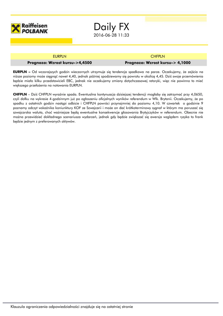 Daily FX 2016-06-28 11:33 EURPLN CHFPLN Prognoza: Wzrost kursu->4,4500 Prognoza: Wzrost kursu-> 4,1000 EURPLN – Od wczorajszych godzin wieczornych utrzymuje się tendencja spadkowa na parze. Oczekujemy, że zejścia na niższe poziomy może sięgnąć nawet 4,40, jednak później spodziewamy się powrotu w okolicę 4,45. Dziś swoje przemówienia będzie miało kilku przedstawicieli EBC, jednak nie oczekujemy zmiany dotychczasowej retoryki, więc nie powinno to mieć większego przełożenia na notowania EURPLN. CHFPLN – Dziś CHFPLN wyraźnie spada. Ewentualna kontynuacja dzisiejszej tendencji mogłaby się zatrzymać przy 4,0650, czyli dołku na wykresie 4-godzinnym już po ogłoszeniu oficjalnych wyników referendum w Wlk. Brytanii. Oczekujemy, że po spadku z ostatnich godzin nastąpi odbicie i CHFPLN powróci przynajmniej do poziomu 4,10. W czwartek o godzinie 9 poznamy odczyt wskaźnika koniunktury KOF ze Szwajcarii i może on dać krótkoterminowy sygnał w którym ma poruszać się szwajcarska waluta, choć ważniejsze będą ewentualne konsekwencje głosowania Brytyjczyków w referendum. Obecnie nie można przewidzieć dokładnego scenariusza wydarzeń, jednak gdy będzie zwiększać się awersja względem ryzyka to frank będzie jednym z preferowanych aktywów. Klauzula ograniczenia odpowiedzialności znajduje się na ostatniej stronie Kalendarium Godz. Kraj Wskaźnik Ostateczna dana Prognoza Średnia Poprzedni Raiffeisen oczekiwań PIĄTEK 24 CZERWCA 10:00 DE Indeks instytutu Ifo (Czerwiec, pkt.) 14:30 US Zamówienia na dobra bez środków trans., wst. (czerwiec, %, m/m) -0,30 16:00 US Indeks Uniwersytetu Michigan, fin. (Czerwiec, pkt.) 93,50 108,70 107,50 107,70 0,00 0,50 94,00 94,30 97,00 98,00 1,00 1,00 1,40 95,00 93,70 92,60 0,00 PONIEDZIAŁEK 27 CZERWCA 19:30 US Wystąpienie publiczne szefa ECB (Mario Draghi) WTOREK 28 CZERWCA 08:45 FR 14:30 US PKB (annualizowany), fin. (1 kwartał, %, r/r) US Indeks zaufania konsumentów - Conference Board (czerwiec, pkt.) 16:00 Indeks zaufania gospodarstw domowych (Czerwiec, pkt.) ŚRODA 29 CZERWCA 01:50 JP Sprzedaż detaliczna (Maj, %, r/r) -1,60 -0,80 08:00 DE Indeks zaufania konsumentów - GfK (Lipiec, pkt.) 9,80 9,80 14:00 DE Inflacja CPI, wst. (Czerwiec, %, r/r) 0,20 0,40 0,10 14:30 US Dochody Amerykanów (Maj, %, m/m) 0,30 0,30 0,40 14:30 US Wydatki Amerykanów (Maj, %, m/m) 0,30 0,40 1,00 15:30 US Wystąpienie publiczne prezes Fed (Janet L. Yellen) 01:50 JP Produkcja przemysłowa, (maj, %, m/m) -0,10 0,50 08:45 FR Wydatki konsumentów (maj, %, m/m) -0,10 -0,10 09:55 DE Stopa bezrobocia (Maj, %) 6,10 6,10 10:30 UK Produkt Krajowy Brutto, fin.(1 kwartał, %, r/r) 11:00 EZ Inflacja HICP - dane szacunkowe (Czerwiec, %, r/r) 14:30 US Wnioski o zasiłek dla bezrobotnych (dane tygodniowe, tys.) CZWARTEK 30 CZERWCA 6,10 0,00 2,00 2,10 0,00 -0,10 268,00 259,00 3,20 3,20 PIĄTEK 1 lipca 01:30 JP Stopa bezrobocia (Maj, %) 04:00 JP Indeks PMI dla przemysłu, fin. (Czerwiec, pkt.) 47,80 47,70 09:50 FR Indeks PMI dla przemysłu, fin. (Czerwiec, pkt.) 47,90 47,90 09:55 DE Indeks PMI dla przemysłu, fin. (Czerwiec, pkt.) 54,40 54,40 10:00 EZ Indeks PMI dla przemysłu, fin. (Czerwiec, pkt.) 52,60 52,60 11:00 EZ Stopa bezrobocia (Maj, %) 16:00 US Indeks ISM dla przemysłu (Czerwiec, pkt.) Źródło: Reuters; Bloomberg; prognozy Raiffeisen Bank Polska i Raiffeisen Research 51,50 10,10 10,20 51,50 51,30 EURPLN CHFPLN Prognoza: Wzrost kursu->4,4500 Prognoza: Wzrost kursu-> 4,1000 Źródło: Reuters, stan na 2016-06-28 10:46 Opór Kurs Wsparcie 4,5120 4,5000 4,4720 4,4270 4,3910 4,3510 4,3240 Od wczorajszych godzin wieczornych utrzymuje się tendencja spadkowa na parze, choć w tym momencie nie został wygenerowany wyraźny sygnał techniczny sugerujący, że możemy być świadkami dłuższego trendu spadkowego. Wczorajsza sesja umocniła znaczenie poziomu 4,4720. Najbliższy opór to właśnie ten poziom (szczyt lokalny z 9 lutego br.). Kolejna bariera dla wzrostów umiejscowiona jest przy 4,5000 i związana z psychologicznym poziomem. Najbliższe wsparcia to 4,3910 oraz 4,3510, gdzie przebiegają odpowiednio 50-sesyjna średnia, a także 100-sesyjna średnia ruchoma. EURPLN CHFPLN Prognoza: Wzrost kursu->4,4500 Prognoza: Wzrost kursu-> 4,1000 Źródło: Reuters, stan na 2016-06-28 10:46 Opór Kurs Wsparcie 4,4330 4,3130 4,1920 4,0790 4,0650 4,0000 3,9940 Spadkowa wymowa wczorajszej doji zostaje potwierdzona podczas dzisiejszego poranka. Najbliższe wsparcie to 4,0650, czyli dołek na wykresie 4-godzinnym po silnym wzroście kursu w piątkowych godzinach porannych. Kolejne wsparcia to psychologiczne 4,00, natomiast później poziomy, gdzie przebiegają 50-sesyjna średnia (3,9980) oraz 100-sesyjna średnia ruchoma (3,9700). Najbliższe opory dla pary to 38,2% zniesienia Fibonacciego (4,1920) spadków odnotowanych w okresie styczeń-kwiecień 2015 r. oraz 50,0% zniesienia Fibonacciego (4,3130) spadków odnotowanych w tym samym okresie. Klauzula ograniczenia odpowiedzialności znajduje się na ostatniej stronie Raport sporządził: Mateusz Namysł Analityk Rynków Finansowych Raiffeisen Polbank ul. Grzybowska 78, 00-844 Warszawa www.raiffeisenpolbank.com Departament Sprzedaży Rynków Finansowych Telefon: + 48 22 585 37 86 Faks: + 48 22 585 33 68 W razie pytań lub uwag dotyczących powyższej publikacji proszę o kontakt: [email protected] Dealing: Bydgoszcz tel.: (22) 585 37 73 Poznań tel.: (61) 655 47 51 Gdańsk tel.: (22) 585 37 71 Rzeszów tel.: (22) 585 37 75 Katowice tel.: (22) 585 37 69 Szczecin tel.: (22) 585 37 71 Kielce tel.: (22) 585 37 70 Toruń tel.: (22) 585 37 72 Kraków tel.: (22) 585 37 70 Warszawa tel.: (22) 585 37 79 Lublin tel.: (22) 585 37 75 Wrocław tel.: (22) 585 37 74 Łódź tel.: (22) 585 37 75 Zielona Góra tel.: (22) 585 37 73 Klauzula Ograniczenia Odpowiedzialności: Niniejsza wiadomość została przesłana zgodnie z Pani/Pana zleceniem. Informujemy, że zgoda na otrzymywanie informacji może zostać w każdej chwi