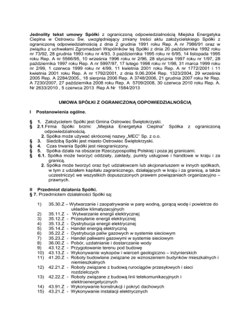 Jednolity tekst umowy Spółki z ograniczoną odpowiedzialnością Miejska Energetyka Cieplna w Ostrowcu Św. uwzględniający zmiany treści aktu założycielskiego Spółki z ograniczoną odpowiedzialnością z dnia 2 grudnia 1991 roku Rep. A nr 7986/91 oraz w związku z uchwałami Zgromadzeń Wspólników tej Spółki z dnia 20 października 1992 roku nr 73/92, 28 grudnia 1993 roku nr 4/93, 3 października 1995 roku nr 6/95, 14 listopada 1995 roku Rep. A nr 5566/95, 10 września 1996 roku nr 2/96, 28 stycznia 1997 roku nr 1/97, 28 października 1997 roku Rep. A nr 5997/97, 17 lutego 1998 roku nr 1/98, 31 marca 1999 roku nr 2/99, 1 czerwca 1999 roku nr 4/99, 11 kwietnia 2001 roku Rep. A nr 1772/2001 i 11 kwietnia 2001 roku Rep. A nr 1792/2001, z dnia 9.06.2004 Rep. 1323/2004, 29 września 2005 Rep. A 2284/2005., 18 sierpnia 2006 Rep. A 3748/2006, 21 grudnia 2007 roku Nr Rep. A 7230/2007, 27 października 2008 roku Rep. A 5709/2008, 30 czerwca 2010 roku Rep. A. Nr 2633/2010 , 5 czerwca 2013 Rep A Nr 1584/2013 UMOWA SPÓŁKI Z OGRANICZONĄ ODPOWIEDZIALNOŚCIĄ I Postanowienia ogólne. § § 1. Założycielem Spółki jest Gmina Ostrowiec Świętokrzyski. 2.1.Firma Spółki brzmi: „Miejska Energetyka Cieplna” Spółka z ograniczoną odpowiedzialnością. 2. Spółka może używać skróconej nazwy „MEC” Sp. z o.o. 3. Siedzibą Spółki jest miasto Ostrowiec Świętokrzyski. 4. Czas trwania Spółki jest nieograniczony. 5. Spółka działa na obszarze Rzeczypospolitej Polskiej i poza jej granicami. 6.1. Spółka może tworzyć oddziały, zakłady, punkty usługowe i handlowe w kraju i za granicą. 2. Spółka może tworzyć oraz być udziałowcem lub akcjonariuszem w innych spółkach, w tym z udziałem kapitału zagranicznego, działających w kraju i za granicą, a także uczestniczyć we wszystkich dopuszczonych prawem powiązaniach organizacyjno – prawnych. § § § § II Przedmiot działania Spółki. § 7. Przedmiotem działalności Spółki są: 1) 2) 3) 4) 5) 6) 7) 8) 9) 10) 11) 12) 13) 14) 15) 35.30.Z – Wytwarzanie i zaopatrywanie w parę wodną, gorącą wodę i powietrze do układów klimatyzacyjnych 35.11.Z - Wytwarzanie energii elektrycznej 35.12.Z - Przesyłanie energii elektrycznej 35.13.Z - Dystrybucja energii elektrycznej 35.14.Z - Handel energią elektryczną 35.22.Z - Dystrybucja paliw gazowych w systemie sieciowym 35.23.Z - Handel paliwami gazowymi w systemie sieciowym 36.00.Z - Pobór, uzdatnianie i dostarczanie wody 43.12.Z - Przygotowanie terenu pod budowę 43.13.Z - Wykonywanie wykopów i wierceń geologiczno – inżynierskich 41.20.Z - Roboty budowlane związane ze wznoszeniem budynków mieszkalnych i niemieszkalnych 42.21.Z - Roboty związane z budową rurociągów przesyłowych i sieci rozdzielczych 42.22.Z - Roboty związane z budową linii telekomunikacyjnych i elektroenergetycznych 43.91.Z - Wykonywanie konstrukcji i pokryć dachowych 43.21.Z - Wykonywanie instalacji elektrycznych 16) 17) 18) 19) 20) 21) 22) 23) 24) 25) 26) 27) 28) 29) 30) 43.22.Z - Wykonywanie instalacji wodno-kanalizacyjnych, cieplnych, gazowych i klimatyzacyjnych 43.99.Z - Pozostałe specjalistyczne roboty budowlane, gdzieindziej niesklasyfikowane 33.11.Z - Naprawa i konserwacja metalowych wyrobów gotowych 33.20 Z - Instalowanie maszyn przemysłowych, sprzętu i wyposażenia 33.12.Z - Naprawa i konserwacja maszyn 33.14.Z - Naprawa i konserwacja urządzeń elektrycznych 46.71.Z - Sprzedaż hurtowa paliw i produktów pochodnych 46.74.Z - Sprzedaż hurtowa wyrobów metalowych oraz sprzętu i dodatkowego wyposażenia hydraulicznego i grzejnego 46.77.Z - Sprzedaż hurtowa odpadów i złomu. 55.20.Z - Obiekty noclegowe turystyczne i miejsca krótkotrwałego zakwaterowania 49.41.Z - Transport drogowy towarów 71.11.Z - Działalność w zakresie architektury 71.12.Z - Działalność w zakresie inżynierii i związane z nią doradztwo techniczne 71.20.B - Pozostałe badania i analizy techniczne 45.20.Z - Konserwacja i naprawa pojazdów samochodowych, wyłączeniem motocykli. II Kapitał zakładowy Spółki. § 8.1 Kapitał zakładowy Spółki wynosi czterdzieści dwa miliony dziewięćset siedemdziesiąt dziewięć tysięcy (42.979.000,00) złotych i dzieli się na osiemdziesiąt pięć tysięcy dziewięćset pięćdziesiąt osiem (85.958) równych i niepodzielnych udziałów po pięćset (500,00 ) złotych każdy. 1) 45.958 udziałów zostało objętych przez Gminę Ostrowiec Świętokrzyski i pokrytych odpowiednio: 8 udziałów wkładem pieniężnym 45.950 udziałów wkładem niepieniężnym – aportem określonym w uchwałach Zgromadzenia Wspólników Spółki z o.o. Miejskiej Energetyki Cieplnej nr73/92 z dn. 20.10.1992r., nr 4/93 z dn. 28.12.1993 r., nr 6/95 z dn. 03.10.1995 r., nr 2/96 z dn. 10.09.1996 r., nr 1/97 z dn. 28.01.1997 r., nr 1/98 z dn. 17.02.1998 r., nr 2/99 z dn. 31.03.1999 r., nr 4/99 z dn. 01.06.1999 r., nr 1/2001 z dn. 12.04.2001 r., nr 3/2007 z dn. 21.12.2007 r., nr 3/2008 z dn. 27.20.2008 r. stanowiącymi załączniki do umowy Spółki. 2) 40.000 udziałów zostało objętych przez Narodowy Fundusz Ochrony Środowiska i Gospodarki Wodnej w Warszawie i pokryte wkładem pieniężnym. 2. Liczba udziałów w Spółce nie jest ograniczona. Każdy ze wspólników może posiadać większą liczbę udziałów. 3. Na każdy udział przypada jeden głos na Zgromadzeniu Wspólników. § 9. §10. Założyciel uczestniczy w kapitale zakładowym Spółki z taką ilością udziałów jaka jest uwidoczniona w księdze udziałów Spółki i liście wspólników składanej w Krajowym Rejestrze Sądowym. Z zachowaniem postanowień Kodeksu spółek handlowych udziały w kapitale zakładowym mogą być umarzane. Umarzanie udziałów może nastąpić z zachowaniem przepisów o obniżeniu kapitału zakładowego lub z czystego zysku Spółki. § 11.1. Zbycie i zastawienie udziałów wymaga dla swej ważności zezwolenia pozostałych wspólników udzielonego na piśmie. 2. Do zbycia u