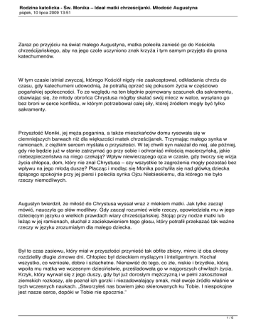 Rodzina katolicka - Św. Monika – Ideał matki chrześcijanki. Młodość Augustyna piątek, 10 lipca 2009 13:51 Zaraz po przyjściu na świat małego Augustyna, matka poleciła zanieść go do Kościoła chrześcijańskiego, aby na jego czole uczyniono znak krzyża i tym samym przyjęto do grona katechumenów. W tym czasie istniał zwyczaj, którego Kościół nigdy nie zaakceptował, odkładania chrztu do czasu, gdy katechumeni udowodnią, że potrafią oprzeć się pokusom życia w częściowo pogańskiej społeczności. To ze względu na ten błędnie pojmowany szacunek dla sakramentu, obawiając się, że młody obrońca Chrystusa mógłby skalać swój miecz w walce, wysyłano go bez broni w serce konfliktu, w którym potrzebował całej siły, której źródłem mogły być tylko sakramenty. Przyszłość Moniki, jej męża poganina, a także mieszkańców domu rysowała się w ciemniejszych barwach niż dla większości matek chrześcijanek. Trzymając małego synka w ramionach, z ciężkim sercem myślała o przyszłości. W tej chwili syn należał do niej, ale później, gdy nie będzie już w stanie zatrzymać go przy sobie i ochraniać miłością macierzyńską, jakie niebezpieczeństwa na niego czekają? Wpływ niewierzącego ojca w czasie, gdy tworzy się wizja życia chłopca, dom, który nie znał Chrystusa – czy wszystkie te zagrożenia mogły pozostać bez wpływu na jego młodą duszę? Płacząc i modląc się Monika pochyliła się nad główką dziecka śpiącego spokojnie przy jej piersi i poleciła synka Ojcu Niebieskiemu, dla którego nie było rzeczy niemożliwych. Augustyn twierdził, że miłość do Chrystusa wyssał wraz z mlekiem matki. Jak tylko zaczął mówić, nauczyła go słów modlitwy. Gdy zaczął rozumieć wiele rzeczy, opowiedziała mu w jego dziecięcym języku o wielkich prawdach wiary chrześcijańskiej. Stojąc przy nodze matki lub leżąc w jej ramionach, słuchał z zaciekawieniem tego głosu, który potrafił przekazać tak ważne rzeczy w języku zrozumiałym dla małego dziecka. Był to czas zasiewu, który miał w przyszłości przynieść tak obfite zbiory, mimo iż oba okresy rozdzieliły długie zimowe dni. Chłopiec był dzieckiem myślącym i inteligentnym. Kochał wszystko, co wzniosłe, dobre i szlachetne. Nienawiść do tego, co złe, niskie i brzydkie, którą wpoiła mu matka we wczesnym dzieciństwie, prześladowała go w najgorszych chwilach życia. Krzyk, który wyrwał się z jego duszy, gdy był już dorosłym mężczyzną i w pełni zakosztował ziemskich rozkoszy, ale poznał ich gorzki i niezadowalający smak, miał swoje źródło właśnie w tych wczesnych naukach. „Stworzyłeś nas bowiem jako skierowanych ku Tobie. I niespokojne jest nasze serce, dopóki w Tobie nie spocznie.” 1/6 Rodzina katolicka - Św. Monika – Ideał matki chrześcijanki. Młodość Augustyna piątek, 10 lipca 2009 13:51 Pewnego dnia, gdy chłopiec miał około siedmiu lat, nieoczekiwanie zachorował. Cierpiał bardzo i wkrótce stan pogorszył się do tego stopnia, że choroba zagroziła jego życiu. Rodzice pogrążeni byli w bólu, ale Augustyn myślał jedynie o swojej duszy. Błagał i modlił się, by udzielono mu chrztu. Monika przyłączyła się do próśb syna. Patrycjusz uległ. Wszystko zostało przygotowane, gdy dziecko nagle poczuło się lepiej. Wtedy też ktoś, jak wspomina Augustyn, najprawdopodobniej ojciec, podjął decyzję o ponownym przełożeniu chrztu – jednak bez wskazania konkretnego terminu. Nadszedł czas, by zająć się kształceniem chłopca; zaproponowano, by posłać go do szkoły w Tagaście. Była to pogańska szkoła, w której uczono o pogańskich autorach i, co gorsze, idealne miejsce do prowadzenia pogańskich rozmów i zabaw z rówieśnikami. Patrycjusz dumny był z urody i inteligencji syna i liczył na jego wielkie sukcesy w przyszłości, tymczasem wczesne lata szkolne Augustyna nie zapowiadały spełnienia tych nadziei. Chłopiec chętnie uczył się rzeczy, które go interesowały, natomiast notorycznie unikał wszystkiego, co sprawiało mu trudności. Nudziła go nauka czytania i pisania, a oczywista prawda, że dwa i dwa to cztery, wręcz go wyczerpywała. Choć zachwycały go opowieści Wergiliusza, nie do końca lubił Homera i nie mógł mu wybaczyć, że to właśnie przez niego był zmuszany brnąć w lodowatych wodach gramatyki języka greckiego. Na nieszczęście dla Augustyna ta mało ciekawa oczywistość, że dwa i dwa daje cztery, wymagała przyswojenia przed przejściem na wyższe poziomy wiedzy. Nauczyciele szkół w Tagaście znali tylko jeden sposób na skłonienie uczniów do nauki – użycie rózgi. Augustyn nie cierpiał kar cielesnych, tak samo jak wszelkich nieprzyjemnych rzeczy, jednak nie garnął się do pracy. Jedynym sposobem na uniknięcie tego, czego nie lubił, było pójście za przykładem wielu szkolnych kolegów i bawienie się w czasie przeznaczonym na naukę oraz opowiadanie wymyślnych kłamstw nauczycielom i rodzicom, aby uniknąć kary. Wybiegi tego rodzaju wcześniej czy później wychodzą na jaw. Monika zdając sobie sprawę z tego, że więcej można zdziałać podchodząc do syna z miłością nie zaś groźbami, posłała go na nauki do chrześcijańskich księży, aby nauczyli go panować nad sobą w imię miłości do Boga. W efekcie Augustyn modlił się jeszcze żarliwiej, prosząc przede wszystkim o to, by nie bito go w szkole. Gdy któregoś dnia matka zastała go modlącego się właśnie o to w cichym kąciku 2/6 Rodzina katolicka - Św. Monika – Ideał matki chrześcijanki. Młodość Augustyna piątek, 10 lipca 2009 13:51 pokoju, wyjaśniła mu, że jeśli odrobił zadania domowe, nie miał powodu do lęku, jeśli zaś nie, mógł oczekiwać kary. Przechodzący nieopodal Patrycjusz, który usłyszał tę rozmowę, wyśmiał obawy syna i zgodził się z żoną. Augustyn uznał, że oboje pozbawieni byli serca. W miarę jak chłop