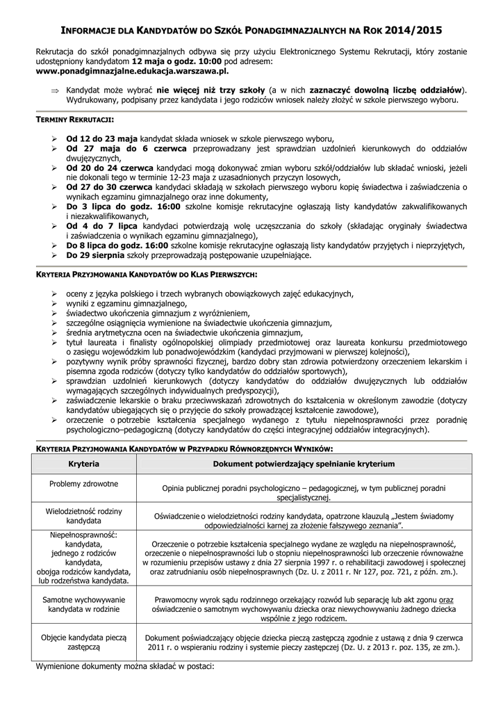 INFORMACJE DLA KANDYDATÓW DO SZKÓŁ PONADGIMNAZJALNYCH NA ROK 2014/2015 Rekrutacja do szkół ponadgimnazjalnych odbywa się przy użyciu Elektronicznego Systemu Rekrutacji, który zostanie udostępniony kandydatom 12 maja o godz. 10:00 pod adresem: www.ponadgimnazjalne.edukacja.warszawa.pl. ⇒ Kandydat może wybrać nie więcej niż trzy szkoły (a w nich zaznaczyć dowolną liczbę oddziałów). Wydrukowany, podpisany przez kandydata i jego rodziców wniosek należy złożyć w szkole pierwszego wyboru. TERMINY REKRUTACJI: Od 12 do 23 maja kandydat składa wniosek w szkole pierwszego wyboru, Od 27 maja do 6 czerwca przeprowadzany jest sprawdzian uzdolnień kierunkowych do oddziałów dwujęzycznych, Od 20 do 24 czerwca kandydaci mogą dokonywać zmian wyboru szkół/oddziałów lub składać wnioski, jeżeli nie dokonali tego w terminie 12-23 maja z uzasadnionych przyczyn losowych, Od 27 do 30 czerwca kandydaci składają w szkołach pierwszego wyboru kopię świadectwa i zaświadczenia o wynikach egzaminu gimnazjalnego oraz inne dokumenty, Do 3 lipca do godz. 16:00 szkolne komisje rekrutacyjne ogłaszają listy kandydatów zakwalifikowanych i niezakwalifikowanych, Od 4 do 7 lipca kandydaci potwierdzają wolę uczęszczania do szkoły (składając oryginały świadectwa i zaświadczenia o wynikach egzaminu gimnazjalnego), Do 8 lipca do godz. 16:00 szkolne komisje rekrutacyjne ogłaszają listy kandydatów przyjętych i nieprzyjętych, Do 29 sierpnia szkoły przeprowadzają postępowanie uzupełniające. KRYTERIA PRZYJMOWANIA KANDYDATÓW DO KLAS PIERWSZYCH: oceny z języka polskiego i trzech wybranych obowiązkowych zajęć edukacyjnych, wyniki z egzaminu gimnazjalnego, świadectwo ukończenia gimnazjum z wyróżnieniem, szczególne osiągnięcia wymienione na świadectwie ukończenia gimnazjum, średnia arytmetyczna ocen na świadectwie ukończenia gimnazjum, tytuł laureata i finalisty ogólnopolskiej olimpiady przedmiotowej oraz laureata konkursu przedmiotowego o zasięgu wojewódzkim lub ponadwojewódzkim (kandydaci przyjmowani w pierwszej kolejności), pozytywny wynik próby sprawności fizycznej, bardzo dobry stan zdrowia potwierdzony orzeczeniem lekarskim i pisemna zgoda rodziców (dotyczy tylko kandydatów do oddziałów sportowych), sprawdzian uzdolnień kierunkowych (dotyczy kandydatów do oddziałów dwujęzycznych lub oddziałów wymagających szczególnych indywidualnych predyspozycji), zaświadczenie lekarskie o braku przeciwwskazań zdrowotnych do kształcenia w określonym zawodzie (dotyczy kandydatów ubiegających się o przyjęcie do szkoły prowadzącej kształcenie zawodowe), orzeczenie o potrzebie kształcenia specjalnego wydanego z tytułu niepełnosprawności przez poradnię psychologiczno–pedagogiczną (dotyczy kandydatów do części integracyjnej oddziałów integracyjnych). KRYTERIA PRZYJMOWANIA KANDYDATÓW W PRZYPADKU RÓWNORZĘDNYCH WYNIKÓW: Kryteria Problemy zdrowotne Wielodzietność rodziny kandydata Niepełnosprawność: kandydata, jednego z rodziców kandydata, obojga rodziców kandydata, lub rodzeństwa kandydata. Dokument potwierdzający spełnianie kryterium Opinia publicznej poradni psychologiczno – pedagogicznej, w tym publicznej poradni specjalistycznej. Oświadczenie o wielodzietności rodziny kandydata, opatrzone klauzulą „Jestem świadomy odpowiedzialności karnej za złożenie fałszywego zeznania”. Orzeczenie o potrzebie kształcenia specjalnego wydane ze względu na niepełnosprawność, orzeczenie o niepełnosprawności lub o stopniu niepełnosprawności lub orzeczenie równoważne w rozumieniu przepisów ustawy z dnia 27 sierpnia 1997 r. o rehabilitacji zawodowej i społecznej oraz zatrudnianiu osób niepełnosprawnych (Dz. U. z 2011 r. Nr 127, poz. 721, z późn. zm.). Samotne wychowywanie kandydata w rodzinie Prawomocny wyrok sądu rodzinnego orzekający rozwód lub separację lub akt zgonu oraz oświadczenie o samotnym wychowywaniu dziecka oraz niewychowywaniu żadnego dziecka wspólnie z jego rodzicem. Objęcie kandydata pieczą zastępczą Dokument poświadczający objęcie dziecka pieczą zastępczą zgodnie z ustawą z dnia 9 czerwca 2011 r. o wspieraniu rodziny i systemie pieczy zastępczej (Dz. U. z 2013 r. poz. 135, ze zm.). Wymienione dokumenty można składać w postaci: - w oryginale, notarialnie poświadczonej kopii albo w postaci urzędowo poświadczonego zgodnie z art. 76a § 1 Kodeksu postępowania administracyjnego odpisu lub wyciągu z dokumentu, - kopii poświadczonej za zgodność z oryginałem przez rodzica kandydata lub pełnoletniego kandydata, - oświadczenia składa się pod rygorem odpowiedzialności karnej za składanie fałszywych zeznań. Składający oświadczenie jest obowiązany do zawarcia w nim klauzuli następującej treści: „Jestem świadomy odpowiedzialności karnej za złożenie fałszywego oświadczenia". Klauzula ta zastępuje pouczenie organu o odpowiedzialności karnej za składanie fałszywych zeznań. PUNKTY: (Zgodnie z Zarządzeniem Nr 6 Mazowieckiego Kuratora Oświaty z dnia 10 lutego 2014 r.)) 200 punktów – maksymalna liczba punktów możliwych do uzyskania w postępowaniu rekrutacyjnym. ⇒ 100 punktów za egzamin gimnazjalny przeprowadzony w ostatnim roku nauki z: − języka polskiego, − historii i wiedzy o społeczeństwie, − matematyki, − przedmiotów przyrodniczych: geografii, biologii, chemii, fizyki, − języka obcego nowożytnego na poziomie podstawowym. Do przeliczania wyników na punkty przyjmuje się współczynnik 0,2 (np. uczeń uzyskał z matematyki wynik - 70%, co daje w rekrutacji 14 punktów). ⇒ 100 punktów za oceny na świadectwie z języka polskiego i trzech obowiązkowych zajęć edukacyjnych wskazanych przez szkołę oraz za inne osiągnięcia ucznia odnotowane na świadectwie ukończenia gimnazjum. Sposób przeliczania na punkty ocen z języka polskiego i trzech obowiązkowych zajęć wskazanych przez szkołę: − stopień celujący - 18 p