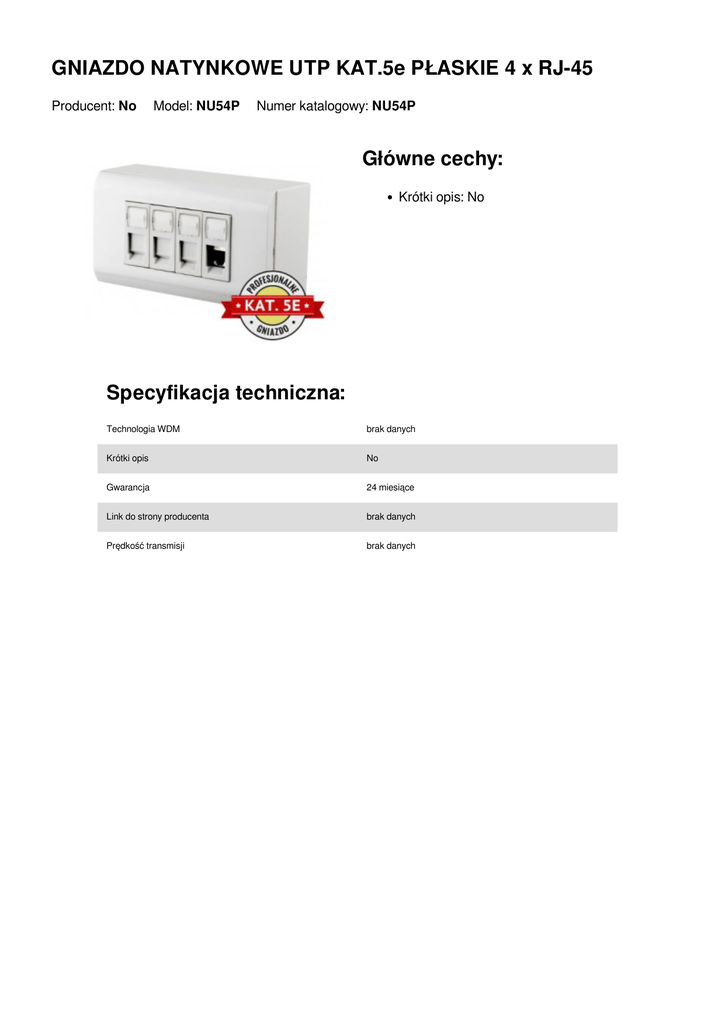 GNIAZDO NATYNKOWE UTP KAT.5e PŁASKIE 4 x RJ-45 Producent: No Model: NU54P Numer katalogowy: NU54P Główne cechy: Krótki opis: No Specyfikacja techniczna: Technologia WDM brak danych Krótki opis No Gwarancja 24 miesiące Link do strony producenta brak danych Prędkość transmisji brak danych