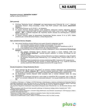 Regulamin promocji „SWOBODNY NUMER” (wersja 3 z dnia 07.05.2012 r.) Opis promocji 1. 2. 3. 4. 1 Promocja "Swobodny Numer” („Promocja”) jest organizowana przez Polkomtel Sp. z o.o. i obejmuje 2 3 Abonentów Simplus , którzy korzystają z taryfy Twój Profil (zwanych dalej łącznie „Abonentami Simplus”). Czas trwania Promocji: od 19.10.2011 r. do odwołania. W ramach Promocji Abonent Simplus może bezpłatnie wykonywać krajowe połączenia głosowe 4 i wysyłać krajowe wiadomości SMS na jeden wskazany przez siebie numer w sieci Plus („Swobodny Numer”, „SN”), w Okresie Ważności SN. Swobodny Numer odnawia się automatycznie z upływem Okresu Ważności SN. W ramach Promocji opłata za aktywowanie Swobodnego Numeru wynosi 10 zł (z VAT). Opłata pobierana jest z konta Abonenta Simplus z chwilą Aktywacji SN. Opis ustawienia Numeru Swojaka 5. 6. Aby ustawić Swobodny Numer Abonent musi spełnić łączenie następujące warunki: a. musi posiadać dodatnią wartość swojego konta (powyżej 10 zł z VAT); b. musi ustawić Swobodny Numer na swoim koncie zgodnie z zasadami określonymi w pkt. 6; c. musi znajdować się w okresie ważności dla usług wychodzących. Ustawienie Swobodnego Numeru odbywa się według następujących zasad („Ustawienie Swobodnego Numeru”): a. aby Ustawić Swobodny Numer Abonent musi wpisać w swoim telefonie krótki kod 5 *104*50*48numer_telefonu# i wcisnąć przycisk „zadzwoń” (z numeru, dla którego ma być aktywowany SN); b. Ustawienie Swobodnego Numeru na koncie Abonenta ma miejsce najpóźniej w ciągu 24 godzin od momentu otrzymania przez Polkomtel Sp. z o.o. krótkiego kodu, o którym mowa w pkt. a) powyżej; c. Abonent zostanie powiadomiony zwrotną wiadomością SMS o Ustawieniu SN na jego koncie; d. momentem Ustawienia SN jest moment, w którym Polkomtel Sp. z o.o. wysłał do Abonenta zwrotną wiadomość SMS potwierdzającą Ustawienie SN na jego koncie. Zasady korzystania z Usługi Swobodny Numer 7. 8. 9. 6 Okres ważności dla SN wynosi 720 godzin od momentu wysłania wiadomości sms potwierdzającej Ustawienie SN („Okres ważności SN ”). Moment wysłania wiadomości SMS z dokładnością co do minuty wysyłki można sprawdzić w szczegółach wiadomości SMS potwierdzającej Ustawienie SN. Ze Swobodnego Numeru Abonent może korzystać tylko w okresie ważności konta dla usług wychodzących. Abonentowi nie przysługuje roszczenie o zwrot opłaty za Ustawienie SN w przypadku, gdy w ciągu 720 4 godzin od momentu Ustawienia SN nie wykonywał połączeń i nie wysyłał wiadomości sms na wybrany SN . 1 Z siedzibą w Warszawie, ul. Postępu 3, 02-676 Warszawa, zarejestrowaną w rejestrze przedsiębiorców Krajowego Rejestru Sądowego prowadzonym przez Sąd Rejonowy dla m.st. Warszawy, XIII Wydział Gospodarczy Krajowego Rejestru Sądowego pod nr KRS 0000419430, kapitał zakładowy 3.510.300.000 PLN, NIP 527-10-37-727, Regon 011307968 2 W rozumieniu Regulaminu świadczenia usług telekomunikacyjnych przez Polkomtel Sp. z o.o. dla Abonentów Simplus / Sami Swoi 3 Nazwę posiadanej taryfy Abonent może sprawdzić wybierając na klawiaturze swojego telefonu bezpłatny kod: *147# i wciskając klawisz połączenia. 4 Z wyłączeniem połączeń głosowych z numerami Usług dodatkowych oraz Serwisów rozrywkowych i informacyjnych a także z numerami Abonentów Sami Swoi 5 Wpisywany w krótkim kodzie „numer_ telefonu” to Swobodny Numer, który ma zostać ustawiony. 6 Okres ważności Usługi 720 godzin jest równy 30 dobom. 7 Wpisywany w krótkim kodzie „numer_ telefonu” to Swobodny Numer, który ma zostać usunięty. 10. Abonent Simplus ma możliwość bezpłatnego sprawdzenia ustawionego Swobodnego Numeru oraz Okresu ważności SN poprzez wpisanie w telefonie krótkiego kodu: *104# i naciśnięcie przycisku „zadzwoń”; 11. Abonent może w dowolnym momencie usunąć SN. W tym celu musi wpisać w swoim telefonie krótki kod 7 *104*00*48numer_telefonu# i wcisnąć przycisk „zadzwoń” (z numeru, dla którego ma być dezaktywowany SN); 12. Usunięcie Swobodnego Numeru powoduje zakończenie Okresu ważności SN. 13. Promocja nie obowiązuje na połączenia głosowe oraz wiadomości SMS wykonywane na wybrany SN w roamingu. 14. W przypadku usunięcia Swobodnego Numeru w trakcie Okresu Ważności SN, zgodnie z pkt 11 Regulaminu, opłaty za krajowe połączenia głosowe i opłaty za krajowe wiadomości SMS na wskazany numer w sieci Plus naliczane będą zgodnie z cennikiem taryfy Twój Profil. 15. Dwa dni przed upływem Okresu Ważności SN Abonent zostanie poinformowany za pomocą wiadomości SMS, że SN zostanie automatycznie odnowiony po upływie Okresu Ważności SN i że za jego odnowienie zostanie pobrana opłata na zasadach określonych w pkt. 4. 16. Po upływie Okresu Ważności SN zostanie on automatycznie odnowiony, a za odnowienie zostanie pobrana opłata na zasadach określonych w pkt. 4. W przypadku braku na koncie Abonenta środków w wysokości wymaganej do odnowienia SN i pobrania opłaty określonej w pkt 4 Regulaminu lub upływu okresu ważności dla usług wychodzących, zostanie on automatycznie dezaktywowany, a Abonent zostanie o tym poinformowany za pomocą wiadomości SMS. 17. Po dezaktywacji SN, opłaty za wykonywane przez Abonenta połączenia i wysyłane wiadomości SMS na ten numer naliczane są zgodnie z Cennikiem taryfy Twój Profil. 18. W przypadku, gdy w trakcie trwania połączenia głosowego na SN upłynie jego Okres ważności i nie zostanie przedłużona jego ważność to opłaty za pozostałą część połączenia zostaną naliczone zgodnie z Cennikiem taryfy Twój Profil. 19. Ustawienie SN zgodnie z pkt. 6 oznacza, że Abonent zapoznał się z treścią niniejszego Regulaminu i że ją akceptuje. Informacje dodatkowe 20. Polkomtel Sp. z o.o. zastrzega możliwość zmiany niniejszego Regulaminu lub wcześniejszego zakończenia Promocji. Informacja o zmianie Regulaminu lub zak