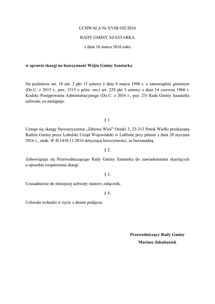UCHWAŁA Nr XVIII/102/2016 RADY GMINY SZASTARKA z dnia 16 marca 2016 roku w sprawie skargi na bezczynność Wójta Gminy Szastarka Na podstawie art. 18 ust. 2 pkt 15 ustawy z dnia 8 marca 1990 r. o samorządzie gminnym (Dz.U. z 2015 r., poz. 1515 z późn. zm.) art. 229 pkt 3 ustawy z dnia 14 czerwca 1960 r. Kodeks Postępowania Administracyjnego (Dz.U. z 2016 r., poz. 23) Rada Gminy Szastarka uchwala, co następuje: § 1. Uznaje się skargę Stowarzyszenia „Zdrowa Wieś” Osinki 3, 23-313 Potok Wielki przekazaną Radzie Gminy przez Lubelski Urząd Wojewódzki w Lublinie przy piśmie z dnia 20 stycznia 2016 r., znak: IF-II.1410.11.2016 dotyczącą bezczynności, za bezzasadną. § 2. Zobowiązuje się Przewodniczącego Rady Gminy Szastarka do zawiadomienia skarżących o sposobie rozpatrzenia skargi. § 3. Uzasadnienie do niniejszej uchwały stanowi załącznik. § 4. Uchwała wchodzi w życie z dniem podjęcia. Przewodniczący Rady Gminy Mariusz Jakubaszek Załącznik do uchwały Nr XVIII/102/2016 Rady Gminy Szastarka z dnia 16 marca 2016 roku UZASADNIENIE W dniu 25 stycznia 2016 r. do urzędu Gminy Szastarka wpłynęła skarga Stowarzyszenia „Zdrowa Wieś” Osinki 3, 23-313 Potok Wielki przekazaną Radzie Gminy przez Lubelski Urząd Wojewódzki w Lublinie przy piśmie z dnia 20 stycznia 2016 r., znak: IF-II.1410.11.2016 dotyczącą bezczynności Wójta Gminy Szastarka z tytułu notorycznego przekraczania terminów odpowiedzi na podania, wnioski i skargi, określonych w art. 35 kodeksu postępowania administracyjnego. Przedmiotowa skarga została sporządzona na kanwie podjętych przez Wójta Gminy Szastarka czynności, co do wniosków Stowarzyszenia z dnia 25.08.2015 roku oraz z dnia 04.12.2015 roku, w sprawie dopuszczenia stowarzyszenia do postępowania na prawach strony do postępowania mającego na celu zmianę miejscowego planu zagospodarowania przestrzennego gminy Szastarka, w którym zostaną ujęte tereny, na których miejscowy plan zagospodarowania przestrzennego umożliwi realizację farm wiatrowych. Wniosek Stowarzyszenia z dnia 25.08.2015 roku został rozpatrzony przez Wójta Gminy Szastarka pismem z dnia 07.10.2015 roku o znaku UAN.6720.6.2015, zaś wniosek Stowarzyszenia z dnia 04.12.2015 roku został rozpatrzony przez Wójta Gminy Szastarka pismem z dnia 14.12.2015 roku o znaku UAN.6720.16.2015. Wydanie rozstrzygnięcia w przedmiocie dopuszczenia Stowarzyszenia „Zdrowia Wieś” z siedzibą w Osinkach do udziału w postępowaniu mającym na celu zmianę miejscowego planu zagospodarowania przestrzennego Gminy Szastarka nie jest prawem wymagane, a stosowanie do tych wniosków przepisów kodeksu postępowania administracyjnego jest niedopuszczalne. Jednoznacznie sprawę tę rozstrzyga treść postanowienia Wojewódzkiego Sądu Administracyjnego z siedzibą w Warszawie z dnia 1310-2011 roku o sygn. akt: IV SAB/Wa 144/11. Postępowanie planistyczne związane z uchwaleniem czy zmianą miejscowego planu zagospodarowania przestrzennego prowadzone jest w oparciu o regulacje zawarte w ustawie z dnia 27 marca 2003 roku o planowaniu i zagospodarowaniu przestrzennym (tj. Dz.U. z 2015 roku, poz. 199 ze zm.). Do tego rodzaju postępowania nie stosuje się przepisów Kodeksu postępowania administracyjnego, jedynie w sytuacji wyraźnej delegacji ustawowej możliwe byłoby stosowanie tych przepisów. Tym samym do postępowania planistycznego nie ma zastosowania art. 31, ani też art. 35 Kodeksu postępowania administracyjnego. Czynny udział społeczeństwa w postępowaniu dotyczącym zmiany planu miejscowego sprowadza się do możliwości składania wniosków i uwag do sporządzonego i wyłożonego projektu planu oraz udziału w dyskusji publicznej nad proponowanymi w projekcie planu rozwiązaniami, na zasadach i w trybie określonym w ustawie o planowaniu i zagospodarowaniu przestrzennym. Kluczowe znaczenie ma tu regulacja art. 17 ustawy o planowaniu i zagospodarowaniu przestrzennym, który wymienia poszczególne etapy tej procedury oraz kolejność, w jakiej należy ich dokonać, by plan miejscowy mógł powstać, czy też być zmieniony. Stosownie do art. 17 pkt 1 ustawy o planowaniu i zagospodarowaniu przestrzennym, wójt, burmistrz albo prezydent miasta po podjęciu przez radę gminy uchwały o przystąpieniu do sporządzania/zmiany planu miejscowego ogłasza w prasie oraz przez obwieszczenie, a także w sposób zwyczajowo przyjęty w danej miejscowości, o podjęciu przedmiotowej uchwały, określając formę, miejsce i termin składania wniosków do planu, nie krótszy niż 21 dni od dnia ogłoszenia. Następnie rozpatruje złożone wnioski, w przewidzianym ustawą terminie (art. 17 pkt 2 cyt. ustawy). Po rozpatrzeniu wniosków organ wykonawczy gminy sporządza projekt planu wraz z prognozą oddziaływania na środowisko (art. 17 pkt 4). Następnie, po uzyskaniu opinii i uzgodnień od właściwych organów oraz wprowadzeniu zmian wynikających z uzyskanych opinii i dokonanych uzgodnień wójt, burmistrz albo prezydent miasta ogłasza o wyłożeniu projektu planu do publicznego wglądu. Wykładając projekt planu wraz z prognozą oddziaływania na środowisko do publicznego wglądu organ wykonawczy gminy organizuje w tym czasie dyskusję publiczną nad przyjętymi w projekcie planu rozwiązaniami. Kolejnym etapem związanym z uchwaleniem/zmianą miejscowego planu zagospodarowania przestrzennego jest możliwość składania przez osoby fizyczne i prawne oraz jednostki organizacyjne nieposiadające osobowości prawnej uwag dotyczących projektu planu. Przy czym należy podkreślić, iż uwagi do projektu planu miejscowego może wnieść każdy, kto kwestionuje ustalenia przyjęte w projekcie planu, wyłożonym do publicznego wglądu (art. 18 ust. 1 ustawy o planowaniu i zagospodarowaniu przestrzennym). Przedstawione powyżej etapy uchwalania/zmiany planu wskazują, iż w postępowaniu planistycznym, w którym wraz z projektem planu sporządzana jest prognoza jego oddziaływan