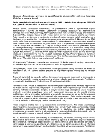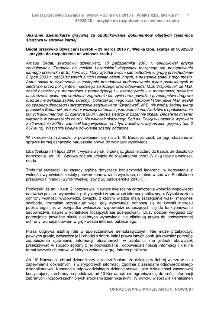Bédat przeciwko Szwajcarii (wyrok – 29 marca 2016 r., Wielka Izba, skarga nr 56925/08 – przyjęta do rozpatrzenia na wniosek rządu) 1 Ukaranie dziennikarza grzywną za opublikowanie dokumentów objętych tajemnicą śledztwa w sprawie karnej Bédat przeciwko Szwajcarii (wyrok – 29 marca 2016 r., Wielka Izba, skarga nr 56925/08 – przyjęta do rozpatrzenia na wniosek rządu) Arnaud Bédat, zawodowy dziennikarz, 15 października 2003 r. opublikował artykuł zatytułowany “Tragedia na moście Lozańskim” dotyczący toczącego się postępowania karnego przeciwko M.B., kierowcy, który wjechał swoim samochodem w grupę przechodniów 8 lipca 2003 r., zabijając trzech z nich i raniąc osiem innych, a następnie spadł z tego mostu. Autor opisał te wydarzenia a następnie przedstawił podsumowanie pytań postawionych w śledztwie przez policjantów i sędziego śledczego oraz odpowiedzi M.B. Wspomniał, że M.B. został oskarżony o morderstwo z premedytacją i – alternatywnie – o morderstwo, poważne uszkodzenie ciała, sprowadzenie zagrożenia dla życia oraz poważne przestępstwa drogowe oraz że nie wykazał żadnej skruchy. Dołączył do niego kilka fotokopii listów, jakie M.B. wysłał do sędziego śledczego i streszczenie zatytułowane “Zwariował”. M.B. nie wniósł żadnej skargi przeciwko Bédatowi, prokurator wszczął natomiast przeciwko niemu śledztwo o opublikowanie tajnych dokumentów. 23 czerwca 2004 r. sędzia śledczy w Lozannie skazał Bédata na miesiąc więzienia w zawieszeniu na rok. Na wniosek skazanego Sąd ds. Policji w Lozannie wyrokiem z 22 września 2005 r. zamienił karę więzienia na 4 tys. franków szwajcarskich grzywny (ok. 2 667 euro). Wszystkie kolejne odwołania zostały oddalone. W skardze do Trybunału, z powołaniem się na art. 10 Bédat zarzucił, że jego skazanie w sprawie karnej oznaczało naruszenie prawa do wolności wypowiedzi. Izba (Sekcja II) 1 lipca 2014 r. wydała wyrok, orzekając głosami cztery do trzech, że doszło do naruszenia art. 10. Sprawa została przyjęta do rozpatrzenia przez Wielką Izbę na wniosek rządu. Trybunał stwierdził, że zasady ogólne dotyczące konieczności ingerencji w korzystanie z wolności wypowiedzi zostały potwierdzone w wielu wyrokach, ostatnio w sprawie Pentikäinen przeciwko Finlandii (wyrok Wielkiej Izby z 20 października 2015 r.) . Podkreślił, że art. 10 ust. 2 pozostawia niewiele miejsca na ograniczenia wolności wypowiedzi na dwóch polach: wypowiedzi politycznych i w sprawach interesu publicznego. Wysoki poziom ochrony wolności wypowiedzi, związku z którym władze mają szczególnie wąski margines swobody, normalnie przysługuje więc, gdy wypowiedzi odnoszą się do kwestii interesu publicznego, jak w przypadku zwłaszcza wypowiedzi odnoszących się do funkcjonowania sądownictwa, nawet w kontekście toczących się postępowań. Duży poziom wrogości czy potencjalne poważne skutki niektórych wypowiedzi nie eliminują prawa do podwyższonej ochrony, wchodzi bowiem w grę kwestia interesu publicznego. Prasa odgrywa istotną rolę w społeczeństwie demokratycznym. Nie może przekroczyć pewnych granic, zwłaszcza jeśli chodzi o dobre imię i prawa innych osób, jak również potrzebę zapobieżenia ujawnieniu informacji otrzymanych w zaufaniu, ma jednak obowiązek przekazywać w sposób zgodny z jej obowiązkami i odpowiedzialnością informacji i idei na temat wszystkich spraw, w których wchodzi w grę interes publiczny. Art. 10 Konwencji chroni dziennikarzy z zastrzeżeniem, że działają w dobrej wierze w celu zapewnienia dokładnych i wiarygodnych informacji zgodnie z zasadami odpowiedzialnego dziennikarstwa. Koncepcja odpowiedzialnego dziennikarstwa, jako działalności zawodowej korzystającej z ochrony na podstawie art.10 Konwencji, nie ogranicza się do treści informacji zebranych i rozpowszechnionych środkami dziennikarskimi. W wyroku w sprawie Pentikäinen OPRACOWANIE MAREK ANTONI NOWICKI 2 Bédat przeciwko Szwajcarii (wyrok – 29 marca 2016 r., Wielka Izba, skarga nr 56925/08 – przyjęta do rozpatrzenia na wniosek rządu) Trybunał podkreślił, że obejmuje ona również zgodność zachowania dziennikarza z prawem a fakt, że dziennikarz naruszył prawo, jest istotnym ale nie decydującym czynnikiem przy ocenie, czy działał on w sposób odpowiedzialny. W szczególności trudno sobie wyobrazić brak możliwości wcześniejszej albo równoległej dyskusji odnoszącej się do przedmiotu procesów - w wyspecjalizowanych czasopismach, prasie ogólnodostępnej albo ogólnie w społeczeństwie jako takim. Nie tylko media mają zadanie przekazywania takich informacji i idei; ogół również ma prawo je otrzymywać. Należy uwzględniać prawo każdego do rzetelnego procesu sądowego na podstawie art. 6 ust.1 Konwencji, który w sprawach karnych obejmuje prawo do bezstronnego sądu i prawo do domniemania niewinności. Trybunał już wcześniej wielokrotnie podkreślał, że: dziennikarze przy komentowaniu toczących się postępowań karnych muszą brać je pod uwagę, ponieważ granice dozwolonego komentarza nie obejmują wypowiedzi mogących zaszkodzić, w sposób zamierzony lub nie, szansom oskarżonego na rzetelny proces lub osłabić zaufanie społeczeństwa do roli sądów w wymiarze sprawiedliwości w sprawach karnych. Ponadto, Trybunał - mając rozstrzygnąć konflikt dwóch praw korzystających z równej ochrony na podstawie Konwencji – musi rozważyć konkurujące ze sobą interesy. Wynik skargi nie może co do zasady różnić się zależnie od jej wniesienia do Trybunału na podstawie art. 8 przez osobę, której dotyczył obraźliwy artykuł, czy na podstawie art.10 przez autora tego artykułu, ponieważ oba te prawa zasługują zasadniczo na równy szacunek. Swoboda oceny musi więc być teoretycznie ta sama w obu przypadkach. Analogiczne uzasadnienie należy stosować odpowiednio przy ważeniu praw na podstawie art. 10 i art.