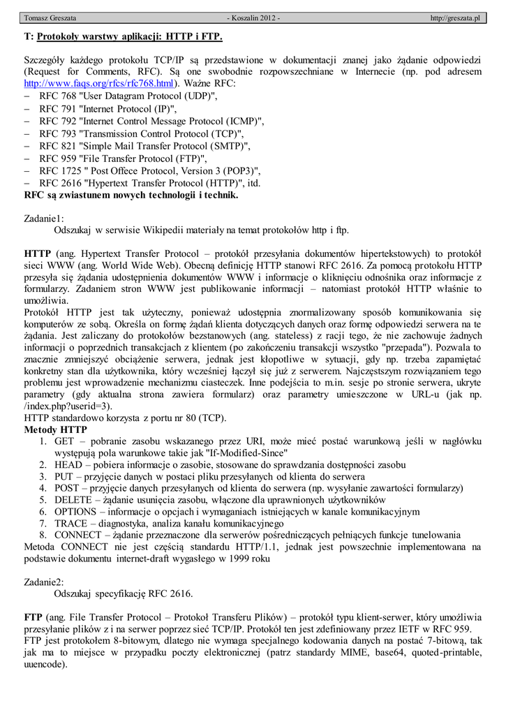 Tomasz Greszata - Koszalin 2012 - http://greszata.pl T: Protokoły warstwy aplikacji: HTTP i FTP. Szczegóły każdego protokołu TCP/IP są przedstawione w dokumentacji znanej jako żądanie odpowiedzi (Request for Comments, RFC). Są one swobodnie rozpowszechniane w Internecie (np. pod adresem http://www.faqs.org/rfcs/rfc768.html). Ważne RFC: RFC 768 "User Datagram Protocol (UDP)", RFC 791 "Internet Protocol (IP)", RFC 792 "Internet Control Message Protocol (ICMP)", RFC 793 "Transmission Control Protocol (TCP)", RFC 821 "Simple Mail Transfer Protocol (SMTP)", RFC 959 "File Transfer Protocol (FTP)", RFC 1725 " Post Offece Protocol, Version 3 (POP3)", RFC 2616 "Hypertext Transfer Protocol (HTTP)", itd. RFC są zwiastunem nowych technologii i technik. Zadanie1: Odszukaj w serwisie Wikipedii materiały na temat protokołów http i ftp. HTTP (ang. Hypertext Transfer Protocol – protokół przesyłania dokumentów hipertekstowych) to protokół sieci WWW (ang. World Wide Web). Obecną definicję HTTP stanowi RFC 2616. Za pomocą protokołu HTTP przesyła się żądania udostępnienia dokumentów WWW i informacje o kliknięciu odnośnika oraz informacje z formularzy. Zadaniem stron WWW jest publikowanie informacji – natomiast protokół HTTP właśnie to umożliwia. Protokół HTTP jest tak użyteczny, ponieważ udostępnia znormalizowany sposób komunikowania się komputerów ze sobą. Określa on formę żądań klienta dotyczących danych oraz formę odpowiedzi serwera na te żądania. Jest zaliczany do protokołów bezstanowych (ang. stateless) z racji tego, że nie zachowuje żadnych informacji o poprzednich transakcjach z klientem (po zakończeniu transakcji wszystko "przepada"). Pozwala to znacznie zmniejszyć obciążenie serwera, jednak jest kłopotliwe w sytuacji, gdy np. trzeba zapamiętać konkretny stan dla użytkownika, który wcześniej łączył się już z serwerem. Najczęstszym rozwiązaniem tego problemu jest wprowadzenie mechanizmu ciasteczek. Inne podejścia to m.in. sesje po stronie serwera, ukryte parametry (gdy aktualna strona zawiera formularz) oraz parametry umieszczone w URL-u (jak np. /index.php?userid=3). HTTP standardowo korzysta z portu nr 80 (TCP). Metody HTTP 1. GET – pobranie zasobu wskazanego przez URI, może mieć postać warunkową jeśli w nagłówku występują pola warunkowe takie jak "If-Modified-Since" 2. HEAD – pobiera informacje o zasobie, stosowane do sprawdzania dostępności zasobu 3. PUT – przyjęcie danych w postaci pliku przesyłanych od klienta do serwera 4. POST – przyjęcie danych przesyłanych od klienta do serwera (np. wysyłanie zawartości formularzy) 5. DELETE – żądanie usunięcia zasobu, włączone dla uprawnionych użytkowników 6. OPTIONS – informacje o opcjach i wymaganiach istniejących w kanale komunikacyjnym 7. TRACE – diagnostyka, analiza kanału komunikacyjnego 8. CONNECT – żądanie przeznaczone dla serwerów pośredniczących pełniących funkcje tunelowania Metoda CONNECT nie jest częścią standardu HTTP/1.1, jednak jest powszechnie implementowana na podstawie dokumentu internet-draft wygasłego w 1999 roku Zadanie2: Odszukaj specyfikację RFC 2616. FTP (ang. File Transfer Protocol – Protokoł Transferu Plików) – protokół typu klient-serwer, który umożliwia przesyłanie plików z i na serwer poprzez sieć TCP/IP. Protokół ten jest zdefiniowany przez IETF w RFC 959. FTP jest protokołem 8-bitowym, dlatego nie wymaga specjalnego kodowania danych na postać 7-bitową, tak jak ma to miejsce w przypadku poczty elektronicznej (patrz standardy MIME, base64, quoted-printable, uuencode). Tomasz Greszata - Koszalin 2012 - http://greszata.pl Do komunikacji wykorzystywane są dwa połączenia TCP. Jedno z nich jest połączeniem kontrolnym za pomocą którego przesyłane są np. polecenia do serwera, drugie natomiast służy do transmisji danych m.in. plików. FTP działa w dwóch trybach: aktywnym i pasywnym, w zależności od tego, w jakim jest trybie, używa innych portów do komunikacji. Jeżeli FTP pracuje w trybie aktywnym, korzysta z portów: 21 dla poleceń (połączenie to jest zestawiane przez klienta) oraz 20 do przesyłu danych. Połączenie nawiązywane jest wówczas przez serwer. Jeżeli FTP pracuje w trybie pasywnym wykorzystuje port 21 do poleceń i port o numerze > 1024 do transmisji danych, gdzie obydwa połączenia zestawiane są przez klienta. W sieciach ukrytych za firewallem komunikacja z aktywnymi serwerami FTP jest możliwa, tylko pod warunkiem, jeżeli odpowiednie porty na firewallu (routerze) są zwolnione. Możliwe jest zainstalowanie wielu serwerów FTP na jednym i tym samym routerze. Warunkiem jest rozdzielenie portów przez router dla każdego serwera. Przeznaczeniem protokołu File Transfer Protocol (Protokół Przesyłania Plików) jest niezależne od platformy przenoszenie danych przez Internet, bazuje on na architekturze klient/serwer. RFC 959[1] nakazuje FTP być podzielonym na dwa różne kanały; jeden dla danych (port TCP 20), a drugi dla kontroli (port TCP 21). Na kanale kontrolnym obie strony (serwer i klient) wymieniają komendy dla inicjowania przesyłu danych. Połączenie FTP składa się z czterech kroków: uwierzytelnianie użytkownika, nawiązanie kanału kontrolnego, nawiązanie kanału danych, zaniechanie połączenia. FTP używa protokołu TCP (Transmission Control Protocol) jako kanału transmisji, co zapewnia przyjście danych dla odbiorcy. W związku z tym nie ma potrzeby, aby FTP zajmował się kwestia utraty pakietów, bądź kontroli błędów podczas przesyłu. Mówiąc prosto TCP upewnia się, że każdy pakiet przyjdzie tylko raz - bez błędów i we właściwej kolejności. Zadanie3: Odszukaj w zasobach Internetu specyfikację RFC 959.