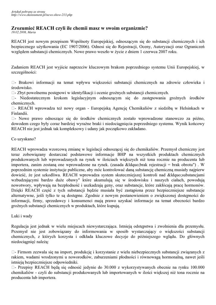 Artykuł pobrany ze strony http://www.ekonsument.pl/news-show-213.php Zrozumieć REACH czyli ile chemii masz w swoim organizmie? 19.02.2008, Maria REACH jest nowym przepisem Wspólnoty Europejskiej, odnoszącym się do substancji chemicznych i ich bezpiecznego użytkowania (EC 1907/2006). Odnosi się do Rejestracji, Oceny, Autoryzacji oraz Ograniczeń względem substancji chemicznych. Nowe prawo weszło w życie z dniem 1 czerwca 2007 roku. Zadaniem REACH jest wyjście naprzeciw kluczowym brakom poprzedniego systemu Unii Europejskiej, w szczególności: - Brakowi informacji na temat wpływu większości substancji chemicznych na zdrowie człowieka i środowisko. - Zbyt powolnemu postępowi w identyfikacji i ocenie groźnych substancji chemicznych. - Niedostatecznym krokom legislacyjnym odnoszącym się do zastępowania groźnych środków chemicznych. - REACH wprowadza też nowy organ - Europejską Agencję Chemikaliów z siedzibą w Helsinkach w Finlandii. - Nowe prawo odnoszące się do środków chemicznych zostało wprowadzone stanowczo za późno, dowodem czego były coraz bardziej wyraźne braki i niedociągnięcia poprzedniego systemu. Wynik końcowy REACH nie jest jednak tak kompleksowy i udany jak początkowo zakładano. Co uzyskano? REACH wprowadza wzorcową zmianę w legislacji odnoszącej się do chemikaliów. Przemysł chemiczny jest teraz zobowiązany dostarczać podstawowe informacje BHP na wszystkich produktach chemicznych produkowanych lub wprowadzanych na rynek w ilościach większych niż tona rocznie na producenta lub importera, zanim zostaną one wprowadzone na rynek. (zasada “brak rejestracji = brak obrotu") . W poprzednim systemie instytucje publiczne, aby móc kontrolować daną substancję chemiczną musiały najpierw dowieść, że jest szkodliwa. REACH wprowadza system skuteczniejszej kontroli nad “substancjami wzbudzającymi bardzo duże obawy" które akumulują się w środowisku i naszych ciałach, powodują nowotwory, wpływają na bezpłodność i uszkadzają geny, oraz substancje, które zakłócają pracę hormonów. Dzięki REACH część z tych substancji będzie musiała być zastąpiona przez bezpieczniejsze substancje alternatywne, jeśli tylko te są dostępne. Zgodnie z nowym postanowieniem o zwiększonej dostępności do informacji, firmy, sprzedawcy i konsumenci mają prawo uzyskać informacje na temat obecności bardzo groźnych substancji chemicznych w produktach, które kupują. Luki i wady Regulacja jest jednak w wielu miejscach niewystarczająca. Istnieją odstępstwa i zwolnienia dla przemysłu. Przemysł nie jest zobowiązany do informowania w sposób wystarczający o większości substancji chemicznych, z których korzysta i odkłada kluczowe decyzje do późniejszego wglądu. Do głównych niedociągnięć należą: - Firmom zezwala się na import, produkcję i korzystanie z wielu niebezpiecznych substancji związanych z rakiem, wadami wrodzonymi u noworodków, zaburzeniami płodności i równowagą hormonalną, nawet jeśli istnieją bezpieczniejsze odpowiedniki. - Przepisy REACH będą się odnosić jedynie do 30.000 z wykorzystywanych obecnie na rynku 100.000 chemikaliów - czyli do substancji produkowanych lub importowanych w ilości większej niż tona rocznie na producenta lub importera. - W dodatku z powodu braków w systemie, podstawowe informacje będą wymagane jedynie względem 60% ze wspomnianych 30.000 substancji, mimo że odpowiednie organy mogłyby zarządać więcej. Informacje na tych substancjach będą najprawdopodobniej zbyt szczątkowe, żeby określić czy dana substancja jest w istocie niebezpieczna. - Decyzja o stałym wymogu względem przemysłu nakazującym zastępowanie substancji chemicznych, które mogą naśladować hormony (tzw. dysruptery endokrynne EDs) bezpieczniejszymi odpowiednikami, jeśli takie istnieją, została odłożona na przyszłość. Substancje w produktach Celem regulowania substancji w towarach REACH rozróżnia ich dwa typy: - produkty zawierające substancje przeznaczone do uwolnienia - produkty zawierające substancje wzbudzające bardzo duże obawy. REACH zobowiązuje do rejestracji substancji znajdujących się w produktach przeznaczonych do uwolnienia podczas użytkowania w zwykłych lub przewidywalnych warunkach (np. świece zapachowe). Wspomniane substancje muszą być rejestrowane, jeśli w okresie roku zawierają się w produktach w ilości większej niż tona na producenta lub importera (Artykuł 7.1). Jeśli substancje wzbudzające bardzo duże obawy obecne są w produktach w ilościach przekraczających określoną normę koncentracji, według przepisów REACH substancje takie powinny być zgłoszone to Agencji (Artykuł 7.2), z wyłączeniem przypadków gdy narażenie na kontakt z ludźmi lub środowiskiem może zostać wykluczony podczas użytkowania zgodnego z przeznaczeniem, z włączeniem utylizacji (Artykuł 7.3). W takich przypadkach zasady bezpieczeństwa powinny zostać zapewnione, a informacje powinny być dostępne na żądanie klienta. Do przykładów substancji w produktach, o których należy informować, można zaliczyć lakier bezbarwny na drewnianym stole. Komisja, państwa członkowskie, przemysł i organizacje pozarządowe wciąż prowadzą dyskusje odnośnie wprowadzenia 0,1% progu na artykuły wyprodukowane z różnych jednolitych części. Na przykład w przypadku obuwia do biegania, gdzie pokrycie buta może być odróżnione od reszty, fakt czy koncentracja barwników w pokryciu jest obliczana w odniesieniu do samego pokrycia, czy do całego buta może sprawić dużą różnicę. Problem ten jest zawarty w niewiążącym dokumencie - przewodniku, który jest obecnie na ukończeniu. Swoistym zabezpieczeniem, jest możliwość rejestracji przez Agencję każdej substancji znajdującej się w produkcie, w przypadku gdy uzna ona, że jej uwolnienie mogłoby stanowić niebezpieczeństwo dla zdrowia ludzi lub stanu środowiska, pod warunkiem, że substan