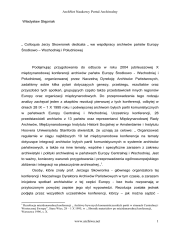ArchNet Naukowy Portal Archiwalny Władysław Stępniak „ Colloquia Jerzy Skowronek dedicata „ we współpracy archiwów państw Europy Środkowo – Wschodniej i Południowej Podejmując przygotowania do odbycia w roku 2004 jubileuszowej X międzynarodowej konferencji archiwów państw Europy Środkowo - Wschodniej i Południowej, organizowanej przez Naczelną Dyrekcję Archiwów Państwowych, zadaliśmy sobie kilka pytań dotyczących genezy, przebiegu, rezultatów oraz przyszłości tych spotkań, grupujących często także przedstawicieli innych regionów Europy oraz organizacji międzynarodowych. Do przeprowadzenia tego rodzaju analizy zachęcał jeden z akapitów rezolucji pierwszej z tych konferencji, odbytej w dniach 28 IX – 1 X 1995 roku i poświęconej archiwom byłych partii komunistycznych w państwach Europy Centralnej i Wschodniej. Uczestnicy konferencji, 26 przedstawicieli archiwów z 13 państw oraz reprezentanci Międzynarodowej Rady Archiwów, Międzynarodowego Instytutu Historii Socjalnej w Amsterdamie i Instytutu Hoovera Uniwersytetu Stanforda stwierdzili, że uznają za celowe: „ Organizować regularnie w ciągu najbliższych 10 lat międzynarodowe konferencje na tematy dotyczące integracji archiwów byłych partii komunistycznych w systemie archiwów państwowych, a także na inne tematy, wspólne i specyficzne zarazem z zakresu archiwistyki i polityki archiwalnej w państwach Europy Centralnej i Wschodniej. Jest to ważny, konieczny warunek przygotowania i przeprowadzenia ogólnoeuropejskiego zbliżenia i integracji na płaszczyźnie archiwalnej „1. Osoby, które znały prof. Jerzego Skowronka - głównego organizatora tej konferencji i Naczelnego Dyrektora Archiwów Państwowych w tym czasie, a zarazem inicjatora spotkań archiwistów z tej części Europy - bez trudu rozpoznają w przytoczonym powyżej zapisie jego styl wypowiedzi. Rezolucja została jednak podjęta przez wszystkich uczestników konferencji, którzy – jak można sądzić - 1 Rezoliucja mieżdunarodnoj konferencji „ Archiwy bywszych komunisticzesskich partii w stranach Centralnoj i Wostocznoj Ewropy”, Stara Wies, 28 – 1 X 1995, w :, Sbornik materialow po mieżdunarodnoj konferencji, Warszawa 1996, s. X. www.archiwa.net 1 ArchNet Naukowy Portal Archiwalny przyjęli do wiadomości stanowisko Skowronka, że trzeba będzie wielu konferencji, by omówić było można specyficzną sytuację archiwów na obszarze Europy, na którym wystąpiły zmiany ustrojowe, w wyniku upadku tzw. systemu realnego socjalizmu. Wzmianka o potrzebie zorganizowania dziesięciu konferencji oraz problemach integracji europejskiej świadczy wyraźnie o tym, że jednym z celów podejmowanej działalności było zbliżenie archiwów państw Europy Środkowo – Wschodniej i Południowej do archiwów na pozostałej części kontytnentu. Wskazana zaś perspektywa czasowa, to przewidywana wtedy – i zrealizowana obecnie w roku 2004 – data wstąpienia do Unii Europejskiej wielu spośród państw aktywnie uczestniczących w tych konferencjach. Ogólnoeuropejskie zbliżenie i integracja na płaszczyźnie archiwalnej została więc z naszej strony rozpoczęta od problematyki archiwów partyjnych. Z zadowoleniem stwierdzić można, że sformułowane na konferencji w Starej Wsi zasady postępowania wobec nich zostały w bardzo poważnym stopniu zrealizowane. W pierwszej kolejności uwaga ta dotyczy włączenia archiwów partyjnych do systemu archiwów państwowych wraz z zastosowaniem wobec nich analogicznych podstaw prawnych działalności. Widziano w tym wkład archiwów do procesu demokratyzacji życia społeczeństw Europy Środkowo – Wschodniej i Południowej. Zakładano równocześnie konieczność dalszej współpracy i kontaktów, obejmujących opracowanie standardów opisu materiałów archiwalnych, wytworzonych przez partie komunistyczne wraz ze zbadaniem możliwości zastosowanie w tych pracach komputerowych systemów informacyjno - badawczych, organizowanie specjalistycznych seminariów czy też poszukiwanie na arenie międzynarodowej wsparcia finansowego. Nie wszystkie z tych ambitnych zamierzeń zostały zrealizowane. W tych warunkach z zadowoleniem przyjąć należy propozycję prof. W. P. Kozłowa – szefa archiwów Federacji Rosyjskiej – zorganizowania na Międzynarodowym Kongresie Archiwów w Wiedniu seminarium na temat b. archiwów partyjnych. Sadzę, że opublikowane przez Naczelną Dyrekcję Archiwów Państwowych materiały konferencji w Starej Wsi stanowić powinny punkt wyjścia do oceny aktualnie istniejącej sytuacji w tym zakresie i będą przydatne dla uczestników spotkania w stolicy Austrii. Kolejna konferencja z tego cyklu zorganizowana została w dniach 28 – 30 czerwca 1996 roku w Puławach i była poświęcona sytuacji archiwów w www.archiwa.net 2 ArchNet Naukowy Portal Archiwalny naszym regionie w dobie przekształceń prawnoustrojowych 2. Organizatorzy konferencji, w której tym razem uczestniczyło 44 archiwistów z 12 krajów, wraz z przedstawicielami MRA i innych organizacji międzynarodowych, przeprowadzili – nawiązując do decyzji konferencji w Starej Wsi – specjalną ankietę, zatytułowaną „ Archiwa w okresie posttotalitarnym „. Obrady konferencji skoncentrowane były na problemach ustawodawstwa archiwalnego w dobie transformacji prawno ustrojowych, funkcjonowaniu archiwów zakładowych w warunkach zachodzących zmian oraz roli i zadań służ archiwalnych w nowej sytuacji prawno ustrojowej Europy Środkowo – Wschodniej i Południowej. Uczestnicy uznali, że ich spotkanie stało się ważnym etapem w zrozumieniu wspólnych elementów i narodowych odmienności procesów reformowania służb archiwalnych w państwach regionu. Stwierdzono, że ustawodawstwo archiwalne przyjmowane w tych państwach w coraz większym stopniu odpowiada powszechnym w Europie normom prawnym, szczególnie w zakresie ochronnej funkcji państwa w odniesieniu do dziedzictwa archiwal