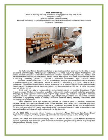 Miód drahimski (2) Produkt wpisany na Listę Produktów Tradycyjnych w dniu 1.06.2006r. Kategoria – miody Gmina Czaplinek, powiat drawski Wniosek złoŜony do Urzędu Marszałkowskiego Województwa Zachodniopomorskiego przez Grzegorza Fujarskiego Autor zdjęcia : Grzegorz Fujarski W XVI wieku Ziemia Czaplinecka leŜała w granicach państwa polskiego i wchodziła w skład Starostwa Drahimskiego, stanowiącego najbardziej na północ wysuniętą część Wielkopolski. Jak podają źródła historyczne, w starostwie drahimskim i okolicy - "bartników było jedenastu, kaŜdy z nich na rzecz Drahimia dawał pół kłody miodu na rok. Ponad dziewięćset pszczelich rodzin zbierało nektar z Puszczy Drawskiej" (źródło - „Czplinek i Starostwo Drahimskie”, wyd. Koszalin 1985r. RównieŜ źródła historyczne z XIX w. potwierdzają tradycję pszczelarstwa na tych terenach. W niemieckojęzycznym Czasopiśmie „Unser Pommerland”, zeszycie nr 5 z 1932r., który w całości poświęcony został Ziemi Czaplinieckiej moŜna przeczytać, Ŝe w latach 1824-1825 w leŜącej niedaleko Czaplinka wsi Flacksee (obecnie Jeziorna), jeden z rolników posiadał od 106 do 116 rojów pszczelich oraz od 153 do 192 uli. Dziś teren ten leŜy w województwie zachodniopomorskim, w obrębie Drawskiego Parku Krajobrazowego. Obfituje w bogactwo wszelkiej roślinności i niezliczoną ilość poŜytków pszczelich. Znajdują się tutaj ogromne wrzosowiska, piękne aleje starych lip, akacjowe zagajniki i barwiące krajobraz na Ŝółto i czerwono uprawy rzepaku i gryki. Dzięki tradycji właśnie oraz niezwykłej czystości środowiska i wyjątkowej trosce o rodziny pszczele, równieŜ dzisiaj moŜemy kosztować miód pochodzący z tych terenów. Miód drahimski moŜe być wytwarzany jedynie na obszarze gmin : Czaplinek, Wierzchno, Barwice, Borne Sulinowo oraz Nadleśnictwa Borne Sulinowo. Pod nazwą miód drahimski moŜe być sprzedawanych pięć róŜnych miodów : gryczany, rzepakowy, wrzosowy, lipowy oraz wielokwiatowy. Do jego cech specyficznych naleŜy wysoka zawartość cukrów redukujących, pyłku przewodniego oraz obecność pyłków unikatowych roślin reliktowych i endemicznych. W roku 2003 Miód drahimski zdobył I miejsce w konkursie „Nasze Kulinarne Dziedzictwo-Smaki Regionów” w kategorii „Produkty i przetwory pochodzenia zwierzęcego”, a w roku 2008 „Perłę”. W roku 2011 Miód drahimski odnosi kolejny sukces. W dniu 14 czerwca 2011r. Komisja Europejska ogłasza rejestrację tego produktu, jako chronione oznaczenie geograficzne (ChOG), przyznając tym samym prawną ochronę unijną.
