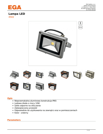 EGA Spółka z o.o. Spółka Komandytowa ul. Rzeczna 1, Nowa Wieś 83-200 Starogard Gdański tel. 58 56 300 80 Lampa LED 4502 Opis Nieprzemakalna aluminowa konstrukcja IP65 Ledowa dioda o mocy 10W Szkło odporne na stłuczenie Zabezpieczony przewód Odpowiednie do użytkowania na zewnątrz oraz w pomieszczeniach Kolor : srebrny Parameters 1/2 EGA Spółka z o.o. Spółka Komandytowa ul. Rzeczna 1, Nowa Wieś 83-200 Starogard Gdański tel. 58 56 300 80 Napięcie wejściowe [V]85-265 Moc [W]10 Jasność świecenia [lm]800 Żywotność [h]50 000 Barwa świecenia [K]6500 Kąt świecenia [stopnie]120 Współczynnik CRI [Ra]Ra>72 Variants No. Catalog no. 1 EAN Power Luminous flux(Lm) Luminous efficiency 4502 10W 800 Lm 90 Lm/W 2 4503 20W 1600 Lm 90 Lm/W 3 4504 30W 2400 Lm 90 Lm/W 4 4505 50W 4000 Lm 90 Lm/W 2/2 Powered by TCPDF (www.tcpdf.org)