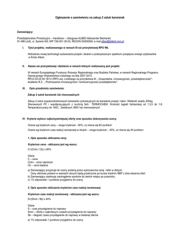 Ogłoszenie o zamówieniu na zakup 2 sztuk barwiarek Zamawiający: Przedsiębiorstwo Produkcyjno – Handlowo – Usługowe ALBED Aleksander Bednarek; 91-496 Łódź, ul. Syrenki 6/6; NIP 726-001-30-03, REGON 00455556; e-mail:[email protected] I. Tytuł projektu, realizowanego w ramach III osi priorytetowej RPO WŁ Wdrożenie nowej technologii wytwarzania przędz i dzianin o podwyższonym spektrum przepływu energii użytkownika w firmie Albed.. . II. Nazwa osi priorytetowej i działania w ramach których realizowany jest projekt: W ramach Europejskiego Funduszu Rozwoju Regionalnego oraz Budżetu Państwa, w ramach Regionalnego Programu Operacyjnego Województwa Łódzkiego na lata 2007-2013. RPLD.03.02.00-18/12 (RPO woj. Łódzkiego oś priorytetowa III: ,,Gospodarka, innowacyjność, przedsiębiorczość"; działanie III.2.: ,,Podnoszenie innowacyjności i konkurencyjności przedsiębiorstw". III. Opis przedmiotu zamówienia: Zakup 2 sztuk barwiarek lub równoważnych Zakup 2 sztuk wysokociśnieniowych barwiarek cyrkulacyjnych do barwienia przędz i taśm. Wielkość wsadu 200kg. Sterowanych PC i współpracujących z kuchnią farb TERMOCHEM. Krotność kąpieli farbiarskiej od 1:3,5 do 1:8. Temperatura pracy do 140C. Zasilanych 380V lub równoważnych IV. Kryteria wyboru najkorzystniejszej oferty oraz sposobu dokonywania oceny. Ocena wg kryterium ceny – ranga kryterium - 60%, co równa się 60 punktom Ocena wg kryterium czas reakcji serwisowej w dniach – ranga kryterium – 40%, co równa się 40 punktom 1. Opis sposobu obliczania ceny: Kryterium cena - obliczana jest wg wzoru: C=(Cmin / Cb) x 60% Gdzie: C – cena Cmin – cena najniższa Cb – cena badana a) Zamawiający przyjmuje do oceny podaną przez wykonawców cenę netto w złotych. Ceny ofertowe podane w walutach obcych będą przeliczone po kursie średnim NBP z dnia otwarcia ofert. b) Zamawiający zastosuje zaokrąglenie wyników do dwóch miejsc po przecinku. c) 1% odpowiada 1 punktowi przyjętemu do oceny. 2. Opis sposobu obliczania kryterium czas reakcji serwisowej: Kryterium czas reakcji serwisowej - obliczana jest wg wzoru: S=(Smin / Sb) x 40% Gdzie: S – czas przystąpienia do naprawy Smin – oferta z najkrótszym czasem przystąpienia do naprawy Sb – długość czasu przystąpienie do naprawy w badanej ofercie a) 1% odpowiada 1 punktowi przyjętemu do oceny. V. Termin wykonania zamówienia: 15.12.2014r. VI. Opis sposobu przygotowania ofert: Drogą e-mail na adres: [email protected] VII. Miejsce oraz termin składania i otwarcia ofert: Na spływ ofert czekamy do dnia 05.11.2014r. godz. 15:00 w siedzibie firmy ALBED mieszczącej się w Łodzi przy ul. Plonowa 13B po otrzymania ofert na adres: [email protected] Zamawiający zastrzega sobie prawo unieważnienia oferty bez podania przyczyny. VIII.Opis warunków udziału w postępowaniu oraz sposobu dokonywania oceny spełnienia tych warunków. O zamówienie mogą się ubiegać Wykonawcy, którzy: 1) posiadają niezbędną wiedzę i doświadczenie do wykonania zamówienia, 2) dysponują niezbędnym potencjałem technicznym do wykonywania zamówienia 3) dysponują osobami zdolnymi do wykonywania zamówienia, 4) nie podlegają wykluczeniu z postępowania o udzieleniu zamówienia (art. 24 ust. 1 i 2 ustawy). IX. Projekt współfinansowany ze środków Europejskiego Funduszu Rozwoju Regionalnego oraz Budżetu Państwa.