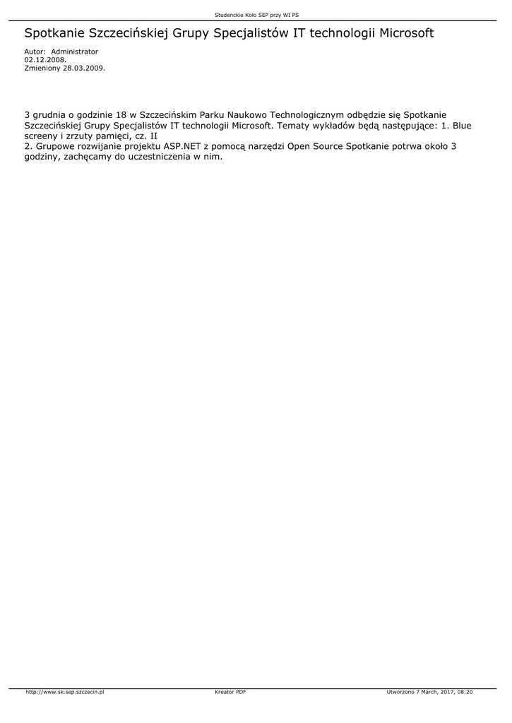 Studenckie Koło SEP przy WI PS Spotkanie Szczecińskiej Grupy Specjalistów IT technologii Microsoft Autor: Administrator 02.12.2008. Zmieniony 28.03.2009. 3 grudnia o godzinie 18 w Szczecińskim Parku Naukowo Technologicznym odbędzie się Spotkanie Szczecińskiej Grupy Specjalistów IT technologii Microsoft. Tematy wykładów będą następujące: 1. Blue screeny i zrzuty pamięci, cz. II 2. Grupowe rozwijanie projektu ASP.NET z pomocą narzędzi Open Source Spotkanie potrwa około 3 godziny, zachęcamy do uczestniczenia w nim. http://www.sk.sep.szczecin.pl Kreator PDF Utworzono 7 March, 2017, 08:20