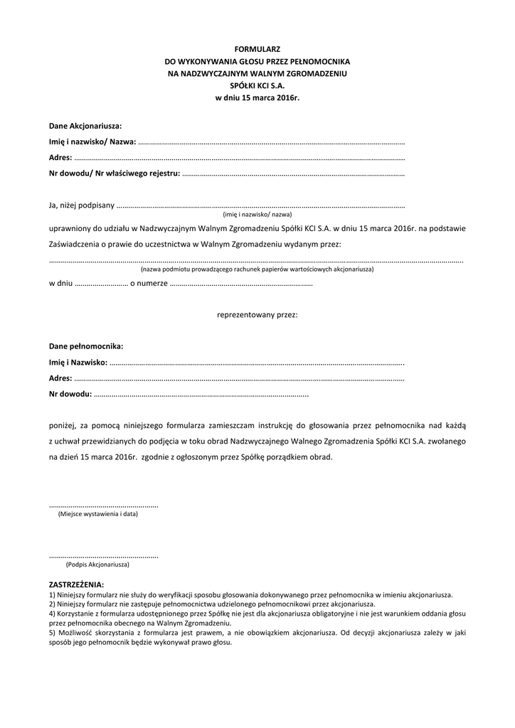 FORMULARZ DO WYKONYWANIA GŁOSU PRZEZ PEŁNOMOCNIKA NA NADZWYCZAJNYM WALNYM ZGROMADZENIU SPÓŁKI KCI S.A. w dniu 15 marca 2016r. Dane Akcjonariusza: Imię i nazwisko/ Nazwa: ………………………………………………………………………………………….…………….…………… Adres: ……………………………………………………………………………………………………………..………………………………….. Nr dowodu/ Nr właściwego rejestru: …………………………………………………………………………………………….…… Ja, niżej podpisany ………………………………………………………………………………………………………………………….…… (imię i nazwisko/ nazwa) uprawniony do udziału w Nadzwyczajnym Walnym Zgromadzeniu Spółki KCI S.A. w dniu 15 marca 2016r. na podstawie Zaświadczenia o prawie do uczestnictwa w Walnym Zgromadzeniu wydanym przez: ………………………………………………………..…………………………………………………………………………………………………………………………….. (nazwa podmiotu prowadzącego rachunek papierów wartościowych akcjonariusza) w dniu ……………………… o numerze ……………………………………………………………… reprezentowany przez: Dane pełnomocnika: Imię i Nazwisko: ………………………………………………….……………………………………………………………………………... Adres: …………………………………………………………………………………………………………….…………………………………… Nr dowodu: ……………………………………………………………………………………………... poniżej, za pomocą niniejszego formularza zamieszczam instrukcję do głosowania przez pełnomocnika nad każdą z uchwał przewidzianych do podjęcia w toku obrad Nadzwyczajnego Walnego Zgromadzenia Spółki KCI S.A. zwołanego na dzień 15 marca 2016r. zgodnie z ogłoszonym przez Spółkę porządkiem obrad. ………………………………………………. (Miejsce wystawienia i data) ………………………………………………. (Podpis Akcjonariusza) ZASTRZEŻENIA: 1) Niniejszy formularz nie służy do weryfikacji sposobu głosowania dokonywanego przez pełnomocnika w imieniu akcjonariusza. 2) Niniejszy formularz nie zastępuje pełnomocnictwa udzielonego pełnomocnikowi przez akcjonariusza. 4) Korzystanie z formularza udostępnionego przez Spółkę nie jest dla akcjonariusza obligatoryjne i nie jest warunkiem oddania głosu przez pełnomocnika obecnego na Walnym Zgromadzeniu. 5) Możliwość skorzystania z formularza jest prawem, a nie obowiązkiem akcjonariusza. Od decyzji akcjonariusza zależy w jaki sposób jego pełnomocnik będzie wykonywał prawo głosu. Instrukcja do głosowania dla pełnomocnika UCHWAŁA NR … Nadzwyczajnego Walnego Zgromadzenia KCI S.A. z siedzibą w Krakowie („Spółka”) z dnia 15 marca 2016 roku w sprawie wyboru Przewodniczącego Walnego Zgromadzenia § 1. Dokonuje się wyboru Pana/Pani ................................... na Przewodniczącego Walnego Zgromadzenia. § 2. Uchwała wchodzi w życie z chwilą podjęcia. Za Przeciw Zgłoszenie sprzeciwu1 Wstrzymuję się Według uznania pełnomocnika Liczba głosów: Liczba głosów: Liczba głosów: Liczba głosów: Inne: 1 Treść sprzeciwu: ………………………………………………………………………………………………………………………………………………………… ……………………………………………………………………………………………………………………………………………………………………………………… ……………………………………………………………………………………………………………………………………………………………………………………… ………………………………………………………………………………………………………………………………………………………………………………………. Dodatkowa instrukcja Akcjonariusza dotycząca sposobu głosowania przez pełnomocnika w sprawie podjęcia przedmiotowej uchwały Treść instrukcji: ……………………………………………………………………………………………………………………………………………………………………………………… ……………………………………………………………………………………………………………………………………………………………………………………… ……………………………………………………………………………………………….…………………………………………………………………………………….. …………….……………………………………………………… (miejscowość, data i podpis Akcjonariusza) UCHWAŁA NR … Nadzwyczajnego Walnego Zgromadzenia KCI S.A. z siedzibą w Krakowie („Spółka”) z dnia 15 marca 2016 roku w sprawie przyjęcia porządku obrad § 1. Postanawia się przyjąć następujący porządek obrad Walnego Zgromadzenia Spółki: 1. Otwarcie Walnego Zgromadzenia. 2. Wybór Przewodniczącego Walnego Zgromadzenia. 3. Stwierdzenie prawidłowości zwołania Walnego Zgromadzenia oraz jego zdolności do podejmowania uchwał. 4. Przyjęcie porządku obrad Walnego Zgromadzenia. 5. Podjęcie uchwały w sprawie uchylenia uchwały Nadzwyczajnego Walnego Zgromadzenia Spółki z dnia 10 lipca 2015 r. nr 3 w sprawie scalenia akcji Spółki oraz zmiany Statutu Spółki 6. Podjęcie