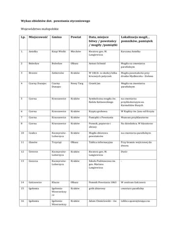 Wykaz obiektów dot. powstania styczniowego Województwo małopolskie Lp. Miejscowość Gmina Powiat Data, miejsce bitwy / powstańcy / mogiły /pamiątki Lokalizacja mogił, , pomników, pamiątek 1. Antolka Książ Wielki Miechów Kwatera gen. M. Langiewicza Karczma Antolka 2 Bolesław Bolesław Olkusz Antoni Schmid Mogiła na cmentarzu parafialnym 3 Brzezie Zabierzów Kraków W 1863r. w okolicy kilka krwawych potyczek Mogiła powstańców przy drodze Mydlniczka - Zielona 4 Czarny Dunajec Czarny Dunajec Nowy Targ Ciszek Jan Mogiła na cmentarzu parafialnym 5 Czerna Krzeszowice Kraków Symboliczna mogiła św. Rafała Kalinowskiego na cmentarzu przyklsztornyym oo. Karmelitów Bosych 6 Czerna Krzeszowice Kraków Krypta grobowa W Kaplicy św. Jana od Krzyża 7 Czerna Krzeszowice Kraków Pamiątki z Powstania Muzeum przyklasztorne 8 Czerna Krzeszowice Kraków Pomnik, popiersie i obrazy Na dziedzińcu. W klasztorze 10 Czulice KocmyrzówLuborzyca Kraków Mogiła zbiorowa powstańców na cmentarzu parafialnym 11 Glanów Trzyciąż Olkusz Tablica informacyjna Przy bramie wejściowej do dworu 12 Goszcza KocmyrzówLuborzyca Kraków Kwatera gen. M. Langiewicza Dwór 13 Goszcza KocmyrzówLuborzyca Kraków Szkoła Podstawowa im. gen. Mariana Langiewicza - 14 Golczowice Klucze Olkusz Pomnik Powstania 1863 W centrum Golczowic 15 Igołomia IgołomiaWawrzeńczy ce Kraków grób zbiorowy cmentarz parafialny 16 Igołomia IgołomiaWawrzeńczy Kraków Adam Chmielowski – św. tablica upamiętniająca na ce Brat Albert ścianie kościoła parafialnego 17 Igołomia IgołomiaWawrzeńczy ce Kraków Adam Chmielowski – św. Brat Albert Muzeum św. Brata Alberta – na terenie klasztoru sióstr Albertynek 18 Igołomia IgołomiaWawrzeńczy ce Kraków Szkoła Podstawowa im. Bohaterów Powstania Styczniowego - 19 Igołomia IgołomiaWawrzeńczy ce Kraków Gimnazjum im. Świętego Brata Alberta - 20 Imbramowice Trzyciąż Olkusz 15 sierpnia 1863 pod Glanowem i Imbramowicami Mogiła zbiorowa na cmentarzu parafialnym 21 Imbramowice Trzyciąż Olkusz Leon Bończa Rutkowski i Stanisław Novak Mogiła na cmentarzu parafialnym 22 Jaksice Jaksice Miechów Kapliczka ufundowana na pamiątkę przemarszu wojsk Apolinarego Kurowskiego Przy drodze prowadzącej przez wioskę w kierunku Przesławic 23 Kamieńczyce Jaksice Miechów Kapliczka ufundowana na pamiątkę przemarszu wojsk Apolinarego Kurowskiego Przy drodze prowadzącej przez wioskę blisko młyna 24 Klimontów Proszowice Proszowice Kamienny krzyż wystawiony w miejscu potyczki oddziału powstańców 1863 z Moskalami Przy drodze na wprost Kościoła 25 Koszyce Koszyce Proszowice Władysław Sikorski Mogiła na cmentarzu parafialnym 26 Kościelec Proszowice Proszowice Mogiła zbiorowa powstańców na cmentarzu parafialnym 27 Kościelec Proszowice Proszowice Bronisław Cywiński Mogiła na cmentarzu parafialnym 28 Kraków Kraków Kraków Zmarli w krakowskich szpitalach i domach prywatnych w wyniku ran odniesionych w bitwach i potyczkach pod Miechowem, Pieskową Skałą, Skałą, Cmentarz Rakowicki. Kwatera Ra Polonia Szczepanowicami i Igołomią 29 Krzykawka Bolesław Olkusz Pomnik powstańców Znajduje się przy niebieskim szlaku turystycznym prowadzącym ze Sławkowa poprzez Krzykawkę w kierunku Olkusza 30 Krzykawka Bolesław Olkusz por. Elia Marchetti Mogiła na cmentarzu parafialnym 31 Książ Mały Książ Wielki Miechów Mogiła powstańców na cmentarzu parafialnym 32 Kwaśniów Górny Klucze Olkusz Kapliczka św. Antoniego Przy głównej drodze w pobliżu nowego kościoła 33 Kwaśniów Górny Klucze Olkusz Kapliczka na Borach Na polanie przy skrzyżowaniu drogi z Kwaśniowa do Pilicy, za starym traktem handlowym wiodącym od Krzywopłotów do Ogrodzieńca 34 Luborzyca KocmyrzówLuborzyca Kraków Józef Jedynak Mogiła na cmentarzu parafialnym 35 Luborzyca KocmyrzówLuborzyca Kraków Pomnik – Poległym za Ojczyznę Na placu w pobliżu kościoła 36 Marchocice Racławice Miechów Kwatera gen. M. Langiewicza Dwór 37 Miechów Miechów Miechów Płyta pamiątkowa Na cmentarzu rzymskokatolickim 38 Miechów Miechów Miechów Pomnik Na mogile poległych powstańców na cmentarzu rzymsko-katolickim 39 Miechów Miechów Miechów Wincenty Piątkowski Pomnik nagrobny na cmentarzu rzymskokatolickim 40 Miechów Miechów Miechów Maksymilian Francki Mogiła na cmentarzu rzymsko-katolickim 41 Miechów Miechów Miechów Honorata Schabowska Płyta nagrobna żony weterana powstania styczniowego na cmentarzu rzymsko-katolickim 42 Miechów Miechów Miechów Stanisław Janiszewski Mogiła na cmentarzu rzymsko-katolickim 43 Miechów Miechów Miechów Waleria Wasilewska Grobowiec żony weterana powstania styczniowego na cmentarzu rzymsko- katolickim 44 Miechów Miechów Miechów Wincenty Szczepka Mogiła na cmentarzu rzymsko-katolickim 45 Miechów Miechów Miechów Pomnik Na rynku 46 Miechów Miechów Miechów Maksymilian Francki Tablica w bazylice miechowskiej obok Kaplicy św. Marii Magdaleny 47 Miechów Miechów Miechów Kołdrasińscy Tablica w bazylice miechowskiej przy przejściu do Grobu Bożego 48 Modlnica Wielka Wieś Kraków kpt. Piotr Tarczewski Mogiła na cmentarzu parafialnym 49 Nowy Sącz Nowy Sącz Nowy Sącz Jan Szopiński Mogiła na cmentarzu przy ul. Rejtana 50 Nowy Targ Nowy Targ Nowy Targ Kaperski Franciszek Studentowicz Józef Groby powstańców na cmentarzu 51 Nowy Targ Nowy Targ Nowy Targ Krzyż pamiątkowy na cmentarzu komunalnym 52 Nowy Targ Nowy Targ Nowy Targ Grobowiec Powstańców i Legionistów pochowany w nim jest m.in. Jan Prus –Ossowski na cmentarzu komunalnym 53 Ochotnica Ochotnica Nowy Targ Kędzierski Władysław Kołodziejski Franciszek Ksawery Kołodziejski Fryderyk Kołodziejski Władysław Tetmajer August Tetmajer Stanisław Groby powstańców na cmentarzu 54 Ojców Skała Olkusz Tablica pamiątkowa Na ścianie budynku Hotelu pod Łokietkiem 55 Ojców Skała Olkusz Izba Pamięci Powstania Styczniowego Muzeum Regionalne 56 Ojców Skała Olkusz