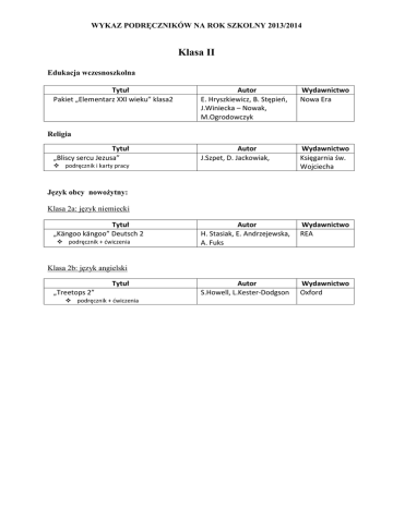 WYKAZ PODRĘCZNIKÓW NA ROK SZKOLNY 2013/2014 Klasa II Edukacja wczesnoszkolna Tytuł Pakiet „Elementarz XXI wieku” klasa2 Autor E. Hryszkiewicz, B. Stępień, J.Winiecka – Nowak, M.Ogrodowczyk Wydawnictwo Nowa Era Autor J.Szpet, D. Jackowiak, Wydawnictwo Księgarnia św. Wojciecha Autor H. Stasiak, E. Andrzejewska, A. Fuks Wydawnictwo REA Autor S.Howell, L.Kester-Dodgson Wydawnictwo Oxford Religia Tytuł „Bliscy sercu Jezusa” podręcznik i karty pracy Język obcy nowożytny: Klasa 2a: język niemiecki Tytuł „Kängoo kängoo” Deutsch 2 podręcznik + ćwiczenia Klasa 2b: język angielski Tytuł „Treetops 2” podręcznik + ćwiczenia WYKAZ PODRĘCZNIKÓW NA ROK SZKOLNY 2013/2014 Klasa III Edukacja wczesnoszkolna Tytuł Pakiet „Raz, dwa, trzy teraz my” kl.3 Autor Praca zbiorowa Wydawnictwo Nowa Era Religia Tytuł „Jezusowa wspólnota serc” podręcznik i karty pracy Autor J.Szpet, D. Jackowiak Wydawnictwo Księgarnia św. Wojciecha Język obcy nowożytny: Klasa 2a: język niemiecki Tytuł „Kängoo kängoo” Deutsch 3 podręcznik + ćwiczenia Autor H. Stasiak, E. Andrzejewska, A. Fuks Wydawnictwo REA Autor A.Worrall, M.Bogucka, D.Sikora- Banasik Wydawnictwo Longman Klasa 2b: język angielski Tytuł „English Adventure 3” podręcznik z ćwiczeniami WYKAZ PODRĘCZNIKÓW NA ROK SZKOLNY 2013/2014 Klasa I Edukacja wczesnoszkolna Tytuł Pakiet „Oto ja” klasa 1 semestr 1 i semestr 2 Autor P.Tkacz, D.Wosianek Wydawnictwo MAC Edukacja Religia Tytuł „Żyjemy w Bożym świecie” podręcznik i karty pracy Autor ks. T.Śmiech, E.Kondrak, B.Nosek Wydawnictwo Jedność Autor L.Zastąpiło, E.Krawczyk, M.Kozubska Wydawnictwo Wydawnictwo Szkolne PWN Autor S.Howell, L.Kester-Dodgson Wydawnictwo Oxford Język obcy nowożytny: Klasa 1a: język niemiecki Tytuł „Język niemiecki. ABC Deutsch” podręcznik z ćwiczeniami cz.1 i 2. Klasa 1 Klasa 1b: język angielski Tytuł „Treetops”1 podręcznik + ćwiczenia WYKAZ PODRĘCZNIKÓW NA ROK SZKOLNY 2013/2014 KLASA IV: PODRĘCZNIKI DLA KLASY IV POWINNY BYĆ ZGODNE Z NOWĄ PODSTAWĄ PROGRAMOWĄ 2012 Przedmiot Tytuł „Język polski 4” Autor Wydawnictwo M.Składanek Operon D.Szaniawska Operon A.Krawczuk-Goluch Operon Podręcznik. Kształcenie kulturowoliterackie „Język polski 4” Język polski Kształcenie językowe. Wiadomości i ćwiczenia dla szkoły podstawowej „Język polski 4” Zeszyt ćwiczeń dla ucznia szkoły podstawowej Seria„Odkrywamy na nowo” OPERON 2012 klasa 4a Język niemiecki klasa 4b Język angielski Historia „Punkt” 4 podręcznik z ćwiczeniami i płytą CD „New English Zone” 1 – wydanie egzaminacyjne podręcznik + ćwiczenia „Wczoraj i dziś” klasa 4 podręcznik + ćwiczenia „Tajemnice przyrody” klasa 4 Przyroda podręcznik + ćwiczenia ( 2 części) Atlas. Przyroda „Świat wokół nas” Matematyka Muzyka Plastyka „Matematyka z kluczem” podręcznik cz. I, cz.II + ćwiczenia „I gra muzyka” podręcznik dla klas IV-VI WSiP R. Nolasco, D. Newbold Oxford G.Wojciechowski Nowa Era M.Marko-Worłowska, F.Szlajfer, J.Stawarz Nowa Era nowe wydanie M. Braun, A. Mańkowska, M. Paszyńska Nowa Era Nowa Era M.Gromek, G.Kilbach Nowa Era Podręczniki nie obowiązują Zajęcia techniczne „Jak to działa ?” Zajęcia komputerowe „Ciekawi świata” Religia A.Potapowicz podręcznik + dodatek „Rysunek techniczny” podręcznik dla klas IV-VI „Miejsce pełne BOGActw”” podręcznik L.Łabecki, M.Łabecka Nowa Era J.Dulian Operon ks. K.Mielnicki, E.Kondrak, B.Nosek Jedność WYKAZ PODRĘCZNIKÓW NA ROK SZKOLNY 2013/2014 KLASA V: Przedmiot Tytuł Autor „Język polski 5” Podręcznik. Kształcenie kulturowoliterackie „Język polski 5” Język polski klasa 5a Język niemiecki klasa 5b Język angielski Historia Kształcenie językowe. Wiadomości i ćwiczenia dla szkoły podstawowej Matematyka Muzyka Plastyka Zajęcia techniczne Zajęcia komputerowe Religia M.Składanek Operon D.Szaniawska Operon „Język polski 5” Operon Zeszyt ćwiczeń dla ucznia szkoły podstawowej Seria„Odkrywamy na nowo” OPERON 2012 „Punkt” 5 podręcznik z ćwiczeniami i płytą CD „New English Zone” 2 – wydanie egzaminacyjne podręcznik + ćwiczenia „Wczoraj i dziś” klasa 5 A.Potapowicz WSiP R. Nolasco, D. Newbold Oxford G.Wojciechowski podręcznik + ćwiczenia „Tajemnice przyrody” klasa 5 Przyroda Wydawnictwo podręcznik + ćwiczenia ( 2 części) (kontynuacja) Atlas. Przyroda „Świat wokół nas” „Matematyka z kluczem” klasa 5 podręcznik cz. I, cz.II + ćwiczenia „I gra muzyka” (kontynuacja z klasy IV) podręcznik dla klas IV-VI Nowa Era Janina Ślósarczyk, Ryszard Kozik, Feliks Szlajfer Nowa Era nowe wydanie M. Braun, A. Mańkowska, M. Paszyńska Nowa Era Nowa Era M.Gromek, G.Kilbach Nowa Era Podręczniki nie obowiązują „Jak to działa ?”(kontynuacja z klasy IV) podręcznik + dodatek „Rysunek techniczny” (kontynuacja z klasy IV) „Ciekawi świata” podręcznik dla klas IV-VI „Umiłowani w Jezusie Chrystusie” podręcznik L.Łabecki, M.Łabecka Nowa Era J.Dulian Operon J. Szpet, D. Jackowiak Księgarnia św. Wojciecha WYKAZ PODRĘCZNIKÓW NA ROK SZKOLNY 2013/2014 KLASA VI: Przedmiot Tytuł „Język polski 6” Język polski Podręcznik. Kształcenie kulturowoliterackie „Język polski 6” Autor Wydawnictwo H.Szaniawska, M.Siembor, M.Składanek Operon H.Szaniawska , M.Siembor Operon A.Potapowicz WSiP R. Nolasco, D. Newbold Oxford R. Nolasco, D. Newbold Oxford G.Wojciechowski Nowa Era M. Marko-Worłowska, F. Szlajfer M.Braun, A.Mańkowska, M.Paszyńska Nowa Era M.Braun GWO M.Tomaszewska Rożak J. Szpet, D.Jackowiak Księgarnia św. Wojciecha Kształcenie językowe. Wiadomości i ćwiczenia dla szkoły podstawowej klasa 6a Język niemiecki klasa 6a Język angielski klasa 6b Język angielski Historia Przyroda „Punkt” 6 podręcznik z ćwiczeniami i płytą CD „New English Zone” 2 podręcznik + ćwiczenia „New English Zone” 3 podręczn