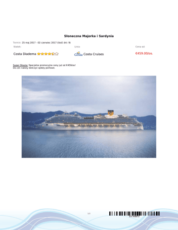 Słoneczna Majorka i Sardynia Termin: 25 maj 2017 - 02 czerwiec 2017 (ilość dni: 9) Statek: Linia: Costa Diadema Cena od: Costa Cruises €459.00/os. Super Okazja: Specjalne promocyjne ceny już od €459/os! Do cen należy doliczyć opłaty portowe. 1/3 EV:45872 TRASA REJSU dzień 1 dzień 2 dzień 3 dzień 4 dzień 5 dzień 6 dzień 7 dzień 8 dzień 9 Data Port Wpłynięcie Wypłynięcie czwartek 25.05.2017 Civitavecchia, Rzym --:-- 19:00 piątek 26.05.2017 La Spezia 09:00 20:00 sobota 27.05.2017 Savona 07:00 17:00 niedziela 28.05.2017 Marsylia 08:00 17:00 poniedziałek 29.05.2017 Barcelona 09:00 19:00 wtorek 30.05.2017 Palma de Mallorca, Majorka 08:00 --:-- środa 31.05.2017 Palma de Mallorca, Majorka --:-- 01:00 czwartek 01.06.2017 Cagliari, Sardynia 08:00 17:00 piątek 02.06.2017 Civitavecchia, Rzym 08:00 --:-- Legenda Włochy Włochy Włochy Francja Hiszpania Hiszpania Hiszpania Włochy Włochy CENNIK Cena katalogowa Cena promocyjna Kabina wewnętrzna na zapytanie od €459.00 Kabina zewnętrzna z oknem na zapytanie od €609.00 Kabina zewnętrzna z balkonem na zapytanie od €709.00 Suite (apartament) na zapytanie Samsara Suite na zapytanie Kabina jednoosobowa na zapytanie 2/3 EV:45872 3 i 4 osoba dorosła w kabinie dziecko do 18 lat jako 3 i 4 osoba w kabinie Opłaty portowe na zapytanie tylko opłaty portowe €150.00 Uwaga! Ceny za osobę w kabinie dwuosobowej. Cena zawiera: zakwaterowanie w kabinie wybranej kategorii; wyżywienie - 3 główne posiłki, przekąski między posiłkami; napoje serwowane do śniadania i w bufetach samoobsługowych; serwis bagażowy podczas wejścia i zejścia ze statku; serwis kabinowy; korzystanie ze wszystkich urządzeń sportowo - rekreacyjnych znajdujących się na pokładzie statku (basen, jacuzzi, sala fitness, itp.); udział we wszystkich imprezach organizowanych na statku (przedstawienia w teatrze, koncerty, programy animacyjne itp.). Cena nie zawiera: kosztów dojazdu do portu; opłat portowych; ewentualnych noclegów w hotelu przed/po rejsie i transferów; wycieczek fakultatywnych w trakcie rejsu; korzystania z barów, mini baru w kabinie oraz napojów zamawianych w restauracji; korzystania z punktów usługowych (fryzjer, pralnia, fotograf, salon piękności i odnowy biologicznej, internet) i wydatków osobistych; napiwków dla obsługi na statku (kwota uzależniona od długości rejsu); ubezpieczenia KL, NNW i bagaż, kosztów wiz (tam gdzie wymagane). Uwagi: Od 01.12.2015 na wszystkich rejsach Costa Cruises (z min. 5 noclegów) można zarezerwować następujące pakiety all inclusive: dla dzieci 4-17 lat Giovani od 15.99€/os./dzień, dla dorosłych: Brindiamo od 24.99€/os./dzień, Piu Gusto od 27.99€/os./dzień, Intenditore od 45.99€/os./dzień (pakiet musi być wykupiony przez każdą osobę zakwaterowaną w kabinie - można zakupić w biurze przed rejsem). Na Państwa życzenie zarezerwujemy przelot, transfery do/z portu, parking, dodatkowe noclegi oraz zadbamy o odpowiednie ubezpieczenie podróżne. 3/3 EV:45872