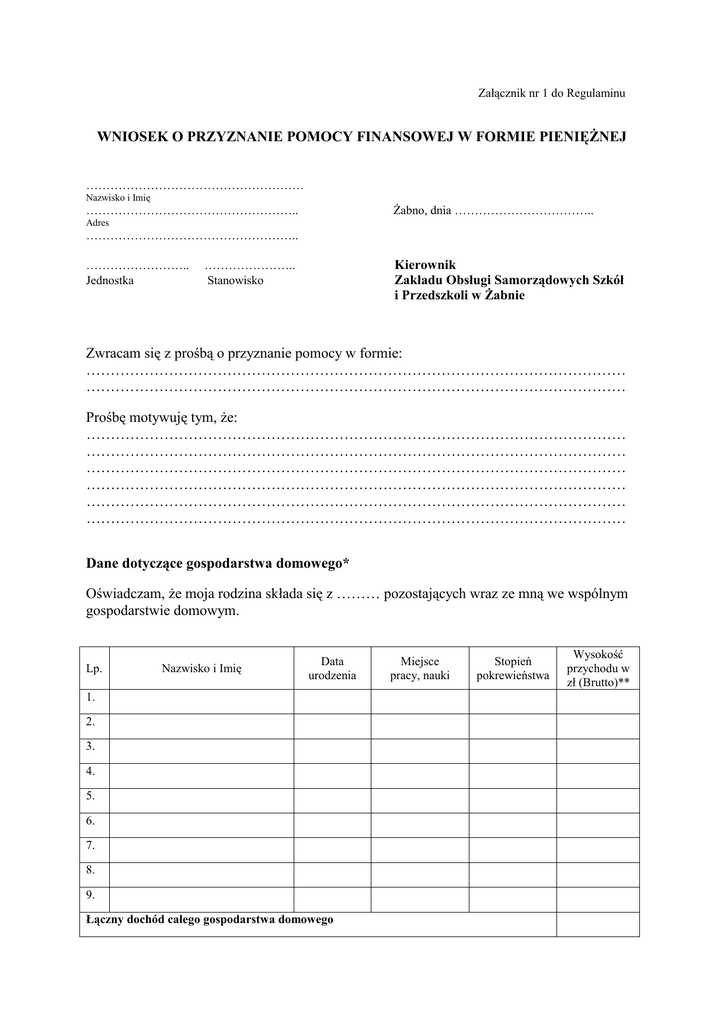 Załącznik nr 1 do Regulaminu WNIOSEK O PRZYZNANIE POMOCY FINANSOWEJ W FORMIE PIENIĘŻNEJ ……………………………………………… Nazwisko i Imię …………………………………………….. Żabno, dnia …………………………….. Adres …………………………………………….. …………………….. Jednostka Kierownik Zakładu Obsługi Samorządowych Szkół i Przedszkoli w Żabnie ………………….. Stanowisko Zwracam się z prośbą o przyznanie pomocy w formie: ………………………………………………………………………………………………… ………………………………………………………………………………………………… Prośbę motywuję tym, że: ………………………………………………………………………………………………… ………………………………………………………………………………………………… ………………………………………………………………………………………………… ………………………………………………………………………………………………… ………………………………………………………………………………………………… ………………………………………………………………………………………………… Dane dotyczące gospodarstwa domowego* Oświadczam, że moja rodzina składa się z ……… pozostających wraz ze mną we wspólnym gospodarstwie domowym. Lp. Nazwisko i Imię Data urodzenia 1. 2. 3. 4. 5. 6. 7. 8. 9. Łączny dochód całego gospodarstwa domowego Miejsce pracy, nauki Stopień pokrewieństwa Wysokość przychodu w zł (Brutto)** Oświadczam, że wysokość przychodu miesięcznego (brutto)** przypadającego na jednego członka rodziny wynosi …………………….. zł ………………………………………………. (słownie) Potwierdzam prawdziwość danych własnoręcznym podpisem i jestem świadom odpowiedzialności karnej, że za składanie fałszywych zeznań, zgodnie z art. 247 K.K. grozi kara pozbawienia wolności do lat pięciu. ……………………………………. (Data i podpis wnioskodawcy) * zgodnie z § 3 ust.2 Regulaminu ZFŚŚ do uprawnionych członków rodziny pozostających na utrzymaniu osoby uprawnionej do korzystania z Funduszu zalicza się: a) dzieci własne, przysposobione oraz przyjęte na wychowanie w ramach rodziny zastępczej do ukończenia 18 roku życia, a jeżeli się kształcą w szkole - do czasu ukończenia nauki, nie dłużej jednak niż do ukończenia 25 lat b) współmałżonkowie ** Przychód jest to kwota brutto ( bez trzynastek i jubileuszy). Wykazuje się przychód z miesiąca poprzedzającego złożenie wniosku do wszystkich rodzajów usług socjalnych.