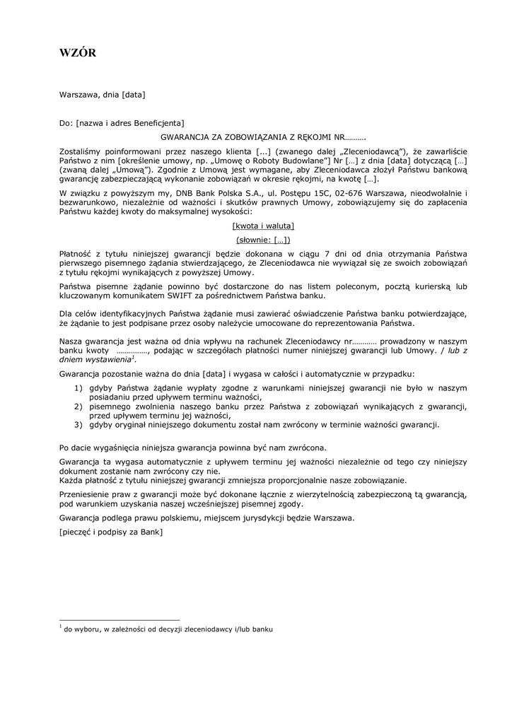 WZÓR Warszawa, dnia [data] Do: [nazwa i adres Beneficjenta] GWARANCJA ZA ZOBOWIĄZANIA Z RĘKOJMI NR………. Zostaliśmy poinformowani przez naszego klienta [...] (zwanego dalej „Zleceniodawcą”), że zawarliście Państwo z nim [określenie umowy, np. „Umowę o Roboty Budowlane”] Nr […] z dnia [data] dotyczącą […] (zwaną dalej „Umową”). Zgodnie z Umową jest wymagane, aby Zleceniodawca złożył Państwu bankową gwarancję zabezpieczającą wykonanie zobowiązań w okresie rękojmi, na kwotę […]. W związku z powyższym my, DNB Bank Polska S.A., ul. Postępu 15C, 02-676 Warszawa, nieodwołalnie i bezwarunkowo, niezależnie od ważności i skutków prawnych Umowy, zobowiązujemy się do zapłacenia Państwu każdej kwoty do maksymalnej wysokości: [kwota i waluta] (słownie: […]) Płatność z tytułu niniejszej gwarancji będzie dokonana w ciągu 7 dni od dnia otrzymania Państwa pierwszego pisemnego żądania stwierdzającego, że Zleceniodawca nie wywiązał się ze swoich zobowiązań z tytułu rękojmi wynikających z powyższej Umowy. Państwa pisemne żądanie powinno być dostarczone do nas listem poleconym, pocztą kurierską lub kluczowanym komunikatem SWIFT za pośrednictwem Państwa banku. Dla celów identyfikacyjnych Państwa żądanie musi zawierać oświadczenie Państwa banku potwierdzające, że żądanie to jest podpisane przez osoby należycie umocowane do reprezentowania Państwa. Nasza gwarancja jest ważna od dnia wpływu na rachunek Zleceniodawcy nr………… prowadzony w naszym banku kwoty ……………, podając w szczegółach płatności numer niniejszej gwarancji lub Umowy. / lub z dniem wystawienia1. Gwarancja pozostanie ważna do dnia [data] i wygasa w całości i automatycznie w przypadku: 1) gdyby Państwa żądanie wypłaty zgodne z warunkami niniejszej gwarancji nie było w naszym posiadaniu przed upływem terminu ważności, 2) pisemnego zwolnienia naszego banku przez Państwa z zobowiązań wynikających z gwarancji, przed upływem terminu jej ważności, 3) gdyby oryginał niniejszego dokumentu został nam zwrócony w terminie ważności gwarancji. Po dacie wygaśnięcia niniejsza gwarancja powinna być nam zwrócona. Gwarancja ta wygasa automatycznie z upływem terminu jej ważności niezależnie od tego czy niniejszy dokument zostanie nam zwrócony czy nie. Każda płatność z tytułu niniejszej gwarancji zmniejsza proporcjonalnie nasze zobowiązanie. Przeniesienie praw z gwarancji może być dokonane łącznie z wierzytelnością zabezpieczoną tą gwarancją, pod warunkiem uzyskania naszej wcześniejszej pisemnej zgody. Gwarancja podlega prawu polskiemu, miejscem jurysdykcji będzie Warszawa. [pieczęć i podpisy za Bank] 1 do wyboru, w zależności od decyzji zleceniodawcy i/lub banku