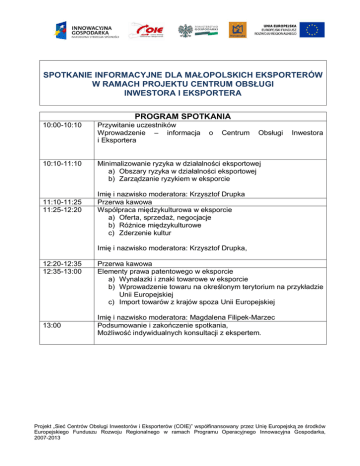 SPOTKANIE INFORMACYJNE DLA MAŁOPOLSKICH EKSPORTERÓW W RAMACH PROJEKTU CENTRUM OBSŁUGI INWESTORA I EKSPORTERA PROGRAM SPOTKANIA 10:00-10:10 10:10-11:10 11:10-11:25 11:25-12:20 Przywitanie uczestników Wprowadzenie – informacja i Eksportera o Centrum Obsługi Inwestora Minimalizowanie ryzyka w działalności eksportowej a) Obszary ryzyka w działalności eksportowej b) Zarządzanie ryzykiem w eksporcie Imię i nazwisko moderatora: Krzysztof Drupka Przerwa kawowa Współpraca międzykulturowa w eksporcie a) Oferta, sprzedaż, negocjacje b) Różnice międzykulturowe c) Zderzenie kultur Imię i nazwisko moderatora: Krzysztof Drupka, 12:20-12:35 12:35-13:00 13:00 Przerwa kawowa Elementy prawa patentowego w eksporcie a) Wynalazki i znaki towarowe w eksporcie b) Wprowadzenie towaru na określonym terytorium na przykładzie Unii Europejskiej c) Import towarów z krajów spoza Unii Europejskiej Imię i nazwisko moderatora: Magdalena Filipek-Marzec Podsumowanie i zakończenie spotkania, Możliwość indywidualnych konsultacji z ekspertem. Projekt „Sieć Centrów Obsługi Inwestorów i Eksporterów (COIE)” współfinansowany przez Unię Europejską ze środków Europejskiego Funduszu Rozwoju Regionalnego w ramach Programu Operacyjnego Innowacyjna Gospodarka, 2007-2013