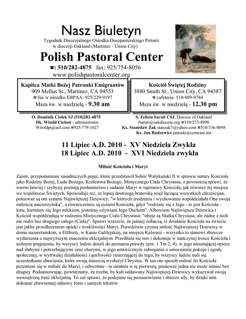 Nasz Biuletyn Tygodnik Diecezjalnego Ośrodka Duszpasterskiego Polonii w diecezji Oakland (Martinez - Union City) Polish Pastoral Center ?: 510/282-4875 fax: 925/754-8056 www.polishpastoralcenter.org Kaplica Matki Bożej Patronki Emigrantów 909 Mellus St., Martinez, CA 94553 Kościół Świętej Rodziny 3880 Smith St., Union City, CA 94587 ?/fax w ośrodku EBPAA: 925/229-9197 ? cafeteria: 510/489-9784 Msza św. w niedzielę - 9.30 am Msza św. w niedzielę - 12.30 pm O. Dominik Ciołek SJ (510)282-4875 Dk. Witold Cichoń - administrator [email protected] ?925/779-1027 S. Felicia Sarati CSJ, Diocese of Oakland [email protected] ?510/273-4998 Ks. Stanisław Żak [email protected] ?510/336-0698 Ks. Jan Rudzewicz [email protected] 11 Lipiec A.D. 2010 - XV Niedziela Zwykła 18 Lipiec A.D. 2010 - XVI Niedziela zwykła Miłość Kościoła i Maryi Zaiste, przypomnienie zasadniczych pojęć, które przedstawił Sobór Watykański II w sprawie natury Kościoła jako Rodziny Bożej, Ludu Bożego, Królestwa Bożego, Mistycznego Ciała Chrystusa, z pewnością sprawi, że wierni łatwiej i szybciej poznają posłannictwo i zadanie Maryi w tajemnicy Kościoła, jak również Jej miejsce we wspólnocie Świętych. Spowoduje też, że lepiej dostrzegą braterską więź łączącą wszystkich chrześcijan, ponieważ są oni synami Najświętszej Dziewicy, "w których zrodzeniu i wychowaniu współdziałała Ona swoją miłością macierzyńską", a równocześnie są synami Kościoła, gdyż "rodzimy się z Jego - to jest Kościoła łona, karmimy się Jego mlekiem, jesteśmy ożywiani Jego Duchem". Albowiem Najświętsza Dziewica i Kościół współdziałają w rodzeniu Mistycznego Ciała Chrystusa: "oboje są Matką Chrystusa, ale żadne z nich nie rodzi bez drugiego całego (Ciała)". Sprawi wreszcie, że jaśniej zobaczą, iż działanie Kościoła na świecie jest jakby przedłużeniem opieki i troskliwości Maryi. Prawdziwie czynna miłość Najświętszej Dziewicy w domu nazaretańskim, u Elżbiety, w Kanie Galilejskiej, na miejscu Kalwarii - wszystko to stanowi zbawcze wydarzenia o najwyższym znaczeniu eklezjalnym. Przedłuża się ono i dokonuje w matczynej trosce Kościoła i usilnym pragnieniu, by wszyscy ludzie doszli do poznania prawdy (por. 1 Tm 2, 4), w jego nieustającej opiece nad słabymi i potrzebującymi oraz chorymi, w jego ustawicznym zabieganiu o umocnienie pokoju i zgody społecznej, w wytrwałej działalności i gorliwości zmierzającej do tego, by wszyscy ludzie stali się uczestnikami zbawienia, które swoją śmiercią wysłużył Chrystus. W ten oto sposób miłość do Kościoła przemieni się w miłość do Maryi, i odwrotnie - ta ostatnia w tę pierwszą, ponieważ jedna nie może istnieć bez drugiej. Podsumowując, powtarzamy, że trzeba, by kult oddawany Najświętszej Dziewicy wykazywał swoją wewnętrzną treść eklezjalną. To zaś sprawi, że podejmie się postanowienie i zbierze siły, by dzięki nim dokonać zbawiennej odnowy form i samych tekstów. Muzeum Jana Pawła II i Prymasa Wyszyńskiego W ramach Centrum Opatrzności Bożej powstał międzynarodowy projekt, uwieczniający osobę Jana Pawła II i Stefana Kardynała Wyszyńskiego dla obecnego i kolejnych pokoleń. To wyjątkowe Wotum Wdzięczności narodu za dwóch wielkich Synów Narodu i nieocenionych ludzi Kościoła. W muzeum zostaną odzwierciedlone dzieje Kościoła i Polski w XX wieku w życiorysach tych dwóch Wielkich Polaków. Muzeum stanowi wyraz wdzięczności za duchową, moralną, cywilizacyjną i społeczną przemianę, jaka dokonała się w ciągu ostatnich kilkudziesięciu lat zarówno w Polsce, jak również na świecie. Jest hołdem dla Jana Pawła II i Prymasa Stefana Wyszyńskiego za ich wkład w zachowanie tożsamości kulturowej w dobie panowania w Polsce totalitaryzmów - nazistowskiego i komunistycznego. Dzięki działalności tych dwóch bohaterów polskość stała się ważnym punktem odniesienia dla kultury uniwersalnej. Muzeum jest autentycznym świadectwem naszych czasów, stanowiąc ośrodek upamiętnienia roli Kościoła katolickiego w XX-wiecznym życiu Polski. Docelowo będzie pełnić funkcje dokumentacyjne, konferencyjne, edukacyjne i naukowe. Ma ono pełnić misję społeczną, polegającą na historycznej, kulturalnej i patriotycznej edukacji odbiorców. W nowoczesny sposób będzie kształtować ich wrażliwość, podtrzymując żywą pamięć przyszłych pokoleń o Janie Pawle II i Prymasie Tysiąclecia oraz ich roli w dziejach Polski i świata. Przekaz Muzeum powinien oddziaływać na szerokie grono odbiorców i być zrozumiałym zarówno dla wierzących jak i niewierzących, dla Polaków, jak i zagranicznych turystów. Muzeum jest wznoszone na warszawskich Polach Wilanowskich, a w jego skład wchodzi obok Muzeum także Świątynia Opatrzności Bożej oraz Panteon Wielkich Polaków. . Zebrane składki kościelne. Za złożone ofiary składamy serdeczne Bóg zapłać: 4/4/10 4/11/10 4/18/10 4/25/10 5/2/10 5/9/10 5/16/10 5/23/10 5/30/10 6/6/10 Martinez $883 $612 $796 $345 $253 $476 $322 $267 $250 $225 Union City $635 $635 $622 $259 $131 $358 $176 $553 Z http://PolishPastoralCenter.org/sacraments Z Nauka religii i przygotowanie do I Komunii św. - w ramach zajęć Szkoły Polskiej i parafii. Przygotowanie do bierzmowania - zgłosić co najmniej 2 lata przed planowanym terminem. Odwiedziny chorych - po uprzednim uzgodnieniu telefonicznym, a w sprawach nagłych w każdym czasie. Sakrament pojednania - przed lub po Mszy św. Chrzest - zgłosić co najmniej miesiąc wcześniej. Małżeństwo - zgłosić co najmniej 6 miesięcy przed planowanym terminem. Z Sponsorzy “Naszego Biuletynu” Z Ogłoszenia różne: Praca - Kupno - Sprzedaż - Usługi - Rozrywka Z . 2 Października 2010 tj Sobota, obchodzimy uroczystości CHAUTAUQUA #16 od godz. 10:00 do 4:30 przy parafii Świętego Józefa Robotnika w Berkeley, 1640 Addison St ( at Jefferson). Msza Św. Celebrowana prz