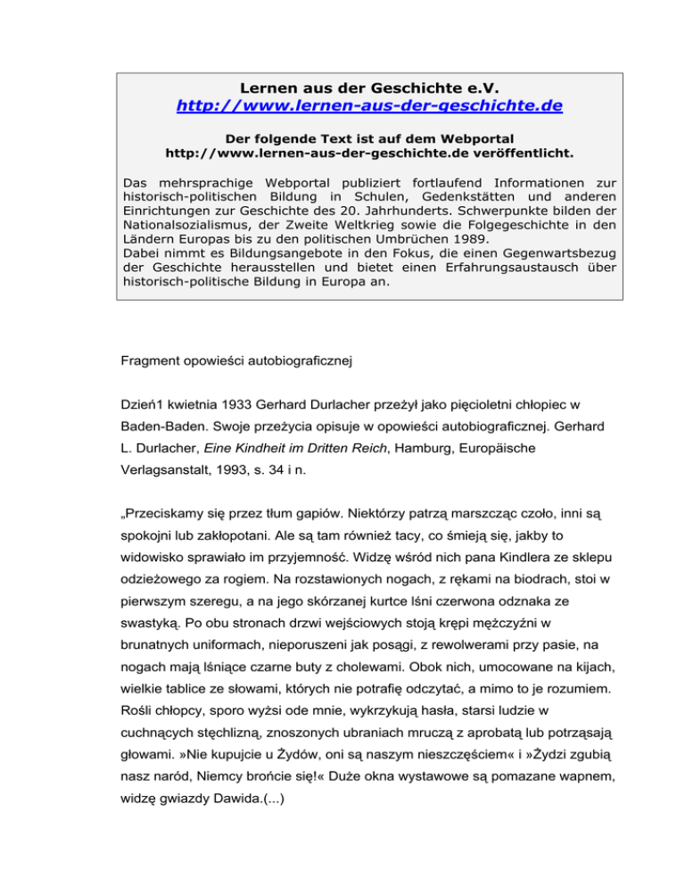 Lernen aus der Geschichte e.V. http://www.lernen-aus-der-geschichte.de Der folgende Text ist auf dem Webportal http://www.lernen-aus-der-geschichte.de veröffentlicht. Das mehrsprachige Webportal publiziert fortlaufend Informationen zur historisch-politischen Bildung in Schulen, Gedenkstätten und anderen Einrichtungen zur Geschichte des 20. Jahrhunderts. Schwerpunkte bilden der Nationalsozialismus, der Zweite Weltkrieg sowie die Folgegeschichte in den Ländern Europas bis zu den politischen Umbrüchen 1989. Dabei nimmt es Bildungsangebote in den Fokus, die einen Gegenwartsbezug der Geschichte herausstellen und bietet einen Erfahrungsaustausch über historisch-politische Bildung in Europa an. Fragment opowieści autobiograficznej Dzień1 kwietnia 1933 Gerhard Durlacher przeżył jako pięcioletni chłopiec w Baden-Baden. Swoje przeżycia opisuje w opowieści autobiograficznej. Gerhard L. Durlacher, Eine Kindheit im Dritten Reich, Hamburg, Europäische Verlagsanstalt, 1993, s. 34 i n. „Przeciskamy się przez tłum gapiów. Niektórzy patrzą marszcząc czoło, inni są spokojni lub zakłopotani. Ale są tam również tacy, co śmieją się, jakby to widowisko sprawiało im przyjemność. Widzę wśród nich pana Kindlera ze sklepu odzieżowego za rogiem. Na rozstawionych nogach, z rękami na biodrach, stoi w pierwszym szeregu, a na jego skórzanej kurtce lśni czerwona odznaka ze swastyką. Po obu stronach drzwi wejściowych stoją krępi mężczyźni w brunatnych uniformach, nieporuszeni jak posągi, z rewolwerami przy pasie, na nogach mają lśniące czarne buty z cholewami. Obok nich, umocowane na kijach, wielkie tablice ze słowami, których nie potrafię odczytać, a mimo to je rozumiem. Rośli chłopcy, sporo wyżsi ode mnie, wykrzykują hasła, starsi ludzie w cuchnących stęchlizną, znoszonych ubraniach mruczą z aprobatą lub potrząsają głowami. »Nie kupujcie u Żydów, oni są naszym nieszczęściem« i »Żydzi zgubią nasz naród, Niemcy brońcie się!« Duże okna wystawowe są pomazane wapnem, widzę gwiazdy Dawida.(...) Główny mechanik z warsztatu, gdzie mój ojciec naprawia auto, barczysty mężczyzna o brązowych włosach i ubrudzonych rękach, przeciska sięobok nas do przodu. Usiłuje wejść do sklepu między ludźmi w brunatnych koszulach, ale jeden z nich wyciąga rękę i zatrzymuje go. Wrzeszczy: »Nie umiesz czytać, durny sługusie Żydów? Dużo jeszcze trzeba będzie cięnauczyć!« Ani jeden głos nie podnosi się w jego obronie, nikt nie protestuje. Mechanik odchodzi bez słowa, ze spuszczonymi ramionami i pochylonymi plecami. Matka nie ma już odwagi zrobić kroku do przodu. Ale drugi człowiek z SA poznał nas i mówi z gestem szyderczej usłużności: »Zapraszamy do środka, łaskawa pani, już my się postaramy, żebyście szybko splajtowali«. (...) Dziesiątki spojrzeńśledzą nas z chłodną, drwiącą obojętnością albo odwracają się, kiedy z bijącym sercem i na nogach jak z ołowiu dochodzimy do wysmarowanych wapnem drzwi sklepu. Pan Kindler pozdrawia nas z podłym uśmieszkiem, a mnie robi się niedobrze ze strachu”.