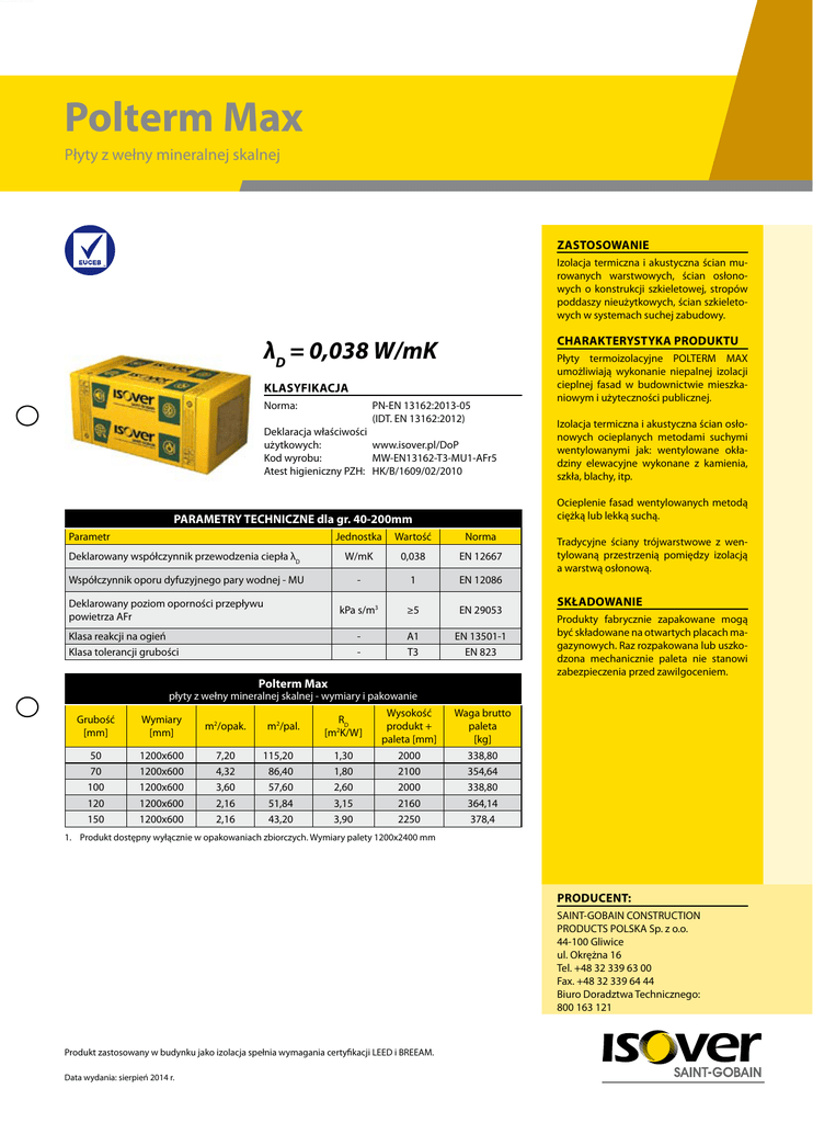 karty_produktoweVI_24.indd Polterm Max Płyty z wełny mineralnej skalnej ZASTOSOWANIE Izolacja termiczna i akustyczna ścian murowanych warstwowych, ścian osłonowych o konstrukcji szkieletowej, stropów poddaszy nieużytkowych, ścian szkieletowych w systemach suchej zabudowy. Charakterystyka produktu λD = 0,038 W/mK KLASYFIKACJA Norma: PN-EN 13162:2013-05 (IDT. EN 13162:2012) Deklaracja właściwości użytkowych: www.isover.pl/DoP Kod wyrobu: MW-EN13162-T3-MU1-AFr5 Atest higieniczny PZH: HK/B/1609/02/2010 Jednostka Wartość Norma Deklarowany współczynnik przewodzenia ciepła λD W/mK 0,038 EN 12667 Współczynnik oporu dyfuzyjnego pary wodnej - MU - 1 EN 12086 kPa s/m3 ≥5 EN 29053 - A1 T3 EN 13501-1 EN 823 Deklarowany poziom oporności przepływu powietrza AFr Klasa reakcji na ogień Klasa tolerancji grubości Izolacja termiczna i akustyczna ścian osłonowych ocieplanych metodami suchymi wentylowanymi jak: wentylowane okładziny elewacyjne wykonane z kamienia, szkła, blachy, itp. Ocieplenie fasad wentylowanych metodą ciężką lub lekką suchą. PARAMETRY TECHNICZNE dla gr. 40-200mm Parametr Płyty termoizolacyjne POLTERM MAX umożliwiają wykonanie niepalnej izolacji cieplnej fasad w budownictwie mieszkaniowym i użyteczności publicznej. Polterm Max Tradycyjne ściany trójwarstwowe z wentylowaną przestrzenią pomiędzy izolacją a warstwą osłonową. SKŁADOWANIE Produkty fabrycznie zapakowane mogą być składowane na otwartych placach magazynowych. Raz rozpakowana lub uszkodzona mechanicznie paleta nie stanowi zabezpieczenia przed zawilgoceniem. płyty z wełny mineralnej skalnej - wymiary i pakowanie Grubość [mm] Wymiary [mm] m2/opak. 50 70 100 120 150 1200x600 1200x600 1200x600 1200x600 1200x600 7,20 4,32 3,60 2,16 2,16 m2/pal. 115,20 86,40 57,60 51,84 43,20 RD [m2K/W] 1,30 1,80 2,60 3,15 3,90 Wysokość produkt + paleta [mm] 2000 2100 2000 2160 2250 Waga brutto paleta [kg] 338,80 354,64 338,80 364,14 378,4 1. Produkt dostępny wyłącznie w opakowaniach zbiorczych. Wymiary palety 1200x2400 mm PRODUCENT: SAINT-GOBAIN CONSTRUCTION PRODUCTS POLSKA Sp. z o.o. 44-100 Gliwice ul. Okrężna 16 Tel. +48 32 339 63 00 Fax. +48 32 339 64 44 Biuro Doradztwa Technicznego: 800 163 121 Produkt zastosowany w budynku jako izolacja spełnia wymagania certyfikacji LEED i BREEAM. Data wydania: sierpień 2014 r.