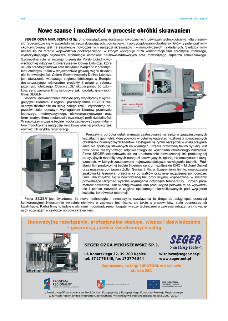 684 MECHANIK NR 10/2010 Nowe szanse i możliwości w procesie obróbki skrawaniem SEGER OZGA MIKUSZEWSKI Sp. J. to doświadczony dostawca nowoczesnych rozwiązań technologicznych dla przemysłu. Specjalizuje się w sprzedaży narzędzi skrawających, pomiarowych i oprzyrządowania obrabiarek. Główny potencjał firmy skoncentrowany jest na segmencie nowoczesnych narzędzi skrawających – monolitycznych i składanych. Siedziba firmy mieści się na terenie województwa podkarpackiego, w którym występuje duża koncentracja firm przemysłu lotniczego, wykorzystującego najnowsze technologie ośrodków naukowo-badawczych oraz rozwiniętego zaplecza szkoleniowego. Szczególną rolę w rozwoju przemysłu Polski południowowschodniej odgrywa Stowarzyszenie Dolina Lotnicza, które skupia przedsiębiorstwa oraz instytucje związane z przemysłem lotniczym i pełni w województwie główną rolę w dziedzinie innowacyjności. Celem Stowarzyszenia Dolina Lotnicza jest stworzenie wiodącego regionu lotniczego w Europie, dostarczającego różnorodne produkty i usługi z zakresu przemysłu lotniczego. Obecnie „DL” skupia ponad 50 członków; są to zarówno firmy usługowe, jak i produkcyjne – m.in. firma SEGER. Wiedza i doświadczenie zdobyte przy współpracy z wymagającymi klientami z regionu pozwoliły firmie SEGER rozszerzyć działalność na skalę całego kraju. Wychodząc naprzeciw stale rosnącym wymaganiom klientów przemysłu lotniczego, motoryzacyjnego, elektromaszynowego oraz form i matryc firma postanowiła rozszerzyć profil działalności. W najbliższym czasie będzie mogła zaoferować swoim klientom monolityczne narzędzia węglikowe własnej produkcji, jak również ich szybką regenerację. Precyzyjna obróbka detali wymaga zastosowania narzędzi o zaawansowanych kształtach i geometrii, które pozwolą w pełni wykorzystać możliwości nowoczesnych obrabiarek numerycznych klientów. Dostępne na rynku narzędzia w wielu przypadkach nie spełniają stawianych im wymagań. Częstą przyczyną takich sytuacji jest brak parku maszynowego odpowiedniego do wykonania określonego narzędzia. Firma SEGER zdecydowała się na uruchomienie nowoczesnej linii produkcyjnej precyzyjnych monolitycznych narzędzi skrawających, opartej na maszynach i urządzeniach, w których zastosowano najnowocześniejsze rozwiązania techniki. Podstawą linii produkcyjnej będzie 5-osiowe centrum szlifierskie CNC – Michael Deckel oraz maszyna pomiarowa Zoller Genius 3 Micro. Uzupełnienie linii to: nowoczesna znakowarka laserowa, przecinarka do wałków oraz inne urządzenia pomocnicze. Cała linia znajdzie się w nowoczesnej hali produkcyjnej, wyposażonej w systemy pozwalające utrzymać wysokie wymagania dotyczące temperatury i innych parametrów powietrza. Tak skonfigurowana linia produkcyjna pozwala to na wytworzenie i pomiar narzędzi z węglika spiekanego skomplikowanych pod względem kształtu, jak również tolerancji. Firma SEGER jest świadoma, że nowe technologie i innowacyjne rozwiązania to droga do osiągnięcia przewagi konkurencyjnej. Nieustannie inwestuje nie tylko w zaplecze techniczne, ale także w pracowników, stale podnosząc ich kwalifikacje. Kadra firmy to ludzie o olbrzymim doświadczeniu i bogatej wiedzy technicznej w zakresie wdrażania innowacyjnych rozwiązań w sektorze obróbki skrawaniem. Innowacyjne rozwiązania, profesjonalna obsługa, wiedza i doświadczenie – gwarancją jakości świadczonych usług SEGER OZGA MIKUSZEWSKI SP.J. ul. Konarskiego 32, 39-200 Dębica tel. 17 27 76 840, fax 17 27 76 844 [email protected] www.seger.net.pl Zapraszamy na targi EUROTOOL w Krakowie stoisko 252 „Projekt współfinansowany ze środków Unii Europejskiej z Europejskiego Funduszu Rozwoju Regionalnego w ramach Regionalnego Programu Operacyjnego Województwa Podkarpackiego na lata 2007–2013”
