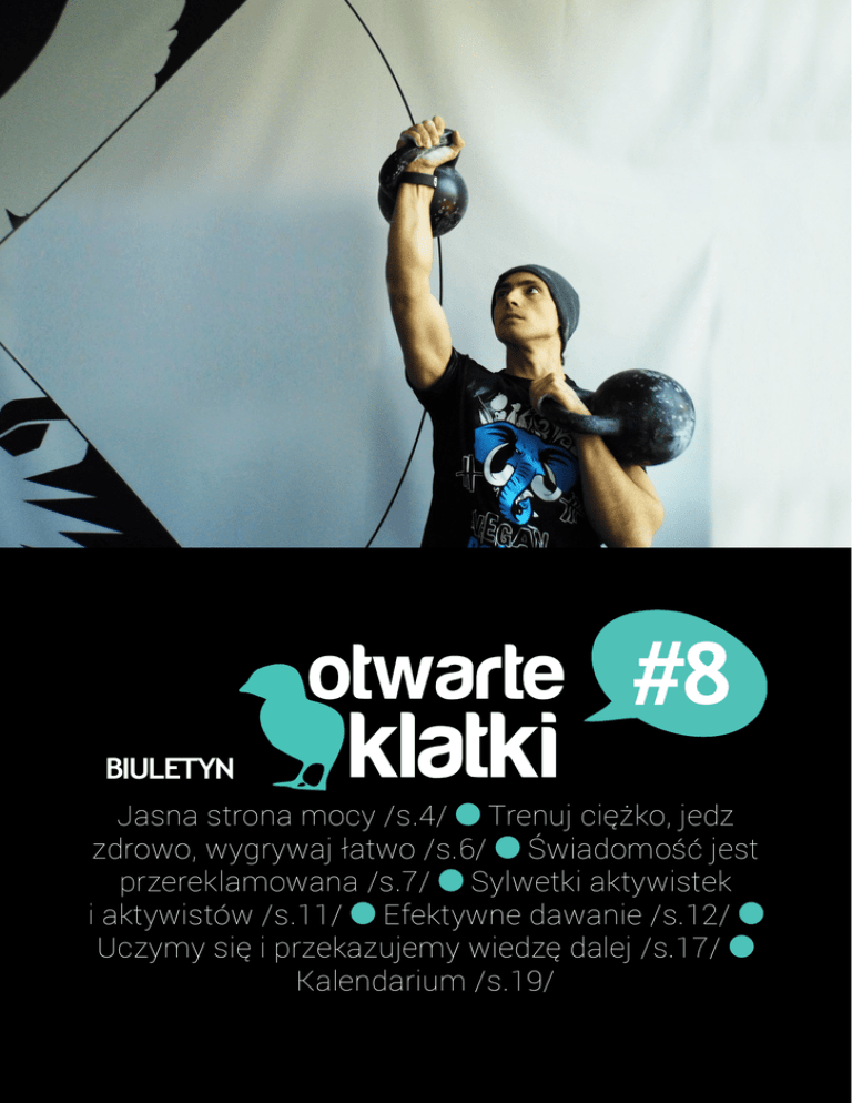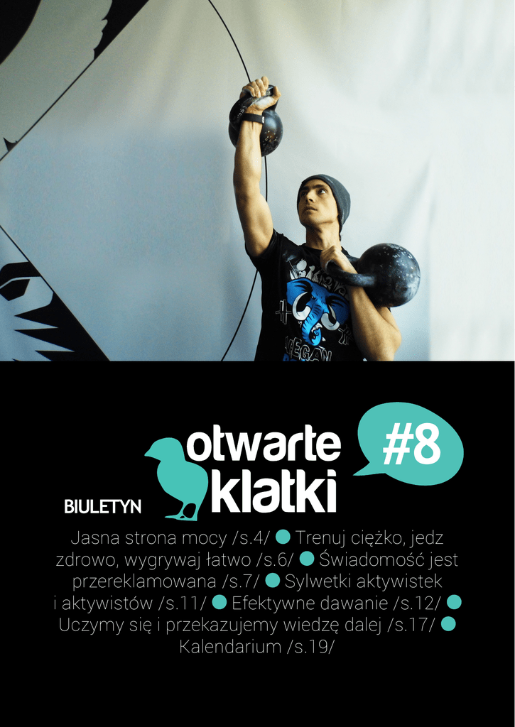 #8 BIULETYN Jasna strona mocy /s.4/ Trenuj ciężko, jedz zdrowo, wygrywaj łatwo /s.6/ Świadomość jest przereklamowana /s.7/ Sylwetki aktywistek i aktywistów /s.11/ Efektywne dawanie /s.12/ Uczymy się i przekazujemy wiedzę dalej /s.17/ Kalendarium /s.19/ otwarteklatki.pl 1 WSTĘPNIAK DROGA czytelniczko, DROGI czytelniku! Dobrusia Karbowiak Stowarzyszenie Otwarte Klatki P rawie każde zabijane zwierzę jest zabijane dla mięsa. Prawie każde zwierzę, które spędzi całe swoje życie na fermie przemysłowej, jest więźniem przemysłu spożywczego. To wszystko sprawia, że musimy bardzo poważnie traktować wszelkie inicjatywy mające na celu upowszechnianie diety roślinnej. Jako Stowarzyszenie Otwarte Klatki staramy się zarówno motywować do zmiany, jak i usuwać bariery, które mogłyby zmianę diety powstrzymywać. Pokazujemy, jak wygląda przykra prawda na temat hodowli zwierząt, informujemy o korzyściach zdrowotnych wynikających z rezygnacji z produktów odzwierzęcych, pokazujemy, jak przyrządzać proste i smaczne posiłki oparte na surowcach roślinnych. Wiemy, że jedzenie na mieście wciąż jest wyzwaniem dla osób, które nie chcą jeść mięsa, jajek czy nabiału, więc zabiegamy o wprowadzanie opcji roślinnych w barach i restauracjach w całej Polsce. Zdajemy sobie sprawę również z tego, że bariery istnieją także na zupełnie innym poziomie. Mięso jest traktowane - zupełnie niesłusznie - jako źródło siły, witalności i męskości. Zdecydowaliśmy się zmierzyć z tymi stereotypami. Pracujemy właśnie nad ostateczną formą kampanii Jasna Strona Mocy, w której pokażemy, że dieta roślinna nie jest żadną przeszkodą w uprawianiu nawet bardzo wymagających dyscyplin sportowych. Zaprezentujemy sylwetki znanych kulturystów i zawodników sportów walki, którzy zdecydowali się zrezygnować z mięsa, i opowiemy o korzyściach, które z tej decyzji wynikają. Efekty naszej pracy zobaczycie już wkrótce. Zaglądajcie na naszą stronę i zapiszcie się na newsletter, aby na bieżąco otrzymywać informacje o naszych działaniach. Obecnie większość organizacji promujących dietę roślinną, podobnie jak wiele postępowych organizacji pozarządowych, może wymienić wiele celów, na które przydadzą się dodatkowe środki, lub ma duże luki w finansowaniu. Zawsze łatwo jest znaleźć osoby, które będą gotowe promować szczytny cel. Pozyskanie środków finansowych na ich utrzymanie jest zawsze trudne. Możemy zmienić tę sytuację dzięki nowej kulturze dawania EFEKTYWNE DAWANIE S.12 www.facebook.com/otwarteklatki Stowarzyszenie Otwarte Klatki ul. Fredry 5/3A 61-701 Poznań [email protected] ISSN 2391-4580, Redaktor naczelna: Joanna Stiller, Sekretarz redakcji: Agata Wojtowicz, Skład biuletynu: Ewa Żydowicz Bądź nadzieją dla ZWIERZĄT M ożesz nazywać mnie „Marta”. To nie jest moje prawdziwe imię, ale dla swojego bezpieczeństwa wolę go nie ujawniać. Jestem aktywistką śledczą Otwartych Klatek. Przy okazji każdego śledztwa spotykam zwierzęta, których obrazu nigdy nie wymażę z pamięci. Widziałam lisa, który całymi godzinami drapał drzwiczki klatki, podejmując skazaną na niepowodzenie próbę wydostania się na wolność i uniknięcia śmierci. Widziałam kurę, która zmarła z wycieńczenia, zanim ukończyła pierwszy rok życia. Widziałam konia, który wariował ze strachu, kiedy ładowano go do tira, który miał zabrać go w podróż bez powrotu. Życie zwierząt na fermach przemysłowych to piekło na ziemi. Śledztwa prowadzone przeze mnie i innych aktywistów śledczych Otwartych Klatek wydobywają cierpienie zwierząt na światło dzienne. Dzięki śledztwom jesteśmy w stanie stawiać przed sądem pracowników i właścicieli ferm, zmuszać firmy do zmiany swojej polityki wobec zwierząt oraz inspirować ludzi do podejmowania lepszych decyzji dotyczących tego, co jedzą. Widok cierpiących zwierząt jest dla mnie bardzo trudny. Jednak będę dalej to robić, ponieważ wiem, jak ważna jest to praca, i jak wiele możemy dzięki temu zdziałać. Nie mogę jednak robić tego sama. Potrzebuję Twojej pomocy. Przyłącz się do Otwartych Klatek, do mnie, i zacznij walczyć o zapomniane i krzywdzone zwierzęta. Wpłać dotację, która pozwoli nam pokazać światu prawdziwe oblicze hodowli zwierząt, albo zostań członkiem wspierającym. Twoje wsparcie pozwoli nam wysłać więcej aktywistów śledczych na fermy przemysłowe, pozwoli zakupić dobrej jakości sprzęt oraz pokryje koszta dojazdów związane z dokumentowaniem krzywdy zwierząt. Dla zwierząt, Aktywistka śledcza Otwartych Klatek Możesz nas wesprzeć finansowo poprzez przelew na nasze konto. Działanie Stowarzyszenia opiera się obecnie głównie na prywatnych środkach członków i członkiń, dlatego każda kwota jest ważna i mile widziana. 81 2030 0045 1110 0000 0257 1960 Stowarzyszenie Otwarte Klatki ul. Fredry 5/3A 61-701 Poznań Tytuł przelewu: DAROWIZNA SWIFT: GOPZPLPW IBAN: PL 81 2030 0045 1110 0000 0257 1960 Przyjmujemy także dotacje w kryptowalucie Bitcoin. Nasz adres BTC to 1HJttVjitMAeJ2uLtAya1bgdtcXEwSdAqm otwarteklatki.pl 3 JASNA STRONA MOCY O bawy o to, że będąc na diecie roślinnej nie da się uprawiać profesjonalnie czy nawet hobbistycznie sportu, wkrótce miną bezpowrotnie. Ruszamy bowiem z kampanią, dzięki której przekonacie się, że można jeść smacznie i roślinnie, i rosnąć przy tym w siłę. Lubię mieć świadomość, że mogę rozwijać siłę i uzyskać optymalne zdrowie na diecie roślinnej. Nie uznaję kompromisów w sprawie wyznawanych przeze mnie wartości - wyznaje Mike Mahler, jeden z najbardziej uznanych instruktorów kettlebells na świecie, organizator seminariów sportowych, autor bestsellerowych wydawnictw DVD i dziesiątek artykułów (m.in. w Ironman Magazine i Hardcore Muscle Magazine), weganin od ponad 20 lat. Wiecie, jak to jest przebiec 217 kilometrów ultramaratonu i ustanowić nowy r