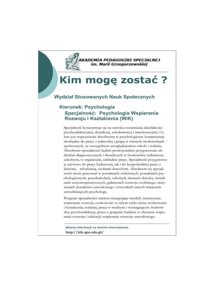 Kim mogę zostać ? Wydział Stosowanych Nauk Społecznych Kierunek: Psychologia Specjalność: Psychologia Wspierania Rozwoju i Kształcenia (WiK) Specjalność koncentruje się na szeroko rozumianej działalności psychoedukacyjnej, doradczej, szkoleniowej i interwencyjnej. Celem jest wyposażenie absolwenta w psychologiczne kompetencje niezbędne do pracy z jednostką i grupą w różnych środowiskach społecznych, ze szczególnym uwzględnieniem szkoły i rodziny. Absolwent specjalności będzie profesjonalnie przygotowany do działań diagnostycznych i doradczych w środowisku rodzinnym, szkolnym, w organizacji, zakładzie pracy. Specjalność przygotowuje zarówno do pracy badawczej, jak i do bezpośredniej pracy z dziećmi, młodzieżą, osobami dorosłymi. Absolwent tej specjalności może pracować w poradniach rodzinnych, poradniach psychologicznych, przedszkolach, szkołach, domach dziecka, świetlicach socjoterapeutycznych, gabinetach rozwoju osobistego, instytucjach doradztwa zawodowego i wszystkich innych miejscach zatrudniających psychologa. Program specjalności zawiera następujące moduły tematyczne: wspieranie rozwoju osobowości w całym cyklu życia; wychowanie i kształcenie; rodzina; praca w trudnym i wymagającym środowisku; psychoedukacja, praca z grupami; badania w obszarze wspierania rozwoju i edukacji; wspieranie rozwoju zawodowego. Więcej informacji na stronie internetowej: http://irk.aps.edu.pl/