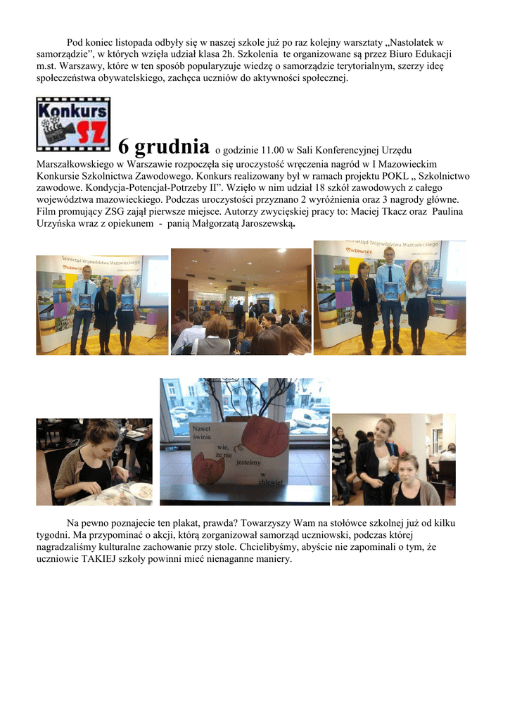 Pod koniec listopada odbyły się w naszej szkole już po raz kolejny warsztaty „Nastolatek w samorządzie”, w których wzięła udział klasa 2h. Szkolenia te organizowane są przez Biuro Edukacji m.st. Warszawy, które w ten sposób popularyzuje wiedzę o samorządzie terytorialnym, szerzy ideę społeczeństwa obywatelskiego, zachęca uczniów do aktywności społecznej. 6 grudnia o godzinie 11.00 w Sali Konferencyjnej Urzędu Marszałkowskiego w Warszawie rozpoczęła się uroczystość wręczenia nagród w I Mazowieckim Konkursie Szkolnictwa Zawodowego. Konkurs realizowany był w ramach projektu POKL „ Szkolnictwo zawodowe. Kondycja-Potencjał-Potrzeby II”. Wzięło w nim udział 18 szkół zawodowych z całego województwa mazowieckiego. Podczas uroczystości przyznano 2 wyróżnienia oraz 3 nagrody główne. Film promujący ZSG zajął pierwsze miejsce. Autorzy zwycięskiej pracy to: Maciej Tkacz oraz Paulina Urzyńska wraz z opiekunem - panią Małgorzatą Jaroszewską. Na pewno poznajecie ten plakat, prawda? Towarzyszy Wam na stołówce szkolnej już od kilku tygodni. Ma przypominać o akcji, którą zorganizował samorząd uczniowski, podczas której nagradzaliśmy kulturalne zachowanie przy stole. Chcielibyśmy, abyście nie zapominali o tym, że uczniowie TAKIEJ szkoły powinni mieć nienaganne maniery. 13 grudnia odbyła się już druga edycja szkolnego konkursu „Mam talent”. Poprowadzili ją Maciej Kuran z klasy 3d, Katarzyna Kowalczuk z 1a oraz Natalia Gos z klasy 1h. Trzecie miejsce zajęli: Angelika Łąkowska (saksofon), Anna Szymańska (śpiew) oraz Mikołaj Wieczorek z 3 f (śpiew); drugie przypadło charyzmatycznemu tancerzowi – Maciejowi Piwowarskiemu, który był jednocześnie autorem choreografii, w której się zaprezentował. W głosowaniu za pomocą sms-ów zwyciężyli uczniowie klasy 4i, którzy zachęcili publiczność do wspólnego wykonania konkursowej piosenki. W tym roku zwyciężyła muzyka, śpiew i taniec! 13 stycznia 2013 w ZSG utworzony został sztab WOŚP, którego szefem była pani Małgorzata Jaroszewska. Samorząd Uczniowski czuwał tego dnia nad prawidłowym przebiegiem liczenia pieniędzy zebranych przez wolontariuszy, a następnie bezpiecznym transportem datków do banku, a także dopełnieniem wszelkich formalności dotyczących rozliczenia się z Fundacją WOŚP. Zebraliśmy 11.677, 35! Wolontariuszom bardzo dziękujemy! 13 stycznia 2013 Samorząd Uczniowski po raz drugi włączył się do akcji „Mam Haka na raka”. Tym razem podejmujemy walkę z czerniakiem. Jeśli macie ochotę śledzić nasze poczynania, zapraszamy na nasz profil na Facebooku (Poznańska ma haka). FASHION A teraz zdjęcia z naszego cyklu ”Stylowe ZSG”. Tym razem prezentujemy stylizację casual Pani profesor Anny Mirończuk. Intensywny kolor włosów doskonale kontrastuje ze stonowaną gamą bieli i błękitów (pudrowe pastele nadal są w modzie). Na zdjęciu obok prezentuje się Barbara Celejewska z klasy 1i. Klasyczny zestaw: biała bluzka+granatowe/czarne spodnie (idealny do szkoły) został „podkręcony|” marynarką o intensywnym kolorze. Skórzana torba jako uzupełnienie stylizacji i interesujący efekt został osiągnięty. Zdjęcia do naszego cyklu zdjęć wykonuje Natalia Gos z klasy 1h. Zachęcamy Was do pozowania!
