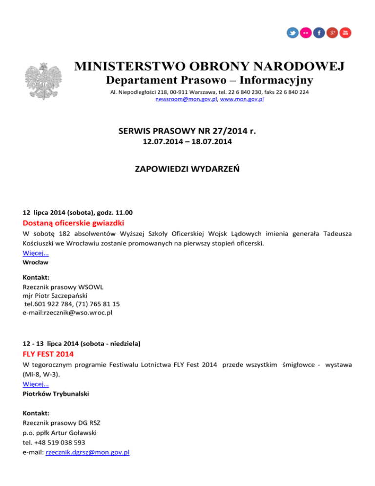 MINISTERSTWO OBRONY NARODOWEJ Departament Prasowo – Informacyjny Al. Niepodległości 218, 00-911 Warszawa, tel. 22 6 840 230, faks 22 6 840 224 [email protected], www.mon.gov.pl SERWIS PRASOWY NR 27/2014 r. 12.07.2014 – 18.07.2014 ZAPOWIEDZI WYDARZEŃ 12 lipca 2014 (sobota), godz. 11.00 Dostaną oficerskie gwiazdki W sobotę 182 absolwentów Wyższej Szkoły Oficerskiej Wojsk Lądowych imienia generała Tadeusza Kościuszki we Wrocławiu zostanie promowanych na pierwszy stopień oficerski. Więcej… Wrocław Kontakt: Rzecznik prasowy WSOWL mjr Piotr Szczepański tel.601 922 784, (71) 765 81 15 e-mail:[email protected] 12 - 13 lipca 2014 (sobota - niedziela) FLY FEST 2014 W tegorocznym programie Festiwalu Lotnictwa FLY Fest 2014 przede wszystkim śmigłowce - wystawa (Mi-8, W-3). Więcej… Piotrków Trybunalski Kontakt: Rzecznik prasowy DG RSZ p.o. ppłk Artur Goławski tel. +48 519 038 593 e-mail: [email protected] 15 lipca 2014 ( wtorek) Nowa strona BIP MON Uruchomienie zmodernizowanej strony Biuletynu Informacji Publicznej Ministerstwa Obrony Narodowej http://www.bip.mon.gov.pl/. Kontakt: Departament Prasowo -Informacyjny MON tel.(22) 6 840 230 e-mail: [email protected] 16 lipca 2014 ( środa) Sekretarz Stanu w MESKO Sekretarz Stanu w MON Czesław Mroczek złoży wizytę w Zakładach Metalowych Mesko S.A. . Skarżysko-Kamienna Kontakt: ppłk Szczepan Głuszczak tel. 722 387 212 e-mail: [email protected] 19 lipca 2014 ( sobota), godz. 10.00-15.00 Dzień otwarty Pokazy dynamiczne w powietrzu, wystawa statyczna samolotów i śmigłowców oraz uzbrojenia i specjalistycznego wyposażenia to główne atrakcje dnia otwartego lotniska w Gdyni Babich Dołach zorganizowanego w ramach obchodów 20. rocznicy powstania Brygady Lotnictwa Marynarki Wojennej. Więcej… Gdynia Babie Doły Kontakt: Oficer prasowy BLMW ppor. Czesław Cichy tel. (58) 626 85 27, tel. kom. 665 991 292 e-mail: [email protected] KRONIKA 7 lipca 2014 ( poniedziałek) Prezydent podpisał ustawę offsetową Prezydent RP Bronisław Komorowski podpisał w poniedziałek ustawę offsetową. Umowy mające kompensować zakupy uzbrojenia i sprzętu wojskowego za granicą staną się domeną Ministerstwa Obrony Narodowej, a nie Ministerstwa Gospodarki. Więcej… 8 lipca 2014 ( wtorek) O przyszłości programu AGS w Warszawie „Możliwości operacyjne systemu AGS (Alliance Ground Surveillance), jego przydatność w systemie obronnym Sojuszu, w tym także Polski oraz korzyści polityczne były fundamentem decyzji o przystąpieniu Polski do programu” – powiedział podczas konferencji Rady Dyrektorów Organizacji Zarządzającej Programem AGS wiceminister obrony narodowej Czesław Mroczek. Więcej… 8 lipca 2014 ( wtorek) Rusza program śmigłowców uderzeniowych Inspektorat Uzbrojenia 8 lipca 2014 roku ogłosił rozpoczęcie realizacji fazy analityczno-koncepcyjnej kolejnego projektu przewidzianego w Planie Modernizacji Technicznej - pozyskania śmigłowców uderzeniowych kryptonim „Kruk” dla Wojsk Lądowych. Niezależnie od tego zadania trwa procedura zakupu 70 śmigłowców wielozadaniowych dla Sił Zbrojnych. Więcej… 9 lipca 2014 ( środa) Afgańskie projekty pomocowe w obiektywie - Afganistan to nie tylko wysiłek i krew naszych żołnierzy, to również wiele innych działań na rzecz społeczeństwa, wiele wspaniałych, ludzkich historii – powiedział minister Tomasz Siemoniak dziękując za zaangażowanie w podejmowaniu niemilitarnych wysiłków PKW w Afganistanie. Więcej.. 10 lipca 2014 ( czwartek) Szkolą się, budując drogi i przepusty Choć główne zadanie saperów z 1 Batalionu Drogowo-Mostowego stanowi oczyszczanie terenu z niewybuchów, nie jest to ich jedyna działalność. Aby połączyć potrzebne z pożytecznym, żołnierze w ramach swoich szkoleń pomagają lokalnej społeczności: remontują i modernizują drogi w gminie Hanna w powiecie włodawskim. Więcej.. 11 lipca 2014 ( piątek) Projekt ustawy o kierowaniu obroną w Sejmie Prezydent Bronisław Komorowski skierował do Sejmu projekt ustawy o zmianie ustawy o powszechnym obowiązku obrony Rzeczypospolitej Polskiej oraz niektórych innych ustaw, której celem jest usprawnienie kierowania obroną państwa w czasie wojny. Więcej…