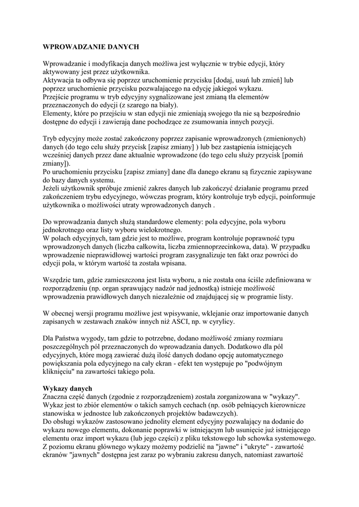WPROWADZANIE DANYCH Wprowadzanie i modyfikacja danych możliwa jest wyłącznie w trybie edycji, który aktywowany jest przez użytkownika. Aktywacja ta odbywa się poprzez uruchomienie przycisku [dodaj, usuń lub zmień] lub poprzez uruchomienie przycisku pozwalającego na edycję jakiegoś wykazu. Przejście programu w tryb edycyjny sygnalizowane jest zmianą tła elementów przeznaczonych do edycji (z szarego na biały). Elementy, które po przejściu w stan edycji nie zmieniają swojego tła nie są bezpośrednio dostępne do edycji i zawierają dane pochodzące ze zsumowania innych pozycji. Tryb edycyjny może zostać zakończony poprzez zapisanie wprowadzonych (zmienionych) danych (do tego celu służy przycisk [zapisz zmiany] ) lub bez zastąpienia istniejących wcześniej danych przez dane aktualnie wprowadzone (do tego celu służy przycisk [pomiń zmiany]). Po uruchomieniu przycisku [zapisz zmiany] dane dla danego ekranu są fizycznie zapisywane do bazy danych systemu. Jeżeli użytkownik spróbuje zmienić zakres danych lub zakończyć działanie programu przed zakończeniem trybu edycyjnego, wówczas program, który kontroluje tryb edycji, poinformuje użytkownika o możliwości utraty wprowadzonych danych . Do wprowadzania danych służą standardowe elementy: pola edycyjne, pola wyboru jednokrotnego oraz listy wyboru wielokrotnego. W polach edycyjnych, tam gdzie jest to możliwe, program kontroluje poprawność typu wprowadzonych danych (liczba całkowita, liczba zmiennoprzecinkowa, data). W przypadku wprowadzenie nieprawidłowej wartości program zasygnalizuje ten fakt oraz powróci do edycji pola, w którym wartość ta została wpisana. Wszędzie tam, gdzie zamieszczona jest lista wyboru, a nie została ona ściśle zdefiniowana w rozporządzeniu (np. organ sprawujący nadzór nad jednostką) istnieje możliwość wprowadzenia prawidłowych danych niezależnie od znajdującej się w programie listy. W obecnej wersji programu możliwe jest wpisywanie, wklejanie oraz importowanie danych zapisanych w zestawach znaków innych niż ASCI, np. w cyrylicy. Dla Państwa wygody, tam gdzie to potrzebne, dodano możliwość zmiany rozmiaru poszczególnych pól przeznaczonych do wprowadzania danych. Dodatkowo dla pól edycyjnych, które mogą zawierać dużą ilość danych dodano opcję automatycznego powiększania pola edycyjnego na cały ekran - efekt ten występuje po "podwójnym kliknięciu" na zawartości takiego pola. Wykazy danych Znaczna część danych (zgodnie z rozporządzeniem) została zorganizowana w "wykazy". Wykaz jest to zbiór elementów o takich samych cechach (np. osób pełniących kierownicze stanowiska w jednostce lub zakończonych projektów badawczych). Do obsługi wykazów zastosowano jednolity element edycyjny pozwalający na dodanie do wykazu nowego elementu, dokonanie poprawki w istniejącym lub usunięcie już istniejącego elementu oraz import wykazu (lub jego części) z pliku tekstowego lub schowka systemowego. Z poziomu ekranu głównego wykazy możemy podzielić na "jawne" i "ukryte" - zawartość ekranów "jawnych" dostępna jest zaraz po wybraniu zakresu danych, natomiast zawartość wykazów "ukrytych" widoczna jest po uruchomieniu przycisku [liczba=##->wykaz], gdzie ## określa liczbę elementów danego wykazu. Aktywacja trybu edycji dla wykazów "jawnych" odbywa się poprzez uruchomienie przycisku [dodaj, usuń lub zmień] lub podwójne kliknięcie na zawartości wykazu, natomiast dla wykazów "ukrytych" aktywacja następuje przez uruchomienie przycisku [liczba=##->wykaz]. Szerokość poszczególnych kolumn wykazu jest automatycznie dostosowywana do szerokości okna. W przypadku, gdy nie wszystkie kolumny mieszczą się w oknie, można zmienić ich szerokość "ręcznie". Aby tego dokonać należy „najechać" kursorem na nagłówek wykazu, a następnie na linię ograniczającą daną kolumnę (nadal w nagłówku), wówczas zmienia się kształt kursora i po naciśnięciu i przytrzymaniu lewego przycisku myszki oraz jej poziomym ruchu możliwa jest zmiana szerokości kolumn ograniczanych przez taką linię. Każdy wykaz można posortować względem jednej wybranej kolumny. Aby tego dokonać wystarczy "kliknąć" na nagłówek tej kolumny. Kolumna względem której posortowane są dane oznaczona jest znakiem * umieszczonym przed tytułem kolumny. W obecnej wersji programu dodano możliwość operacji na całych pozycjach wykazu. Po przyciśnięciu prawego przycisku myszki dostępne jest menu, które umożliwia kopiowanie, wstawianie oraz usuwanie wybranych pozycji wykazu.