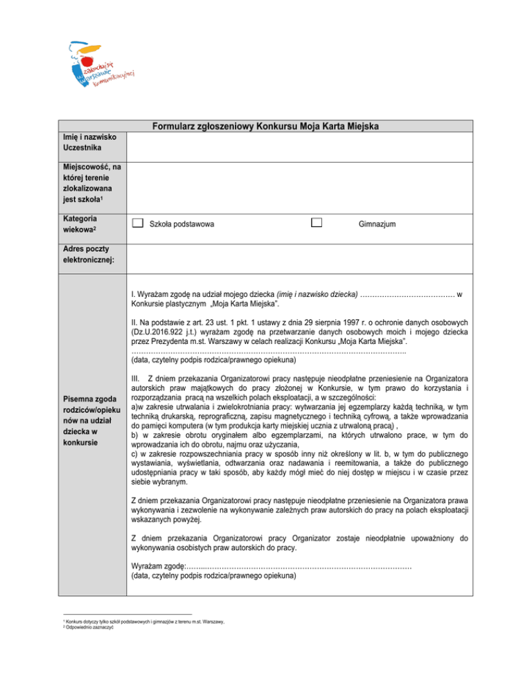 Formularz zgłoszeniowy Konkursu Moja Karta Miejska Imię i nazwisko Uczestnika Miejscowość, na której terenie zlokalizowana jest szkoła1 Kategoria wiekowa2 Szkoła podstawowa Gimnazjum Adres poczty elektronicznej: I. Wyrażam zgodę na udział mojego dziecka (imię i nazwisko dziecka) ………………………………… w Konkursie plastycznym „Moja Karta Miejska”. II. Na podstawie z art. 23 ust. 1 pkt. 1 ustawy z dnia 29 sierpnia 1997 r. o ochronie danych osobowych (Dz.U.2016.922 j.t.) wyrażam zgodę na przetwarzanie danych osobowych moich i mojego dziecka przez Prezydenta m.st. Warszawy w celach realizacji Konkursu „Moja Karta Miejska”. ………………………………………………………………………………………………….. (data, czytelny podpis rodzica/prawnego opiekuna) Pisemna zgoda rodziców/opieku nów na udział dziecka w konkursie III. Z dniem przekazania Organizatorowi pracy następuje nieodpłatne przeniesienie na Organizatora autorskich praw majątkowych do pracy złożonej w Konkursie, w tym prawo do korzystania i rozporządzania pracą na wszelkich polach eksploatacji, a w szczególności: a)w zakresie utrwalania i zwielokrotniania pracy: wytwarzania jej egzemplarzy każdą techniką, w tym techniką drukarską, reprograficzną, zapisu magnetycznego i techniką cyfrową, a także wprowadzania do pamięci komputera (w tym produkcja karty miejskiej ucznia z utrwaloną pracą) , b) w zakresie obrotu oryginałem albo egzemplarzami, na których utrwalono prace, w tym do wprowadzania ich do obrotu, najmu oraz użyczania, c) w zakresie rozpowszechniania pracy w sposób inny niż określony w lit. b, w tym do publicznego wystawiania, wyświetlania, odtwarzania oraz nadawania i reemitowania, a także do publicznego udostępniania pracy w taki sposób, aby każdy mógł mieć do niej dostęp w miejscu i w czasie przez siebie wybranym. Z dniem przekazania Organizatorowi pracy następuje nieodpłatne przeniesienie na Organizatora prawa wykonywania i zezwolenie na wykonywanie zależnych praw autorskich do pracy na polach eksploatacji wskazanych powyżej. Z dniem przekazania Organizatorowi pracy Organizator zostaje nieodpłatnie upoważniony do wykonywania osobistych praw autorskich do pracy. Wyrażam zgodę:……...………………………………………………………………………… (data, czytelny podpis rodzica/prawnego opiekuna) 1 2 Konkurs dotyczy tylko szkół podstawowych i gimnazjów z terenu m.st. Warszawy, Odpowiednio zaznaczyć