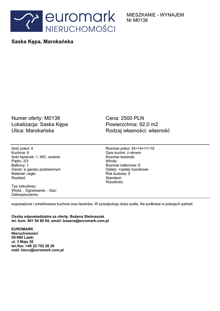 MIESZKANIE - WYNAJEM Nr M0138 Saska Kępa, Marokańska Numer oferty: M0138 Lokalizacja: Saska Kępa Ulica: Marokańska Cena: 2500 PLN Powierzchnia: 92.0 m2 Rodzaj własności: własność Ilość pokoi: 4 Kuchnia: 9 Ilość łazienek: 1. WC: osobno Piętro: 2/3 Balkony: 1 Garaż: w garażu podziemnym Material: cegła Rozkład: Rozmiar pokoi: 24+14+11+10 Opis kuchni: z oknem Rozmiar łazienek: Winda: Rozmiar balkonów: 6 Opłaty: +opłaty licznikowe Rok budowy: 0 Standard: Wysokość: Typ zabudowy: Woda: . Ogrzewanie: . Gaz: Zabezpieczenia: wyposażona i umeblowana kuchnia oraz łazienka. W pzredpokoju duża szafa. Na podłodze w pokojach parkiet. Osoba odpowiedzialna za ofertę: Bożena Stelmaszak tel. kom. 601 94 80 94, email: [email protected] EUROMARK Nieruchomości 05-080 Laski ul. 3 Maja 38 tel./fax: +48 22 752 28 29 mail: [email protected]