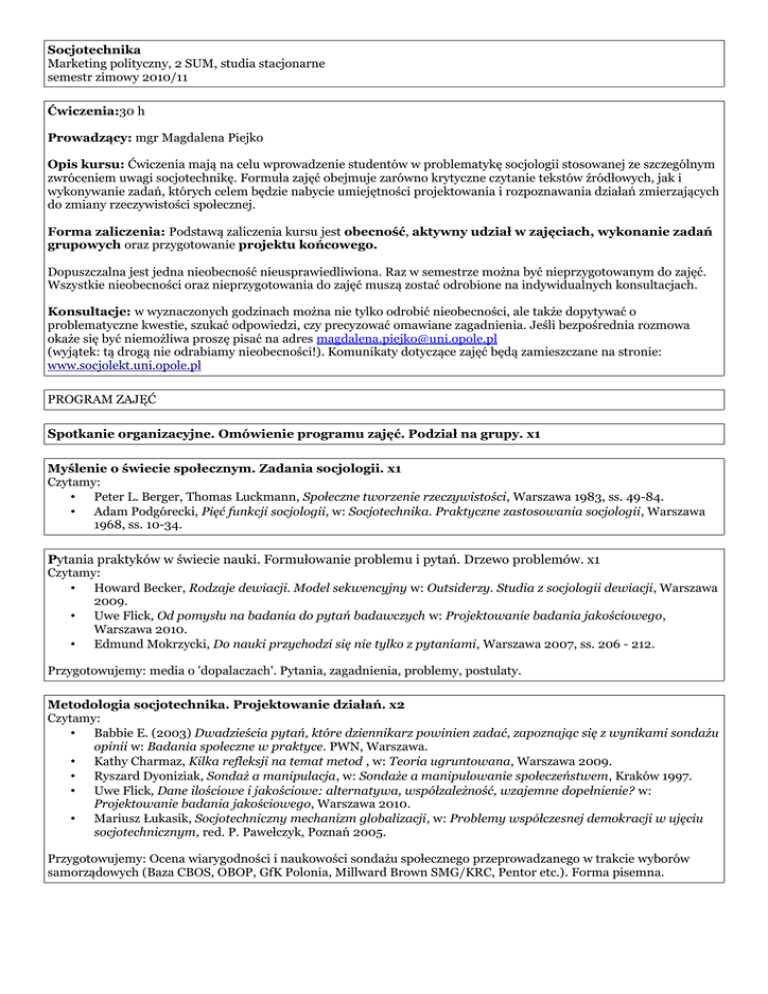 Socjotechnika Marketing polityczny, 2 SUM, studia stacjonarne semestr zimowy 2010/11 Ćwiczenia:30 h Prowadzący: mgr Magdalena Piejko Opis kursu: Ćwiczenia mają na celu wprowadzenie studentów w problematykę socjologii stosowanej ze szczególnym zwróceniem uwagi socjotechnikę. Formuła zajęć obejmuje zarówno krytyczne czytanie tekstów źródłowych, jak i wykonywanie zadań, których celem będzie nabycie umiejętności projektowania i rozpoznawania działań zmierzających do zmiany rzeczywistości społecznej. Forma zaliczenia: Podstawą zaliczenia kursu jest obecność, aktywny udział w zajęciach, wykonanie zadań grupowych oraz przygotowanie projektu końcowego. Dopuszczalna jest jedna nieobecność nieusprawiedliwiona. Raz w semestrze można być nieprzygotowanym do zajęć. Wszystkie nieobecności oraz nieprzygotowania do zajęć muszą zostać odrobione na indywidualnych konsultacjach. Konsultacje: w wyznaczonych godzinach można nie tylko odrobić nieobecności, ale także dopytywać o problematyczne kwestie, szukać odpowiedzi, czy precyzować omawiane zagadnienia. Jeśli bezpośrednia rozmowa okaże się być niemożliwa proszę pisać na adres [email protected] (wyjątek: tą drogą nie odrabiamy nieobecności!). Komunikaty dotyczące zajęć będą zamieszczane na stronie: www.socjolekt.uni.opole.pl PROGRAM ZAJĘĆ Spotkanie organizacyjne. Omówienie programu zajęć. Podział na grupy. x1 Myślenie o świecie społecznym. Zadania socjologii. x1 Czytamy: • Peter L. Berger, Thomas Luckmann, Społeczne tworzenie rzeczywistości, Warszawa 1983, ss. 49-84. • Adam Podgórecki, Pięć funkcji socjologii, w: Socjotechnika. Praktyczne zastosowania socjologii, Warszawa 1968, ss. 10-34. Pytania praktyków w świecie nauki. Formułowanie problemu i pytań. Drzewo problemów. x1 Czytamy: • Howard Becker, Rodzaje dewiacji. Model sekwencyjny w: Outsiderzy. Studia z socjologii dewiacji, Warszawa 2009. • Uwe Flick, Od pomysłu na badania do pytań badawczych w: Projektowanie badania jakościowego, Warszawa 2010. • Edmund Mokrzycki, Do nauki przychodzi się nie tylko z pytaniami, Warszawa 2007, ss. 206 - 212. Przygotowujemy: media o 'dopalaczach'. Pytania, zagadnienia, problemy, postulaty. Metodologia socjotechnika. Projektowanie działań. x2 Czytamy: • Babbie E. (2003) Dwadzieścia pytań, które dziennikarz powinien zadać, zapoznając się z wynikami sondażu opinii w: Badania społeczne w praktyce. PWN, Warszawa. • Kathy Charmaz, Kilka refleksji na temat metod , w: Teoria ugruntowana, Warszawa 2009. • Ryszard Dyoniziak, Sondaż a manipulacja, w: Sondaże a manipulowanie społeczeństwem, Kraków 1997. • Uwe Flick, Dane ilościowe i jakościowe: alternatywa, współzależność, wzajemne dopełnienie? w: Projektowanie badania jakościowego, Warszawa 2010. • Mariusz Łukasik, Socjotechniczny mechanizm globalizacji, w: Problemy współczesnej demokracji w ujęciu socjotechnicznym, red. P. Pawełczyk, Poznań 2005. Przygotowujemy: Ocena wiarygodności i naukowości sondażu społecznego przeprowadzanego w trakcie wyborów samorządowych (Baza CBOS, OBOP, GfK Polonia, Millward Brown SMG/KRC, Pentor etc.). Forma pisemna. Konstruowanie i rekonstruowanie porządku społecznego → socjalizacja. x1 Czytamy: • Peter L. Berger, Thomas Luckmann, Społeczne tworzenie rzeczywistości, Warszawa 1983, ss. 202-227. • Michel Foucault, Historia szaleństwa w dobie klasycyzmu, Warszawa 1987. • Piotr Pawełczyk, Procesy reprodukowania porządku społecznego w: Socjotechniczne aspekty gry politycznej, Poznań 2000, ss. 75-105. • Michał Wanke, To nie jest sport dla kobiet. Rekonstruowanie stereotypów dotyczących płci i sportu na blogach. Artykuł oddany do druku w publikacji pokonferencyjnej „Wojna płci. Czyli jak nie prowadzić dyskursu publicznego o kobietach i mężczyznach, Toruń 2008. Oddajemy: notatkę - identyfikacja problematycznego obszaru życia społecznego – temat projektu końcowego. Konstruowanie i rekonstruowanie porządku społecznego → mechanizmy psychotechniczne x2 Czytamy: • Monika Pabijańska, Metody i techniki perswazji i manipulacji w: Psychomanipulacja w polityce. Metody, techniki, przykłady, Wrocław 2007, ss. 40-56. • Yves Winkin, Antropologia komunikacji. Od teorii do badań terenowych, Warszawa 2007, ss. 105-149. Przygotowujemy: Tworzenie świata przez kandydata w wyborach samorządowych. Analiza przypadku. Prezentacja multimedialna. Konstruowanie i rekonstruowanie porządku społecznego → obraz jako narzędzie wytwarzania, odtwarzania i zmiany. x2 Czytamy: • Rafał Drozdowski, Estetyka błędów jako narzędzie przemocy ikonicznej, w: Sztuki wizualne jako nośniki ideologii, red. M. Lisiecki, Toruń 2009. • Rafał Drozdowski, Ikonosfera typu hand made, w: Obraza na obrazy. Strategie społecznego oporu wobec obrazów dominujących, Poznań 2006. • Urszula Jarecka, Narzędzia wojennej propagandy wizualnej, w: Propaganda wizualna słusznej wojny. Media wizualne XX wieku wobec konfliktów zbrojnych, Warszawa 2008. • Agnieszka Ogonowska, Przemoc ikoniczna a przemoc symboliczna, w: Przemoc ikoniczna. Zarys wykładu, Kraków 2004. • Gillian Rose, Interpretacja materiałów wizualnych. Krytyczna metodologia badań nad wizualnością, Warszawa 2010, ss. 19-47, 126-134, 233-254. • Allan Sekula, Demontaż modernizmu, ponowne odkrycie dokumentu (Notatki o polityce reprezentacji), w: Społeczne użycia fotografii, Warszawa 2010. Przygotowujemy: 1. Obrazy, które podtrzymują porządek społeczny – przykłady. 2. Komentarz do przypadku. Konstruowanie i rekonstruowanie porządku społecznego → język jako narzędzie władzy i manipulacji. x2 Czytamy: • Janusz Barański, Język jako symboliczne działanie, w: Socjotechnika – między magią a analogią, Kraków 2001. • Pierre Bourdieu, Debaty prawdziwie fałszywe i fałszywie prawdziwe, w: O telewizji. Panowanie dziennikarstwa, Warszawa 2009. • Michel Foucault, Porzą