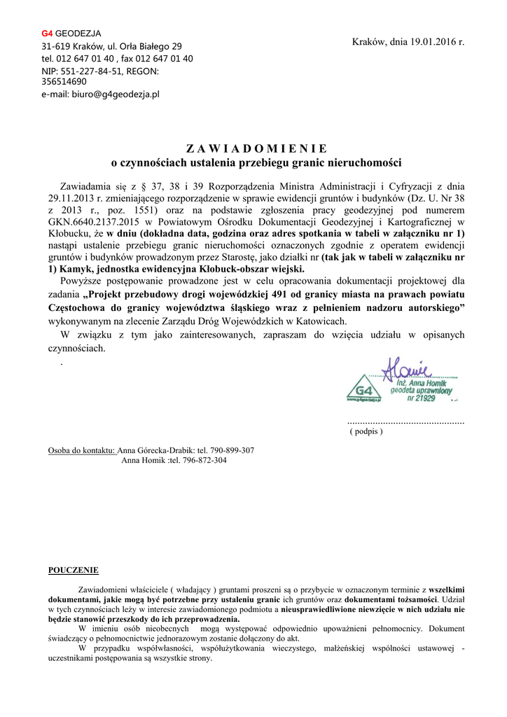 G4 GEODEZJA 31-619 Kraków, ul. Orła Białego 29 tel. 012 647 01 40 , fax 012 647 01 40 NIP: 551-227-84-51, REGON: 356514690 e-mail: [email protected] Kraków, dnia 19.01.2016 r. ZAWIADOMIENIE o czynnościach ustalenia przebiegu granic nieruchomości Zawiadamia się z § 37, 38 i 39 Rozporządzenia Ministra Administracji i Cyfryzacji z dnia 29.11.2013 r. zmieniającego rozporządzenie w sprawie ewidencji gruntów i budynków (Dz. U. Nr 38 z 2013 r., poz. 1551) oraz na podstawie zgłoszenia pracy geodezyjnej pod numerem GKN.6640.2137.2015 w Powiatowym Ośrodku Dokumentacji Geodezyjnej i Kartograficznej w Kłobucku, że w dniu (dokładna data, godzina oraz adres spotkania w tabeli w załączniku nr 1) nastąpi ustalenie przebiegu granic nieruchomości oznaczonych zgodnie z operatem ewidencji gruntów i budynków prowadzonym przez Starostę, jako działki nr (tak jak w tabeli w załączniku nr 1) Kamyk, jednostka ewidencyjna Kłobuck-obszar wiejski. Powyższe postępowanie prowadzone jest w celu opracowania dokumentacji projektowej dla zadania „Projekt przebudowy drogi wojewódzkiej 491 od granicy miasta na prawach powiatu Częstochowa do granicy województwa śląskiego wraz z pełnieniem nadzoru autorskiego” wykonywanym na zlecenie Zarządu Dróg Wojewódzkich w Katowicach. W związku z tym jako zainteresowanych, zapraszam do wzięcia udziału w opisanych czynnościach. . .............................................. ( podpis ) Osoba do kontaktu: Anna Górecka-Drabik: tel. 790-899-307 Anna Homik :tel. 796-872-304 POUCZENIE Zawiadomieni właściciele ( władający ) gruntami proszeni są o przybycie w oznaczonym terminie z wszelkimi dokumentami, jakie mogą być potrzebne przy ustaleniu granic ich gruntów oraz dokumentami tożsamości. Udział w tych czynnościach leży w interesie zawiadomionego podmiotu a nieusprawiedliwione niewzięcie w nich udziału nie będzie stanowić przeszkody do ich przeprowadzenia. W imieniu osób nieobecnych mogą występować odpowiednio upoważnieni pełnomocnicy. Dokument świadczący o pełnomocnictwie jednorazowym zostanie dołączony do akt. W przypadku współwłasności, współużytkowania wieczystego, małżeńskiej wspólności ustawowej uczestnikami postępowania są wszystkie strony.
