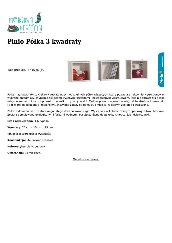 Pinio Półka 3 kwadraty Kod produktu PN15_07_99 Półka trzy kwadraty to ciekawy zestaw trzech oddzielnych półek wiszących, który pozwala atrakcyjnie wyeksponować wybrane przedmioty. Wyróżnia się geometrycznymi kształtami i nowoczesnym wzornictwem. Idealnie sprawdzi się jako miejsce na ramki ze zdjęciami, maskotki czy książeczki. Można przechowywać w niej także drobne kosmetyki i akcesoria do pielęgnacji maleństwa. Wszystko zależy od pomysłu i miejsca, w którym zostanie powieszona. Półka wykonana jest z naturalnego, litego drewna sosnowego. Występuje w kolorach białym, perłowym (waniliowym). Została pomalowana ekologicznymi farbami wodnymi. Pasuje zarówno do pokoiku chłopca, jak i dziewczynki. Czas oczekiwania: 4-6 tygodni. Wymiary: 25 cm x 15 cm x 25 cm (długość x szerokość x wysokość) Konstrukcja: lite drewno sosnowe. Kolorystyka: biały, perłowy. Gwarancja: 24 miesiące. Mebel zmontowany.