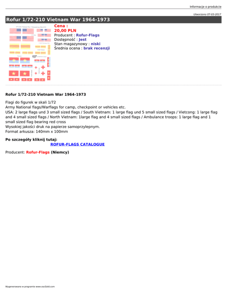 Informacje o produkcie Utworzono 07-03-2017 Rofur 1/72-210 Vietnam War 1964-1973 Cena : 20,00 PLN Producent : Rofur-Flags Dostępność : Jest Stan magazynowy : niski Średnia ocena : brak recenzji Rofur 1/72-210 Vietnam War 1964-1973 Flagi do figurek w skali 1/72 Army National flags/Warflags for camp, checkpoint or vehicles etc. USA: 2 large flags und 3 small sized flags / South Vietnam: 1 large flag und 5 small sized flags / Vietcong: 1 large flag and 4 small sized flags / North Vietnam: 1large flag and 4 small sized flags / Ambulance troops: 1 large flag and 1 small sized flag bearing red cross Wysokiej jakości druk na papierze samoprzylepnym. Format arkusza: 140mm x 100mm Po szczegóły kliknij tutaj: ROFUR-FLAGS CATALOGUE Producent: Rofur-Flags (Niemcy) Wygenerowano w programie www.oscGold.com Ważne informacje: Prosimy o dokładne zapoznanie się z zasadami działania naszego sklepu. To bardzo ważne i pozwoli na uniknięcie nieporozumień związanych z koniecznością oczekiwania na przesyłkę. Wszystkie zamówienia realizujemy w kolejności zgłoszeń. Wybranie "przesyłka priorytetowa" jako sposobu wysyłki nie oznacza, że paczka zostanie wysłana na drugi dzień. To tylko rodzaj usługi pocztowej.