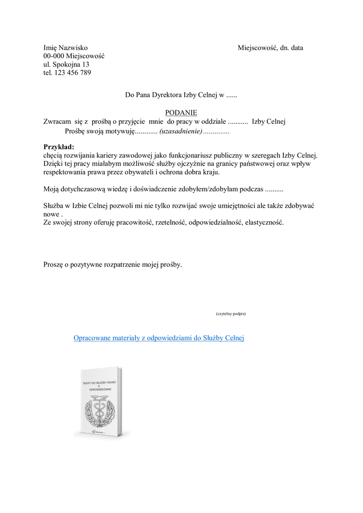 Imię Nazwisko 00-000 Miejscowość ul. Spokojna 13 tel. 123 456 789 Miejscowość, dn. data Do Pana Dyrektora Izby Celnej w ...... PODANIE Zwracam się z prośbą o przyjęcie mnie do pracy w oddziale ........... Izby Celnej Prośbę swoją motywuję............ (uzasadnienie) .............. Przykład: chęcią rozwijania kariery zawodowej jako funkcjonariusz publiczny w szeregach Izby Celnej. Dzięki tej pracy miałabym możliwość służby ojczyźnie na granicy państwowej oraz wpływ respektowania prawa przez obywateli i ochrona dobra kraju. Moją dotychczasową wiedzę i doświadczenie zdobyłem/zdobyłam podczas .......... Służba w Izbie Celnej pozwoli mi nie tylko rozwijać swoje umiejętności ale także zdobywać nowe . Ze swojej strony oferuję pracowitość, rzetelność, odpowiedzialność, elastyczność. Proszę o pozytywne rozpatrzenie mojej prośby. (czytelny podpis) Opracowane materiały z odpowiedziami do Służby Celnej