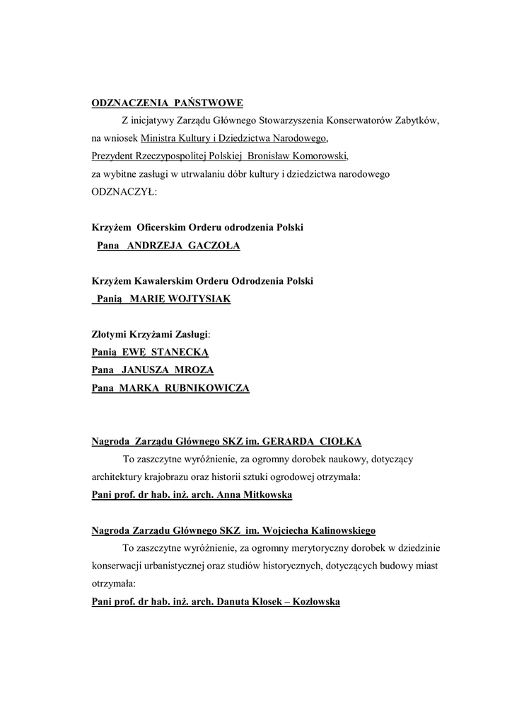 ODZNACZENIA PAŃSTWOWE Z inicjatywy Zarządu Głównego Stowarzyszenia Konserwatorów Zabytków, na wniosek Ministra Kultury i Dziedzictwa Narodowego, Prezydent Rzeczypospolitej Polskiej Bronisław Komorowski, za wybitne zasługi w utrwalaniu dóbr kultury i dziedzictwa narodowego ODZNACZYŁ: Krzyżem Oficerskim Orderu odrodzenia Polski Pana ANDRZEJA GACZOŁA Krzyżem Kawalerskim Orderu Odrodzenia Polski Panią MARIĘ WOJTYSIAK Złotymi Krzyżami Zasługi: Panią EWĘ STANECKĄ Pana JANUSZA MROZA Pana MARKA RUBNIKOWICZA Nagroda Zarządu Głównego SKZ im. GERARDA CIOŁKA To zaszczytne wyróżnienie, za ogromny dorobek naukowy, dotyczący architektury krajobrazu oraz historii sztuki ogrodowej otrzymała: Pani prof. dr hab. inż. arch. Anna Mitkowska Nagroda Zarządu Głównego SKZ im. Wojciecha Kalinowskiego To zaszczytne wyróżnienie, za ogromny merytoryczny dorobek w dziedzinie konserwacji urbanistycznej oraz studiów historycznych, dotyczących budowy miast otrzymała: Pani prof. dr hab. inż. arch. Danuta Kłosek – Kozłowska Nagroda Zarządu Głównego SKZ im. HANNY PIEŃKOWSKIEJ I JERZEGO ŁOMNICKIEGO W tym roku te zaszczytne wyróżnienia otrzymali: Pan Andrzej Kubik Pani Ewa Stanecka Nagroda Zarządu Głównego SKZ za wyróżniające się publikacje W tym roku, to zaszczytne wyróżnienie otrzymała: Pani Grażyna Schulze – Głazik - za piękną książkę zatytułowaną “Malowidło Philipa Christiana Bentuma z początku XVIII wieku w bibliotece pocysterskiego klasztoru w Lubiążu. Problemy konserwacji – restauracji monumentalnych, barokowych malowideł na podłożu gipsowym”. Wydawnictwo Akademii Sztuk Pięknych im. Jana Matejki w Krakowie. 2014. MEDALE ZASŁUŻONY KULTURZE „GLORIA ARTIS” Na wniosek Zarządu Głównego Stowarzyszenia Konserwatorów zabytków, w uznaniu szczególnych zasług w ochronie dziedzictwa kulturowego, Pani Małgorzata Omilanowska – Minister Kultury i Dziedzictwa Narodowego, Przyznała: Srebrne Medale Zasłużony Kulturze „Gloria Artis” Panu GRZEGORZOWI GRAJEWSKIEMU Panu ZBIGNIEWOWI MYCZKOWSKIEMU Brązowe Medale otrzymali: Pani ANNA FORTUNA – MAREK Pan TOMASZ BŁYSKOSZ Pan ANDRZEJ SIWEK Złotą Odznakę ZA OPIEKĘ NAD ZABYTKAMI Otrzymali: Pani DOMINIKA KUŚNIERZ-KRUPA Pan JACEK CZAJKA Złote Odznaki Stowarzyszenia Konserwatorów Zabytków Zarząd Główny Stowarzyszenia Konserwatorów Zabytków, doceniając wieloletnią, aktywną działalność w naszym Stowarzyszeniu, przyznał Złote Odznaki SKZ wyróżniającym się KOLEŻANKOM I KOLEGOM: Złote Odznaki SKZ otrzymali: 1. Pani Olga KULESZA – SZERNIEWICZ 2. Pan Marek KĘDZIERSKI 3. Pan Zbigniew NAWROCKI 4. Pan Janusz NEKANDA – TREPKA 5. Pan Emanuel OKOŃ 6. Pan Mieczysław SOCZYŃSKI 7. Pani Elżbieta WELTER KONKURS Generalnego Konserwatora Zabytków oraz Stowarzyszenia Konserwatorów Zabytków na najlepsze prace studialne, naukowe oraz popularyzatorskie dotyczące ochrony zabytków i muzealnictwa. W konkursie mogą brać udział wyłącznie kandydaci nie będący samodzielnymi pracownikami naukowymi. Środki finansowe na organizacje Konkursu oraz nagrody i wyróżnienia, przyznawane są przez Ministra Kultury i Dziedzictwa Narodowego. Nadesłane prace oceniane są przez Komisję powołaną przez Generalnego Konserwatora Zabytków. Każda praca recenzowana jest przez specjalistów SKZ.Z satysfakcją należy odnotować, że konkurs ten cieszą się dużym powodzeniem i prestiżem, a nadsyłane prace mają coraz wyższy poziom naukowy. Na tegoroczny Konkurs nadesłano 30 prac. W wyniku sporządzonych recenzji oraz przeprowadzonej szerokiej dyskusji, Kapituła przyznała 5 nagród i 10 wyróżnień Nagrody w wysokości 4.000 - zł otrzymali autorzy następujących prac: 1. Dominika Kuśnierz – Krupa - Jaśliska w średniowieczu na tle miast dawnego powiatu bieckiego. Wydawnictwo Politechniki Krakowskiej, Kraków 2013 2. Wojciech Wółkowski – Zamek biskupów warmińskich w Lidzbarku Warmińskim - dzieje budowlane, kontest architektoniczny i problemy konserwatorskie. Rozprawa doktorska. Promotor: prof. nzw dr hab.inż. arch. Małgorzata Rozbicka 3. Oskar Hanusek – Konserwacja sztuki współczesnej w kontekście zapisków artysty na przykładzie problemu pracy Marii Pnińskiej - Bereś “Łąka twego ciała”. Praca magisterska. Promotor prof. Grażyna Korpal. 4. Sylwia Popławska - Problematyka konserwacji artystycznego zielnika i papeterii autorstwa Elizy Orzeszkowej podarowanych Leopoldowi Meyetowi, przechowywanych w Muzeum Narodowym w Warszawie ( część praktyczna) Gdy suszone rośliny stają się zabytkiem. Historia, technologia, problemy konserwacji i przechowywania zielników (praca magisterska teoretyczna). Promotor dr Izabela Zając. 5. Anna Selerowicz - Multikryterialne studium badawcze dwóch portretów kobiecych: “Portretu kobiety w kryzie” oraz “Portretu drugiej żony Sebastiana Leerse” przypisywanych Antonowi van Dyck'owi wraz z zagadnieniami konserwacji – restauracji “Portretu kobiety w kryzie” ( ze zbiorów Muzeum Narodowego w Gdańsku). Praca magisterska praktyczna. Promotor prof. dr hab. Iwona Szmelter Wybrane techniki analityczne stosowane przy ocenie autentyczności dzieł sztuki. Praca magisterska teoretyczna. Promotor: prof. dr hab. Iwona Szmelter, dr inż. Joanna Kurkowska. Wyróżnienia w wysokości 2,000 -zł otrzymali autorzy następujących prac: 1. Monika Mainka – Próba rekonstrukcji zabytkowego mostu żeliwnego w Łażanach. Praca magisterska napisana pod kierunkiem dr. inż. Przemysława Jakiela. 2. Żaneta Popławska & Paulina Smyk - “Genius loci” cysterskiego sacrum – koncepcja zagospodarowania terenu przy opactwie w Wąchocku. Praca magisterska wykonana pod kierunkiem dr hab. Małgorzaty Mileckiej 3. Leszek Włochyński – Rewitalizacja zabytkowych zespołów rezydencjonalnych w aspekcie uwarunkowań ekonomicznych i praktyki konserwatorskiej współczesnej Polski. Praca dyplomowa magisterska. Promotor prof. nzw dr ha