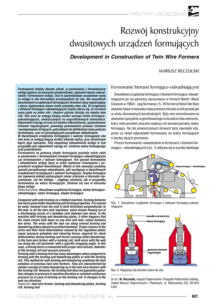 MASZYNY I URZĄDZENIA Rozwój konstrukcyjny dwusitowych urządzeń formujących Development in Construction of Twin Wire Formers MARIUSZ RECZULSKI Formowanie między dwoma sitami, w porównaniu z formowaniem wstęgi papieru na maszynie płaskositowej, zapewnia lepsze odwodnienie i formowanie wstęgi. Jest to spowodowane usuwaniem wody ze wstęgi w obu kierunkach prostopadłych do niej. We wszystkich dwusitowych urządzeniach formujących strumień masy wypływający z dyszy wypływowej wlewu trafia pomiędzy dwa sita. W urządzeniu z listwami formująco-odwadniającymi często zdarza się, że strumień masy pada na jedno sito i dopiero później dostaje się między dwa sita. Sita wraz ze wstęgą biegną wzdłuż szeregu listew formującoodwadniających, umieszczonych na wyprofilowanych elementach. Odpowiedni naciąg sit oraz ich lokalne odkształcenia, spowodowane listwami regulacyjnymi, powodują powstawanie pulsacji ciśnienia i występowanie sił tnących, potrzebnych do deflokulacji masy podczas formowania, oraz sił powodujących początkowe odwadnianie. W dwusitowym urządzeniu formującym z walcem formującym oba sita wraz ze wstęgą biegną wzdłuż obwodu walca, przy określonym kącie jego opasania. Siłą napędową odwadniania wstęgi w tym przypadku jest odpowiedni naciąg sit, średnica walca formującego oraz podciśnienie. Formowanie za pomocą stopki formującej posiada wiele zalet w porównaniu z formowaniem listwami formująco-odwadniającymi czy formowaniem z walcem formującym. Ten sposób formowania i odwadniania wstęgi łączy w sobie najlepsze rozwiązania z poprzednich urządzeń dwusitowych. Można w nim zauważyć podobny sposób początkowego odwadniania, jaki występuje w dwusitowych urządzeniach formujących z walcem formującym. Stopka formująca nie zapewnia jednak pulsacyjnych zmian ciśnienia w kierunku maszynowym, czy też stałego – ciągłego ciśnienia, jak w przypadku formowania na walcu formującym. Zmienia się ono w kierunku biegu wstęgi. Słowa kluczowe: dwusitowe urządzenia formujące, listwy formującoodwadniające, walec formujący, stopka formująca Compared with web forming on a flatbed machine, forming between two wires gives better dewatering and forming properties. It is caused by water removal from the web in both directions perpendicular to the web. In all the twin wire machines, stock stream flowing out of a discharging nozzle of a headbox runs between two wires. In the machine with forming and dewatering plates, it often happens that the stock stream falls down on one wire and later comes between two wires. The wires with the web run along several forming and dewatering plates placed on profiled elements. Proper tension of the wires and their local deformations caused by the regulation plates cause pressure pulsation and shearing forces required for stock defloculation during forming and forces causing initial dewatering. In the twin wire former with a forming roll, both wires with the web run along the roll perimeter with a specific wrapping angle. In this case, a driving force is connected with proper wire tension, diameter of the forming roll and vacuum pressure. Forming with a forming foot has many advantages when compared to forming with the forming and dewatering plates or with the forming roll. This method for web forming and dewatering combines the best solutions of previous twin wire formers. They are characterized by similar concept of initial dewatering as in the twin wire formers with the forming roll. However, the forming foot does not guarantee pulsation changes in pressure in machine direction or constant continuous pressure as in case of forming on the forming roll. It changes in the web run direction. Keywords: twin wire former, forming and dewatering plates, forming roll, forming foot Formowanie listwami formująco-odwadniającymi Dwusitowe urządzenia formujące z listwami formująco-odwadniającymi po raz pierwszy opracowano w firmach Beloit i Black Clawson w 1960 r. (wg Normana) (1). W formerze Beloit Bel Baie ułożenie listew w kierunku maszynowym nie było w linii prostej jak w wielu stosowanych konstrukcjach. Były one zamontowane na obwodzie specjalnie wyprofilowanego w kształcie łuku elementu, który miał promień znacznie większy niż konwencjonalny walec formujący. Na tak umieszczonych listwach były zawinięte sita, przez co układ odpowiadał formowaniu na walcu formującym o bardzo dużym promieniu. Proces formowania i odwadniania w formerach z listwami formująco – odwadniającymi (rys. 1) odbywa się w wyniku lokalnego Rys. 1. Dwusitowe urządzenie formujące z listwami formująco-odwadniającymi Rys. 2. Regulacja siły docisku listew do sita Dr inż. M. Reczulski, Instytut Papiernictwa i Poligrafii Politechniki Łódzkiej, Zakład Maszyn Papierniczych i Płytowych, ul. Wólczańska 223, 90-924 Łódź PRZEGLĄD PAPIERNICZY · 68 · PAŹDZIERNIK 2012 601 MASZYNY I URZĄDZENIA odkształcenie listew regulacyjnych (formujących) w kierunku prostopadłym do kierunku biegu wstęgi i wstępnego napięcia sit (około 5-10 kN/m) (2). Regulacja siły docisku listew do sita odbywa się za pomocą układu pneumatycznego (rys. 2). Kąt pochylenia obu sit względem siebie, w dwusitowych urządzeniach formujących z listwami formująco-odwadniającymi, jest nieduży i zdarza się, że strumień masy z dyszy wypływowej wlewu pada na jedno sito i dopiero później wchodzi pomiędzy sita, co wpływa negatywnie na jakość formowanej wstęgi. W zależności od konstrukcji dwusitowych urządzeń formujących, listwy formująco-odwadniające mogą być umieszczone naprzeciw siebie (rys. 3) lub naprzeciw siebie przemiennie (rys. 4). Formowanie wstęgi za pomocą listew umieszczonych naprzeciw siebie uważa się za gorsze w porównaniu z konstrukcją z listwami umieszczonymi naprzeciw siebie przemiennie, ponieważ pogarsza jakość formowanej wstęgi i powoduje problemy z jej odwadnianiem (2). pęczków 