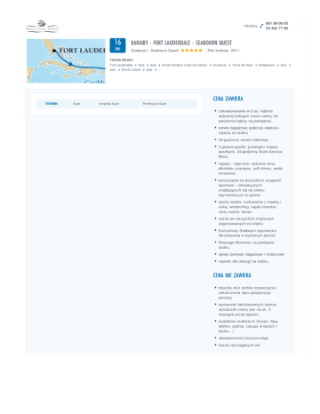 801 08 08 03 22 492 77 90 Infolinia 16 KARAIBY - FORT LAUDERDALE - SEABOURN QUEST DNI Seabourn - Seabourn Quest | Rok budowy: 2011 TRASA REJSU: Fort Lauderdale dzie TERMIN Suite Veranda Suite dzie Devil's Island dzie dzie Great Harbour (Jost van Dyke) Gustavia Terre-de-Haut Bridgetown dzie ... Penthouse Suite CENA ZAWIERA zakwaterowanie w 2-os. kabinie wybranej kategorii (cena zależy od położenia kabiny na pokładzie) serwis bagażowy podczas wejścia i zejścia ze statku 24-godzinny serwis kabinowy 3 główne posiłki, przekąski między posiłkami, 24-godzinny Suite Service Menu napoje – open bar: wybrane wina, alkohole, szampan, soft drinks, woda mineralna korzystanie ze wszystkich urządzeń sportowo – rekreacyjnych znajdujących się na statku (wymienionych w opisie) sporty wodne: nurkowanie z maską i rurką, windsurfing, kajaki morskie, narty wodne, banan udział we wszystkich imprezach organizowanych na statku Exclusively Seabourn (wycieczka fakultatywna w wybranym porcie) Massage Moments na pokładzie statku opłaty portowe, bagażowe i miejscowe napiwki dla obsługi na statku. CENA NIE ZAWIERA dojazdu do/z portów rozpoczęcia i zakończenia rejsu (propozycja poniżej) wycieczek fakultatywnych (wykaz wycieczek znany jest na ok. 3 miesiące przed rejsem) wydatków osobistych (fryzjer, Spa, telefon, pralnia, zakupy w barach i butiku...) ubezpieczenia turystycznego kosztu wymaganych wiz.